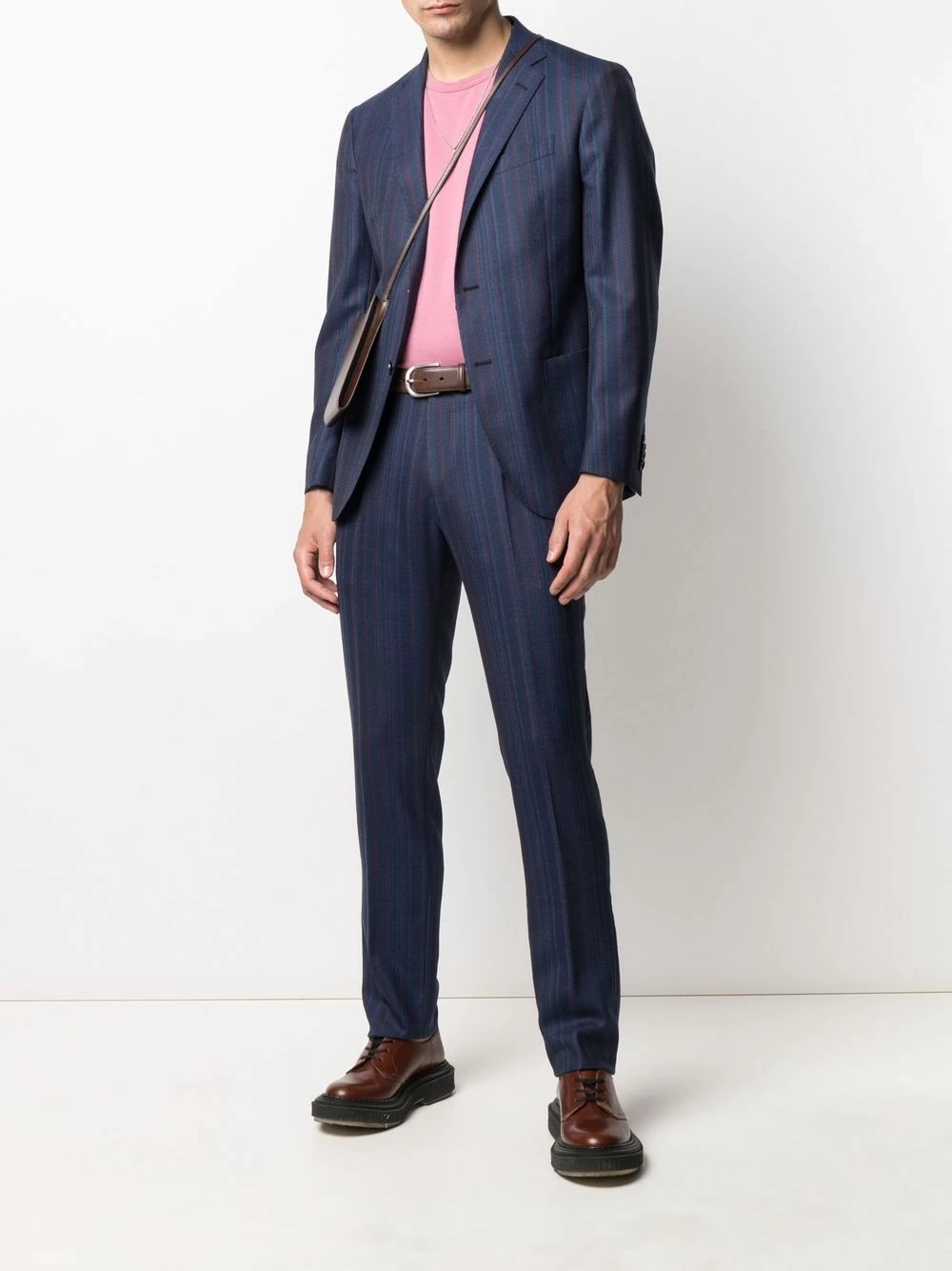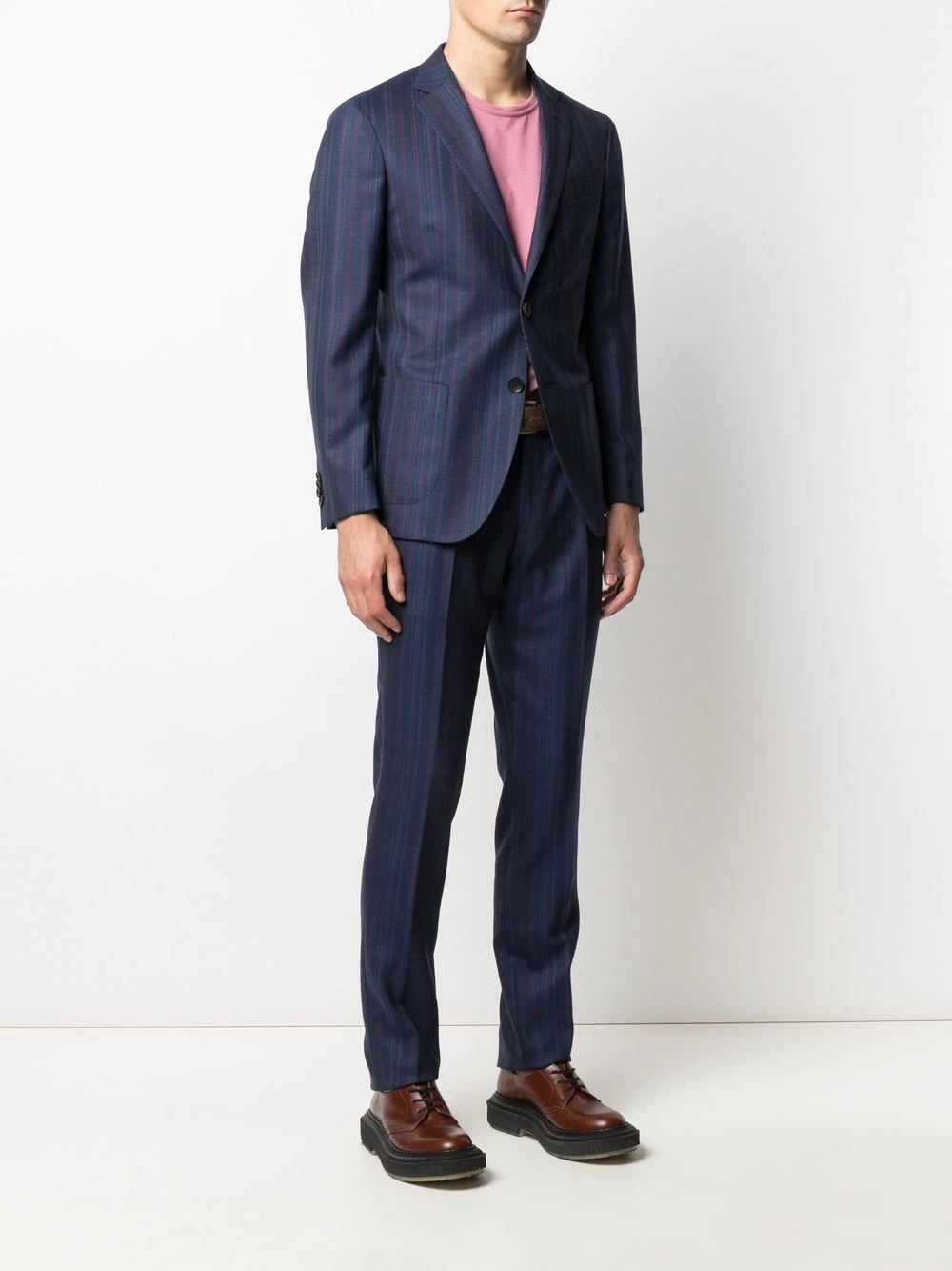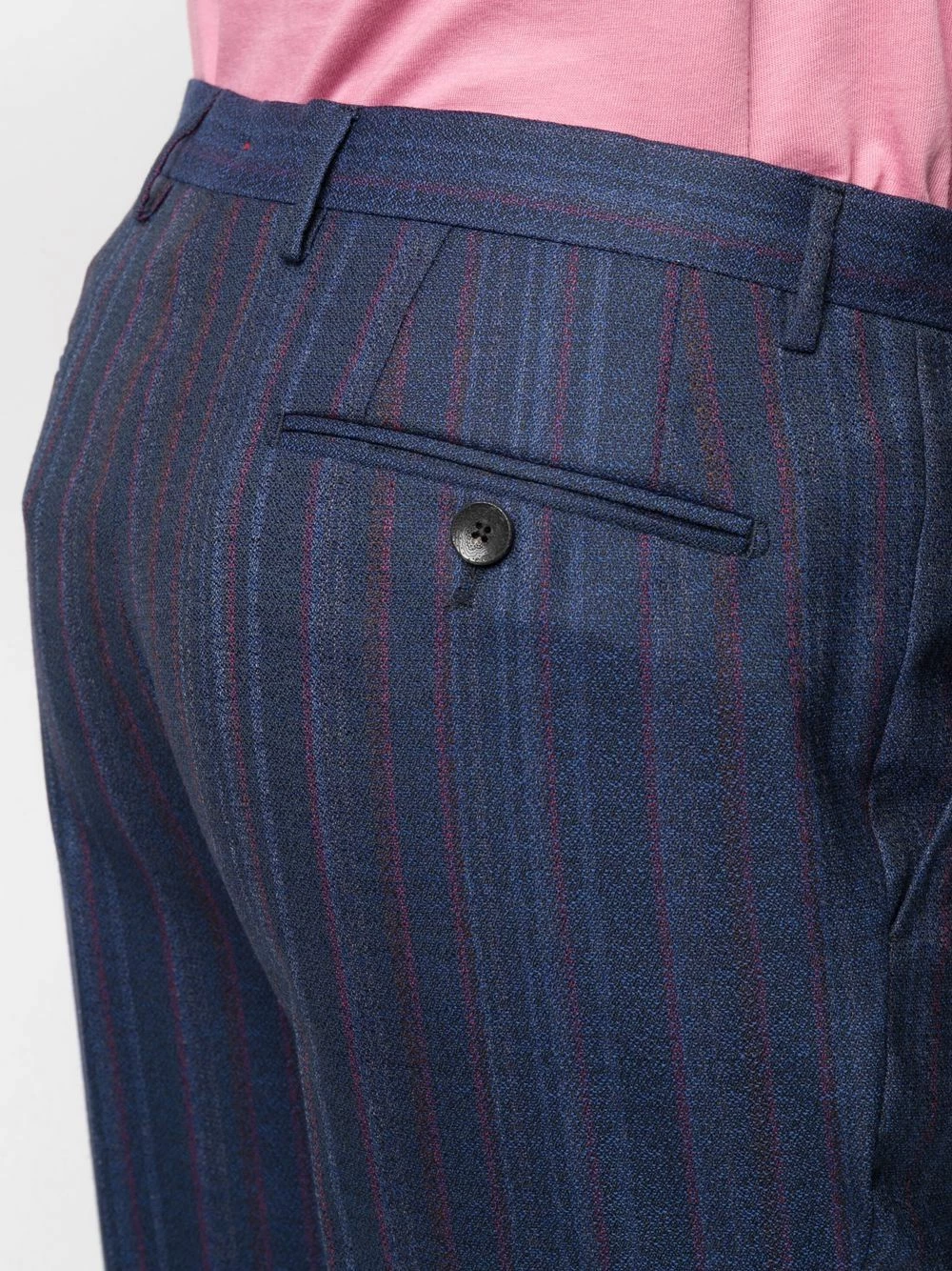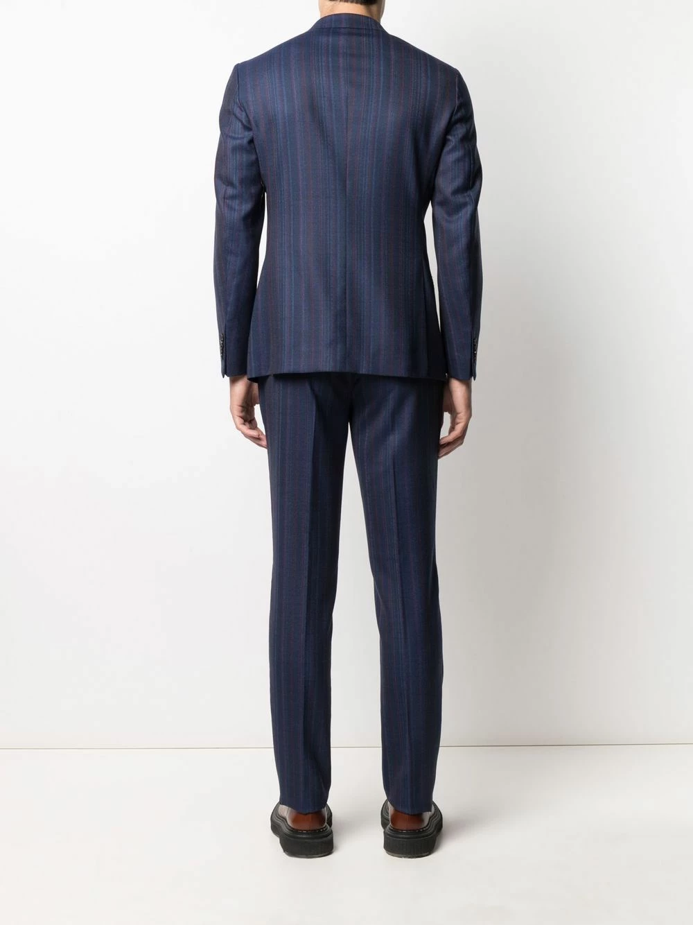Fines rayures, motif cachemire, revers classiques, boutonnière sur le devant, manches longues, poche passepoilée sur la poitrine, deux poches plaquées avant, passants de ceinture, fermeture à zip et boutons sur le devant, poches latérales fendues, poches arrière passepoilées. Couleur : bleu. Matière : laine.