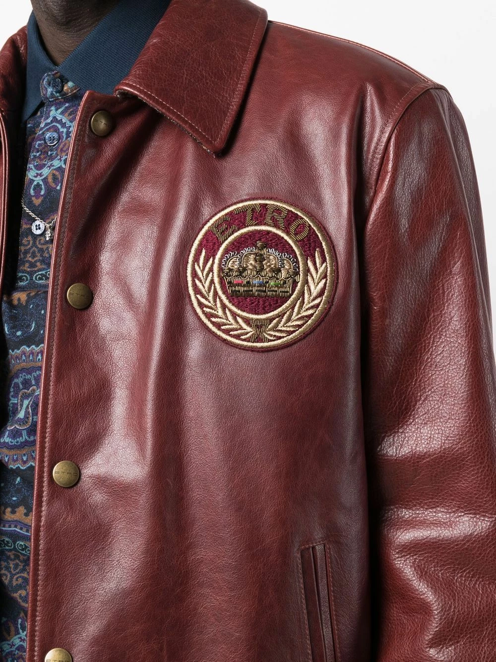 Patch logo sur le devant, col classique, fermeture à bouton pression, manches longues, poignets à boutons pression, deux poches latérales fendues. Matière : cuir de veau.
