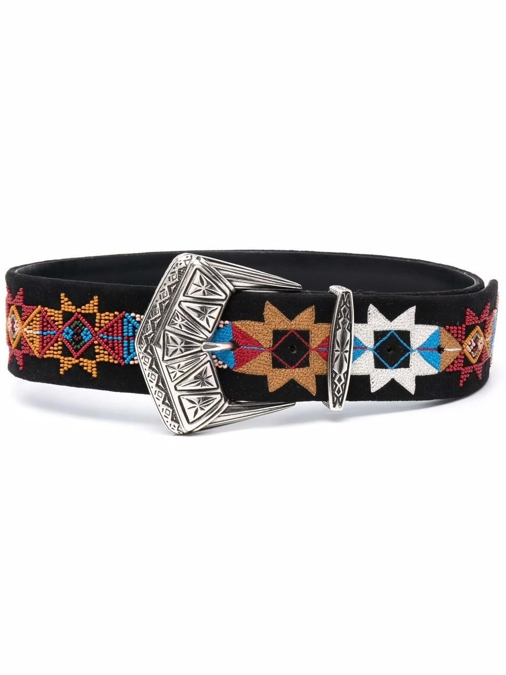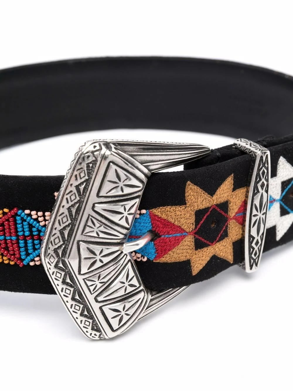 Ornements en perles brodées, finitions gravées, fermeture à boucle argentée, taille ajustable. Matière : cuir de veau.