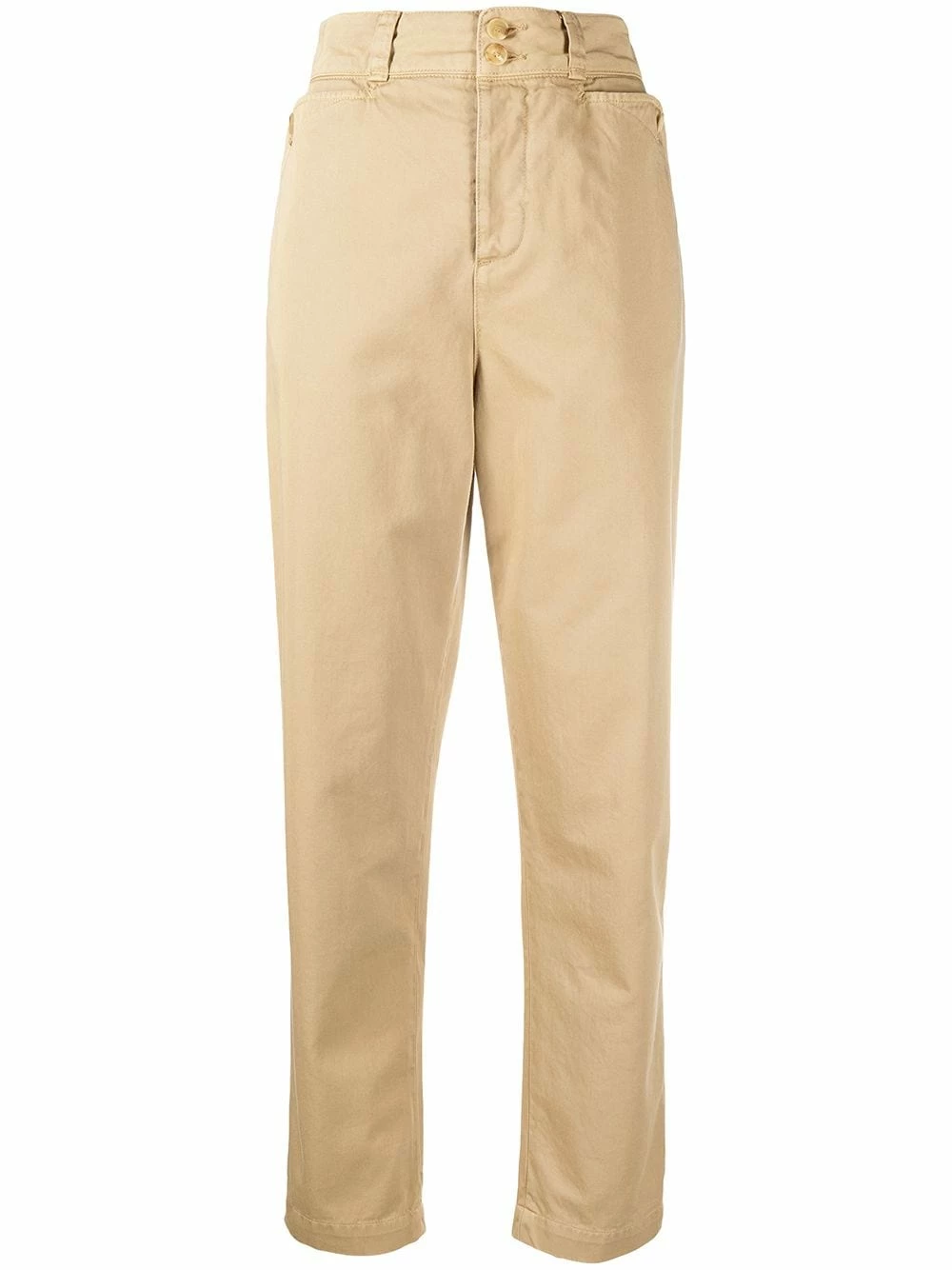 Taille haute, passants de ceinture, finitions à boucle décorative, boutons décoratifs, fermeture à zip et boutons sur le devant, poches latérales fendues, poches arrière passepoilées, coupe droite, hauteur cheville. Matière : coton.