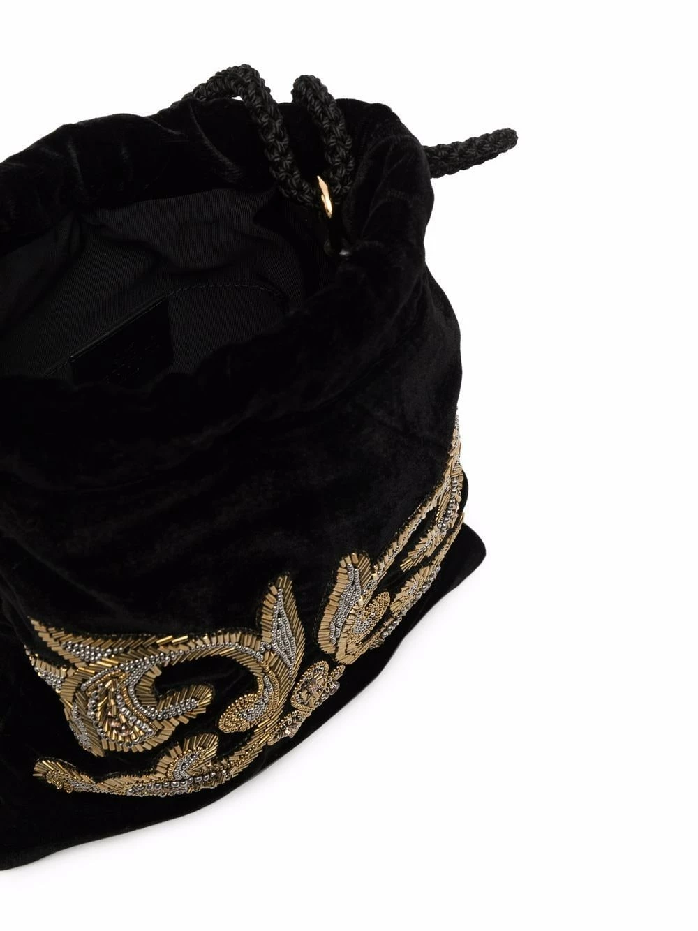Détails de perles brodées, lien de resserrage, poche intérieure.