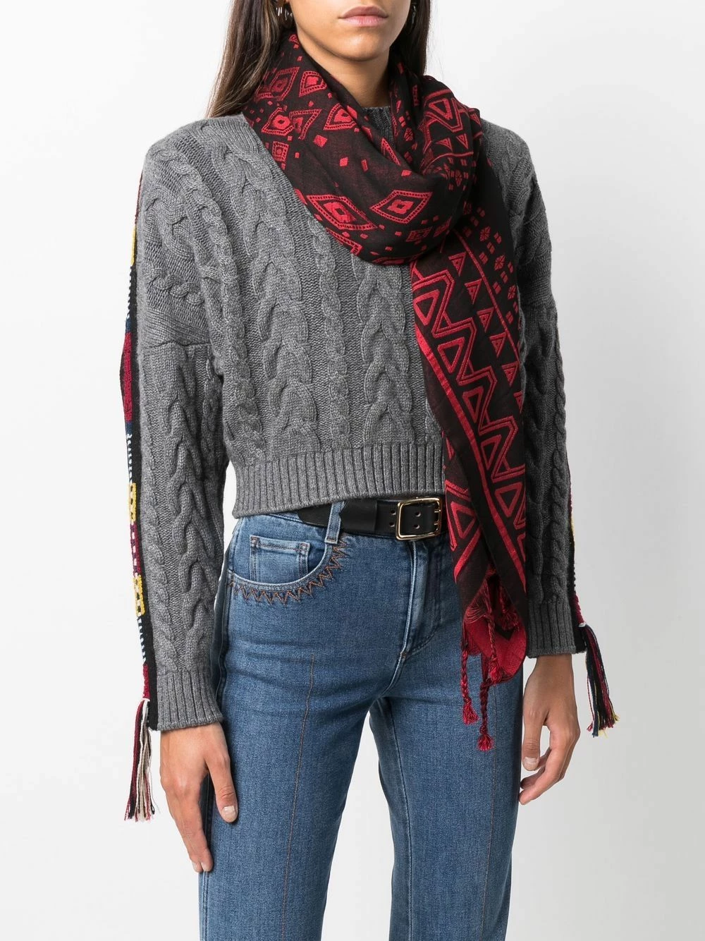 Structure légère, motif jacquard, finition à franges, coupe longue.
