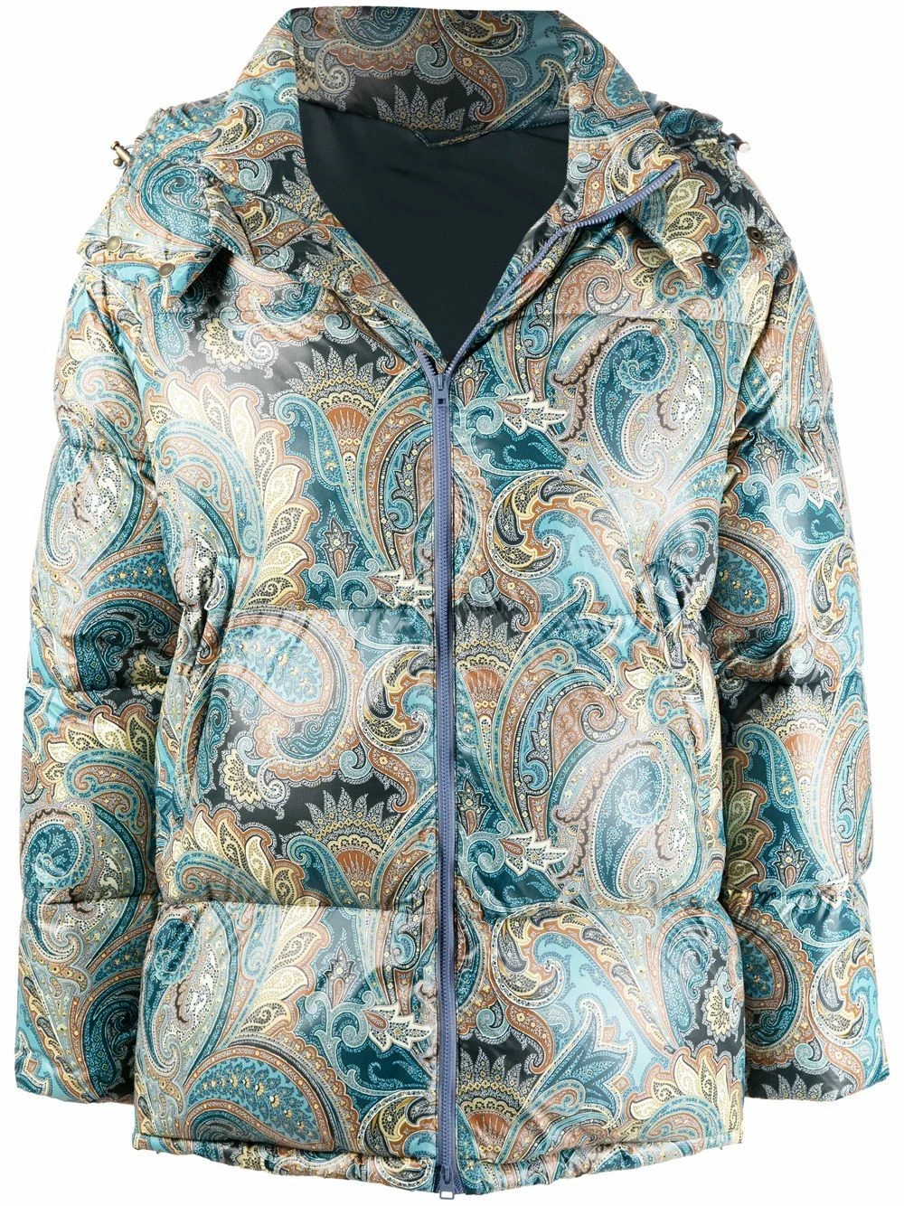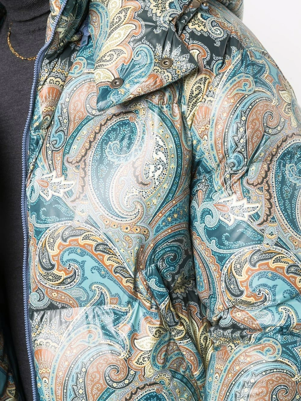 Motif cachemire, garnissage en duvet, capuche classique, manches longues.