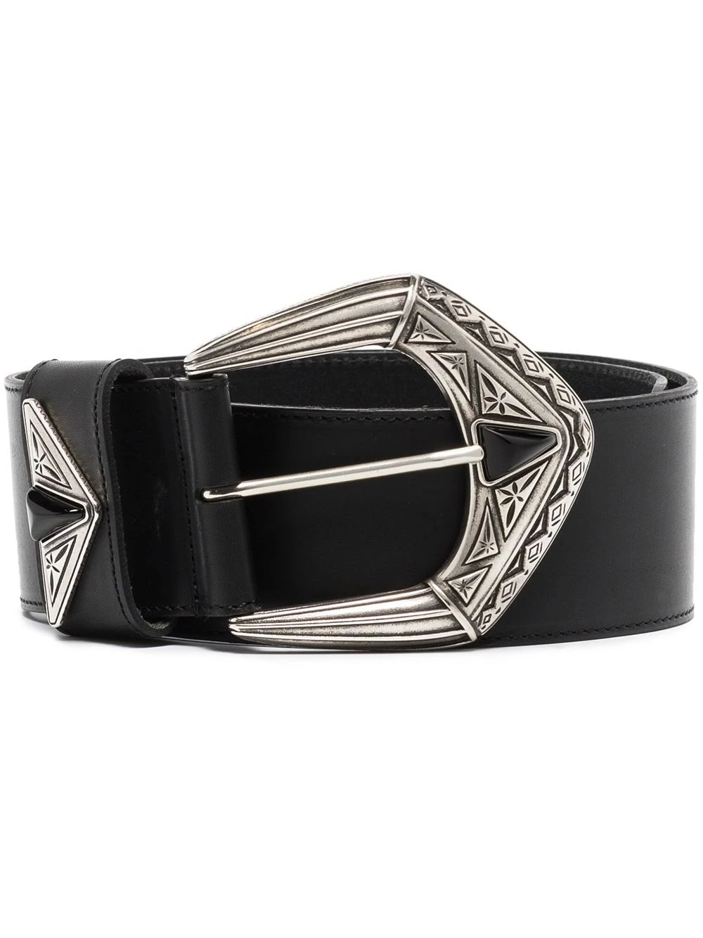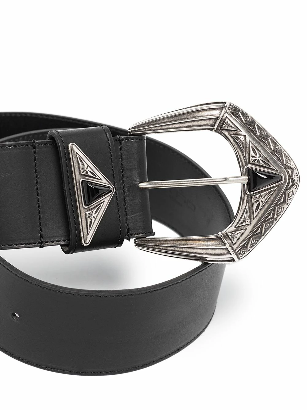 Ornements argentés, fermeture à boucle sur le devant, trous percés. Couleur : noir. Matière : cuir.