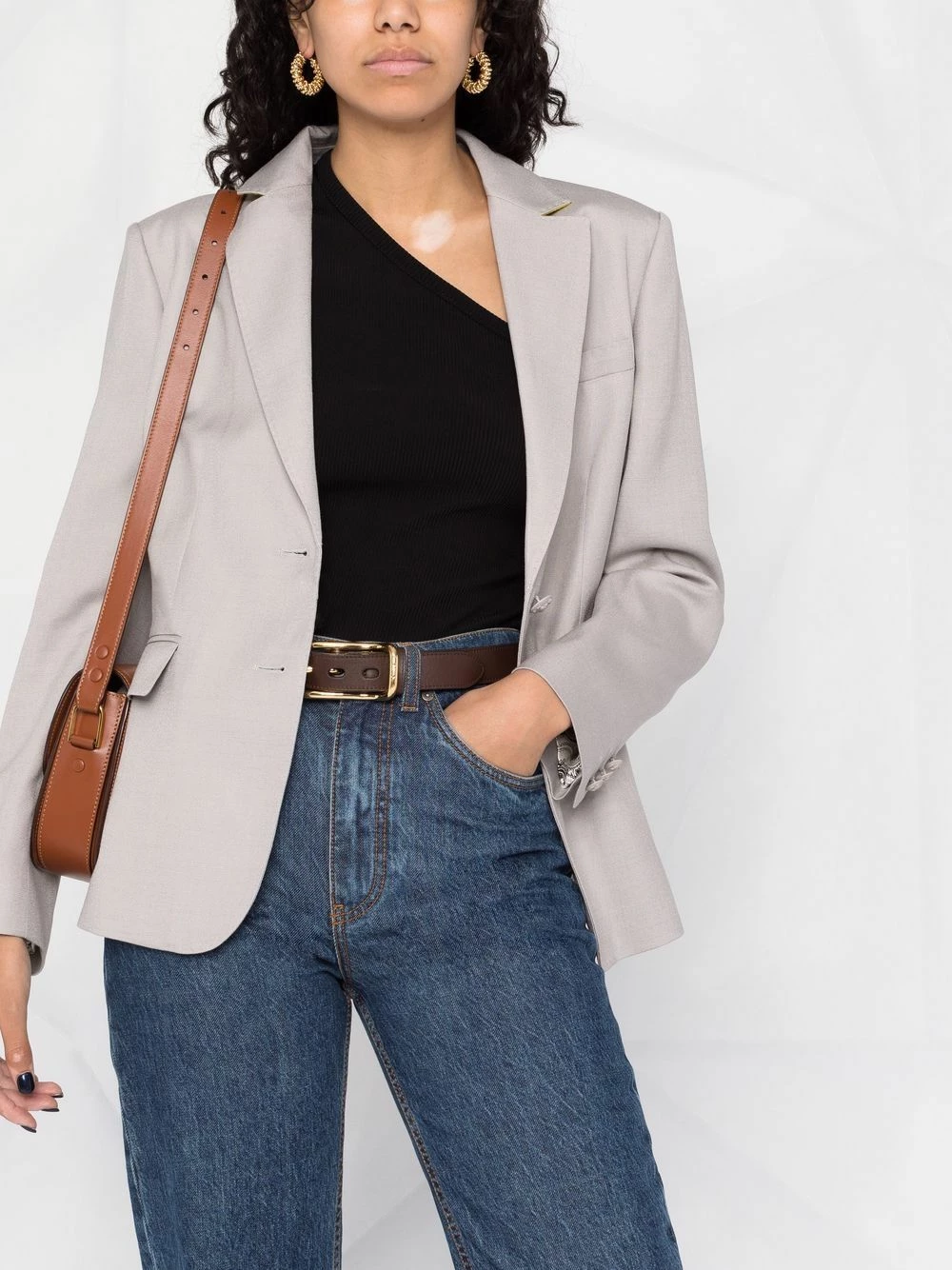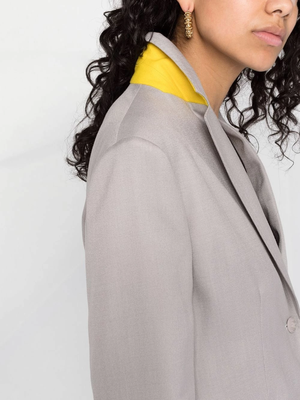 Revers crantés, empiècements contrastants, poche passepoilée sur la poitrine, boutonnière sur le devant, manches longues, poignets boutonnés, deux poches latérales à rabat. Couleur : gris.