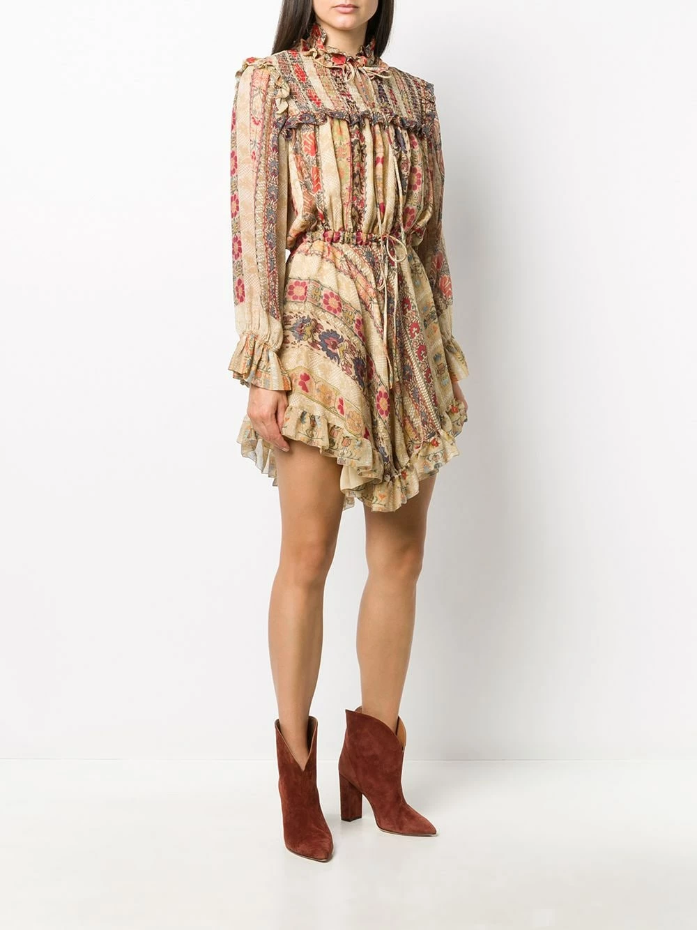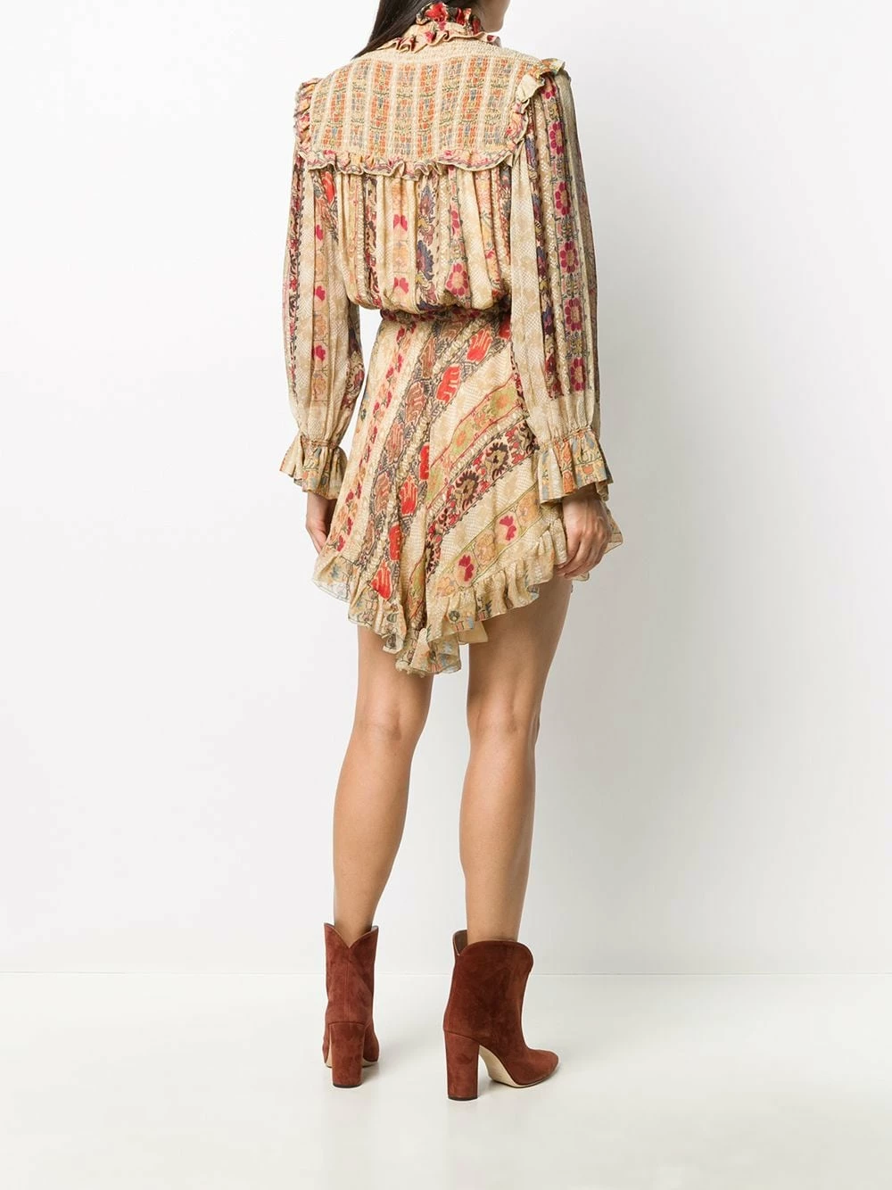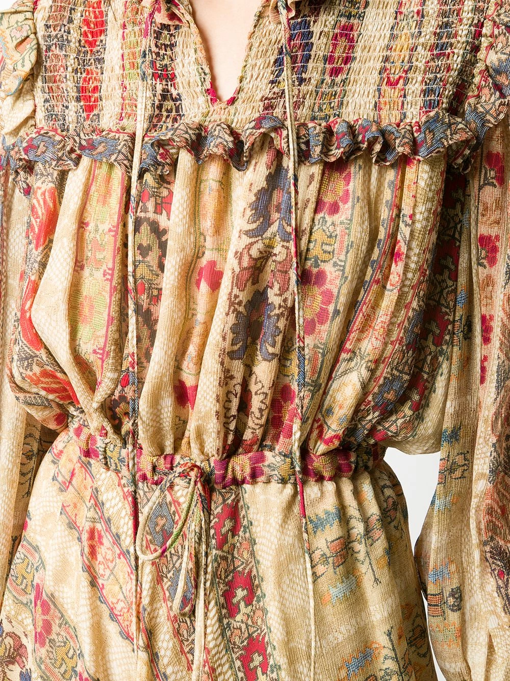Motif de fleurs, détails de volants, lien de resserrage à la taille, manches longues, ourlet asymétrique. Couleur : multicolore. Matière : soie.