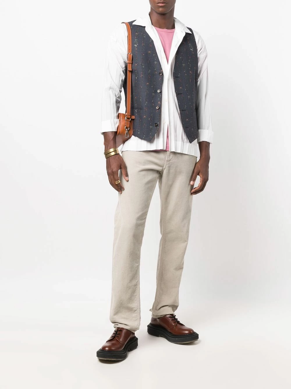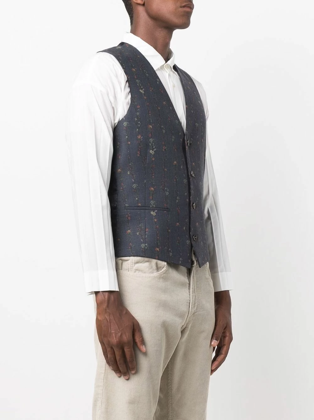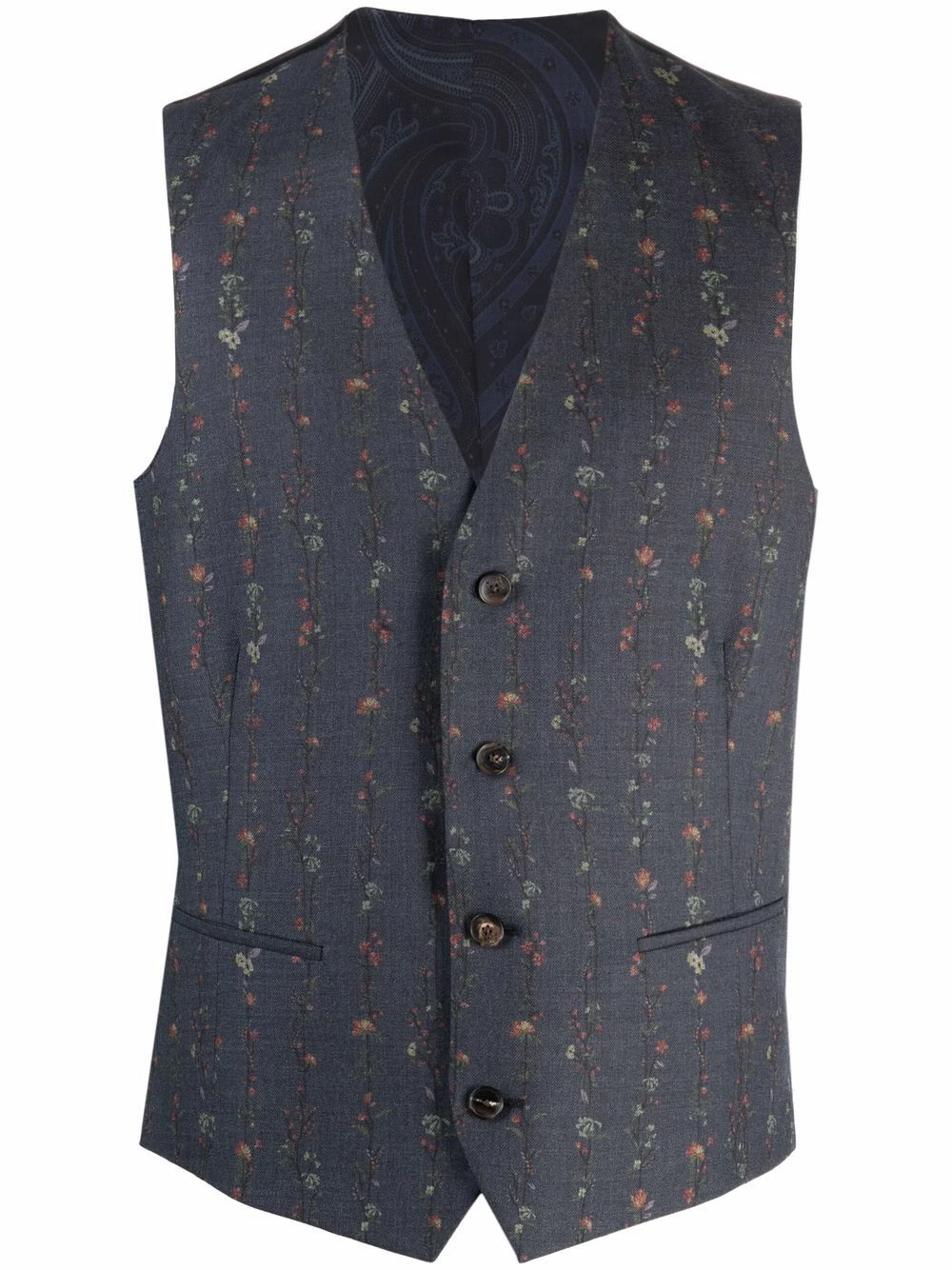 Imprimé à fleurs, motif cachemire, col v, boutonnière sur le devant, design sans manches, deux poches passepoilées avant, bretelle ajustable au dos. Matière : laine.
