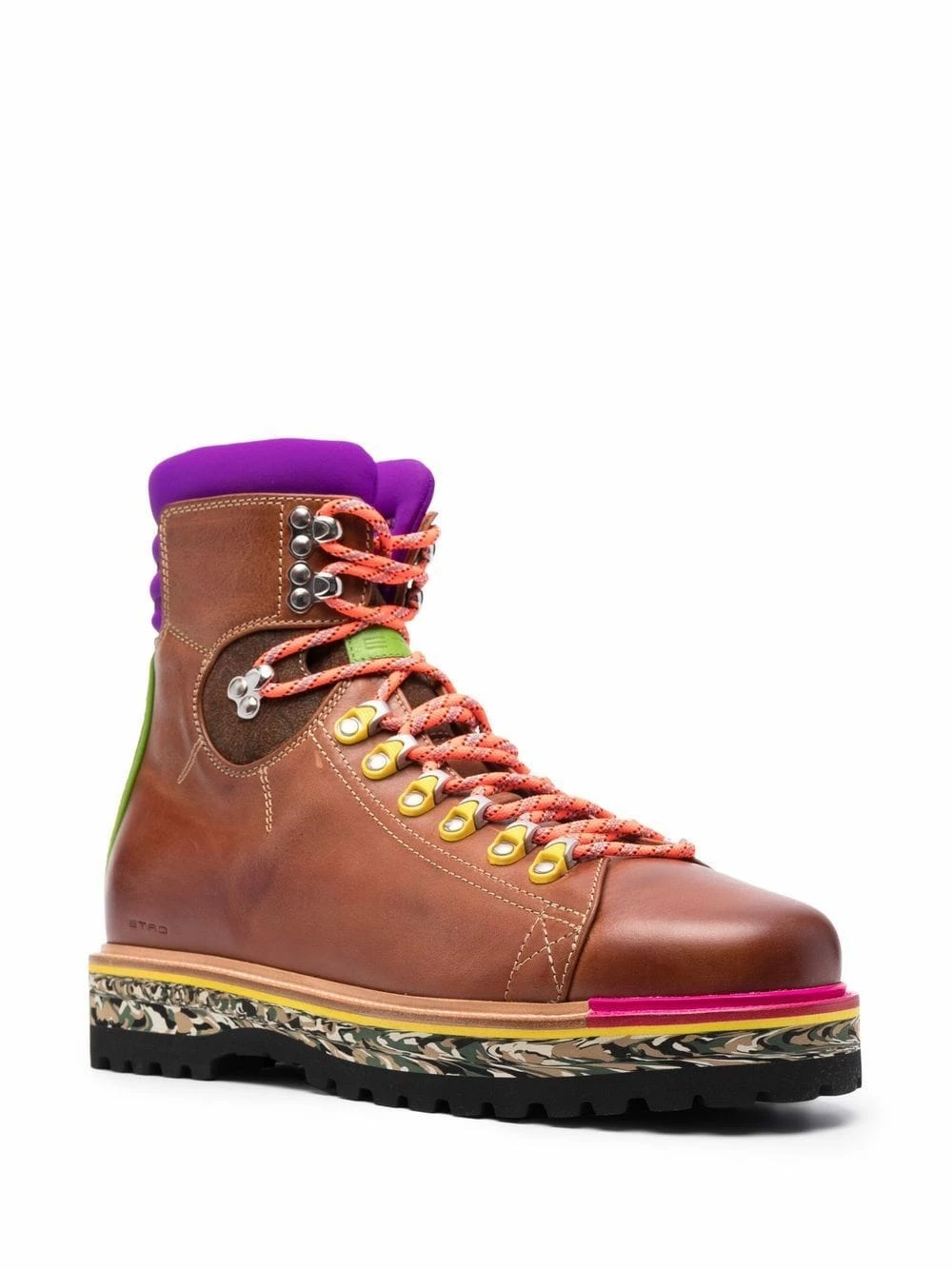 Hauteur cheville, lacets contrastants, imprimé camouflage, bout rond, fermeture à lacer sur le devant, languette à patch logo, semelle plate en caoutchouc. Couleur : marron. Matière : cuir de veau.