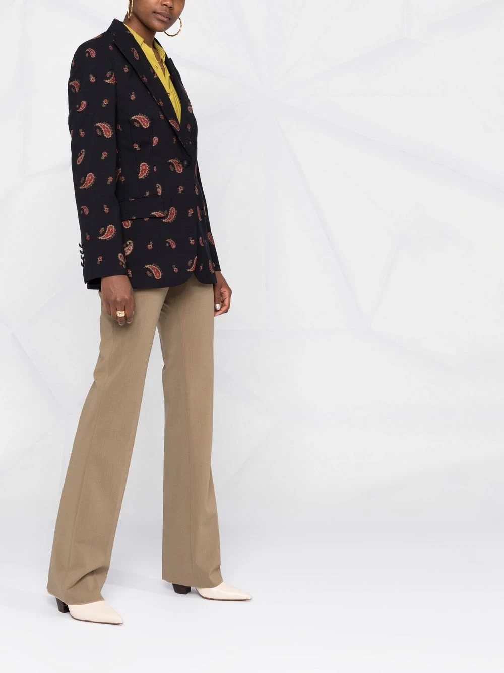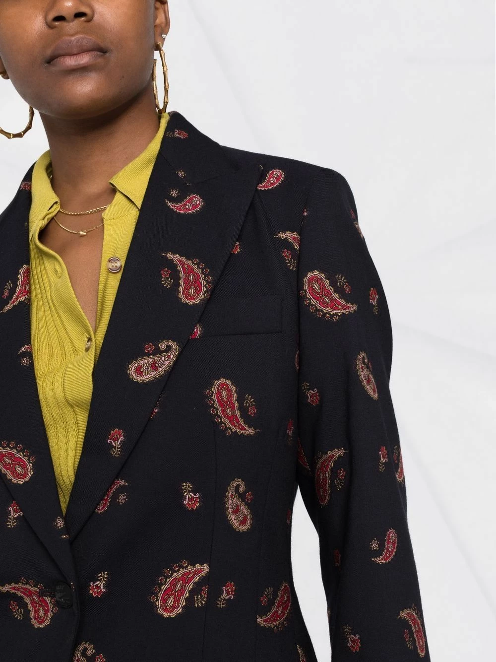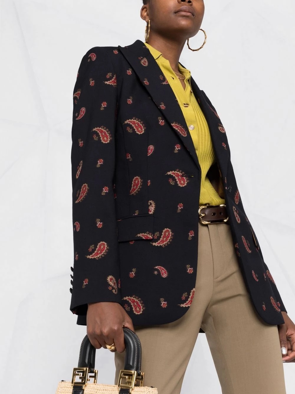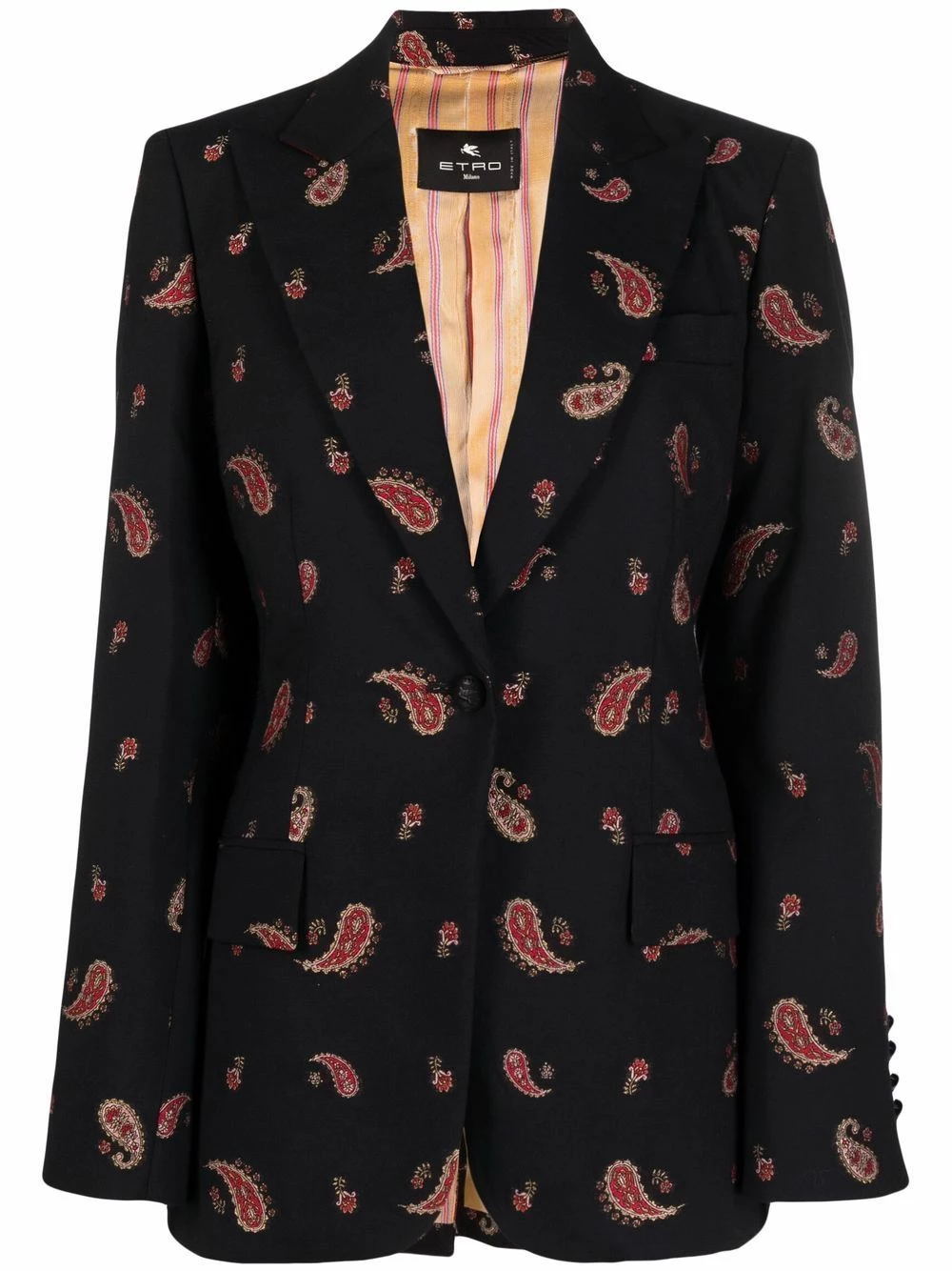 Motif cachemire, poches latérales à rabat, boutonnière sur le devant, revers crantés, manches longues, ourlet incurvé. Couleur : noir. Matière : laine.
