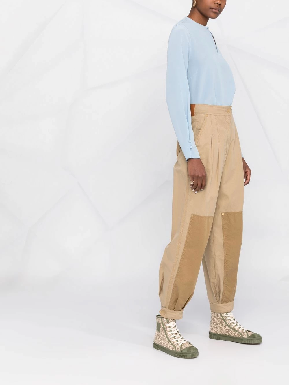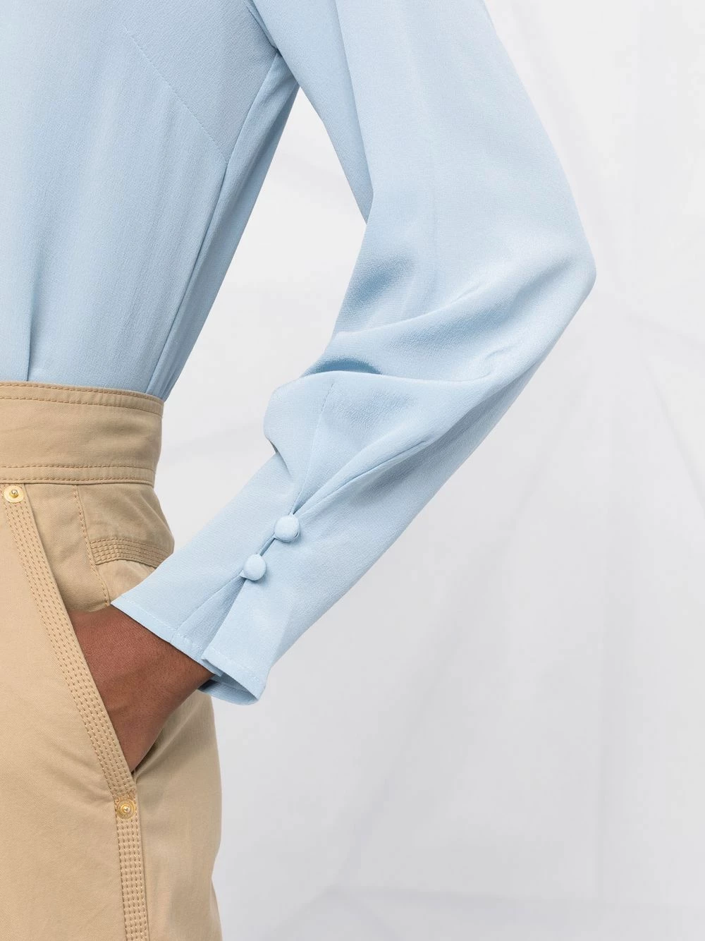Détails de découpes, encolure ronde, manches à poignets resserrés, ourlet incurvé. Matière : soie.