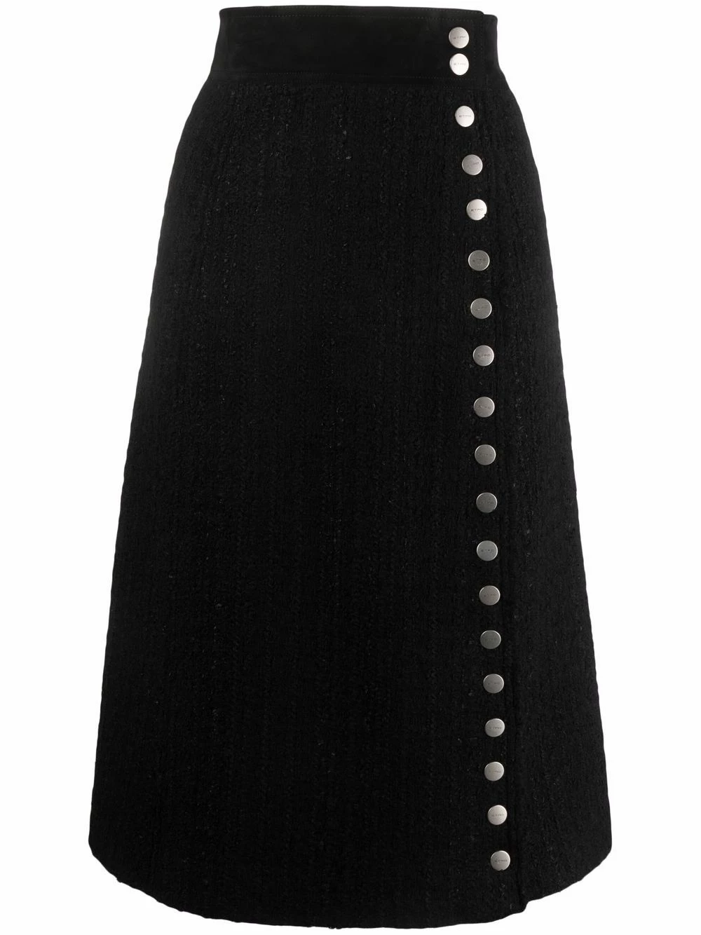 Taille haute, tweed, boutonnière sur le devant, coupe mi-longue. Couleur : noir.