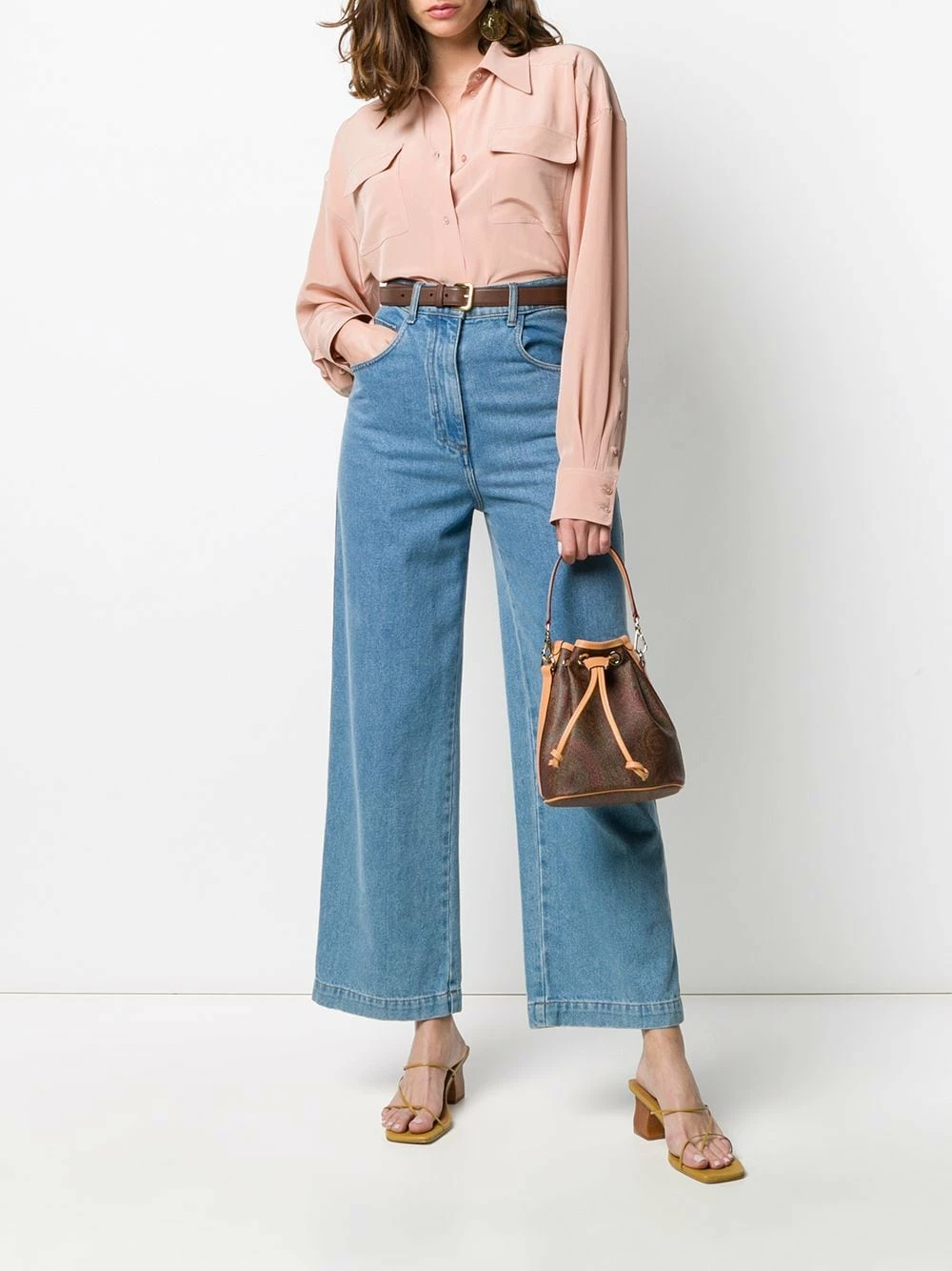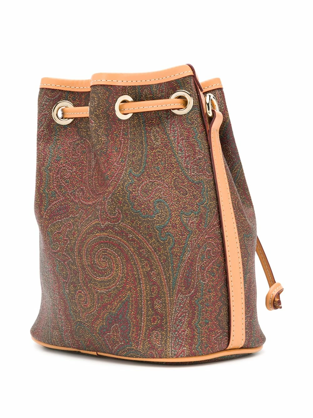 Sac seau à motif cachemire en coton mélangé Etro avec motif cachemire, design ouvert sur le dessus, bride portée épaule détachable et ajustable, lien de resserrage et compartiment intérieur. Couleur : marron.