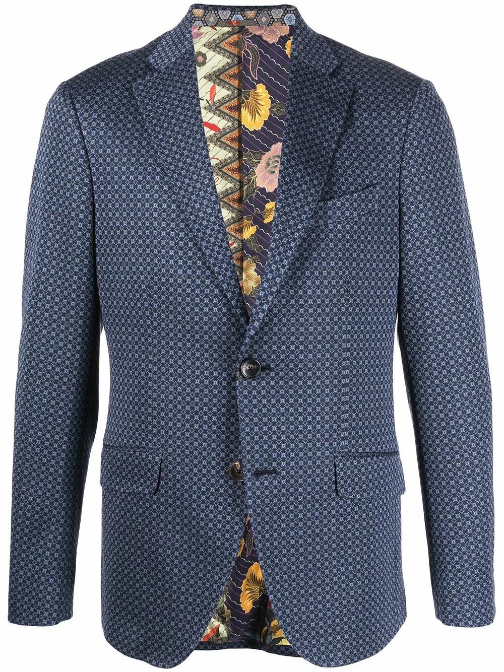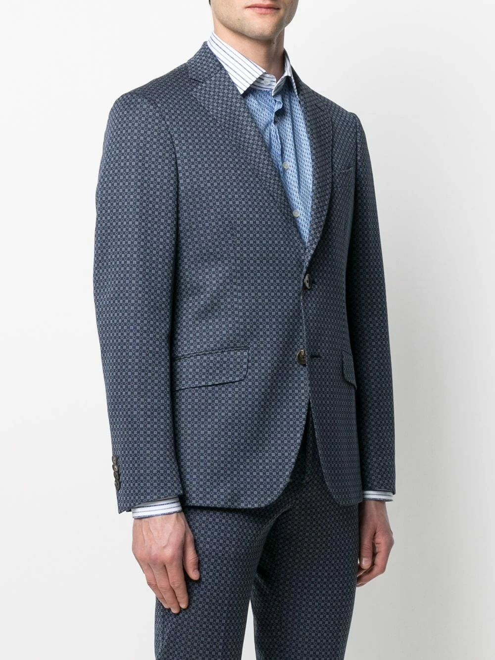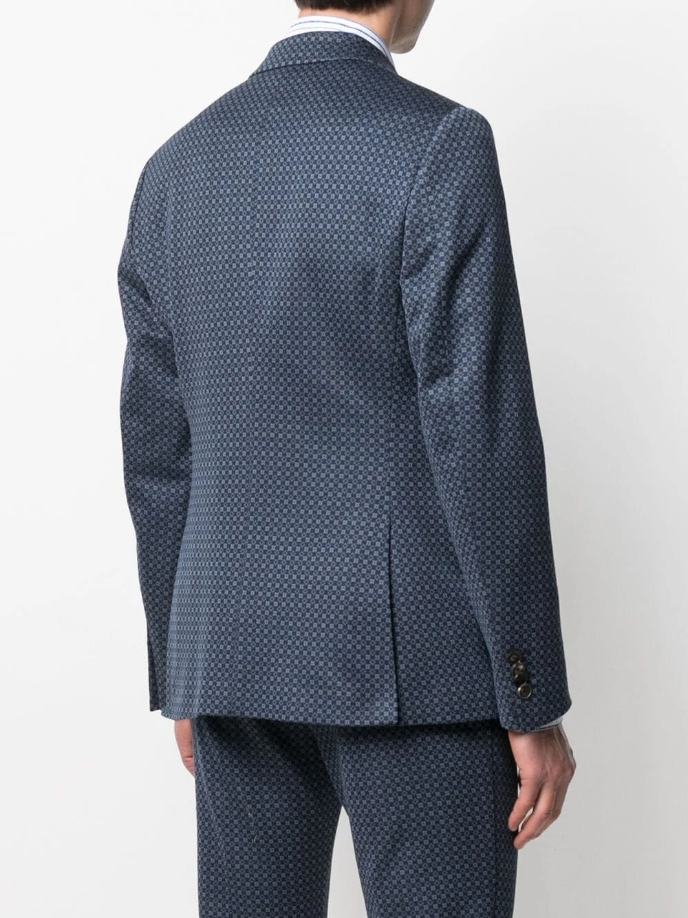 Revers crantés, boutonnière sur le devant, manches longues, poche passepoilée sur la poitrine, deux poches plaquées avant, double fente arrière. Matière : coton mélangé.