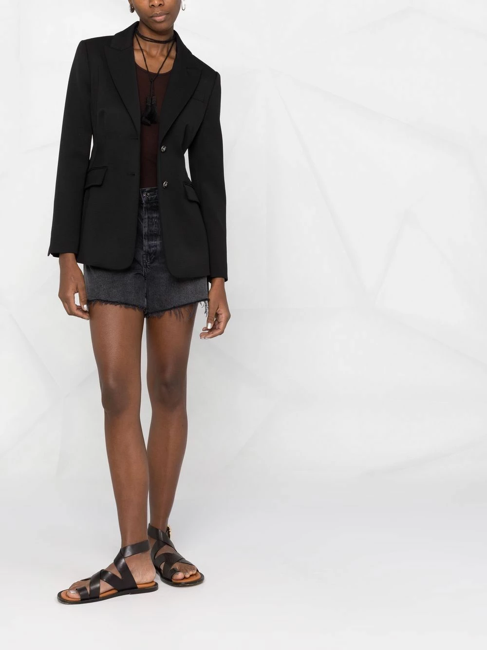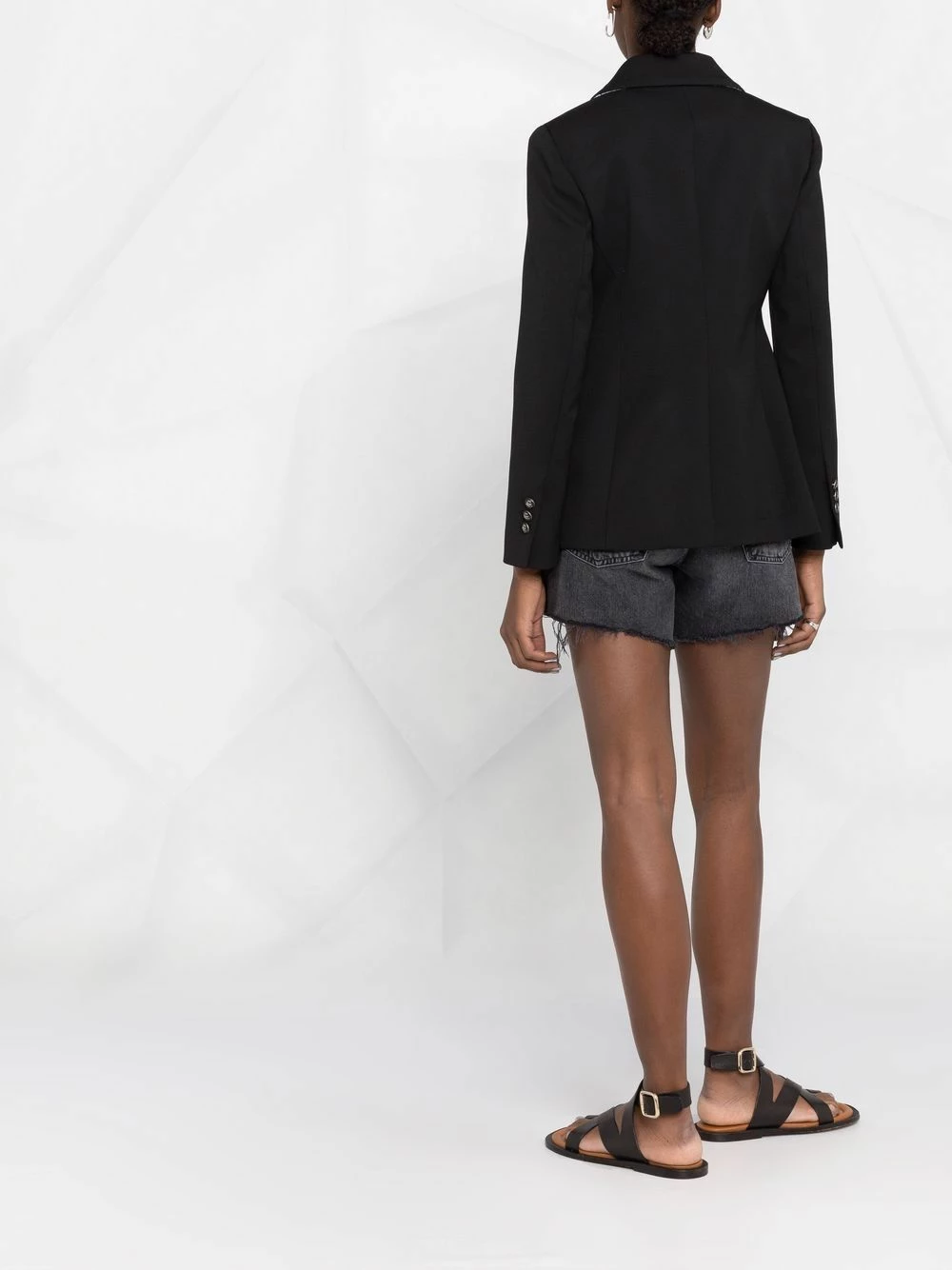 Revers pointus, poches devant à rabat, boutonnière sur le devant, manches longues. Couleur : noir.