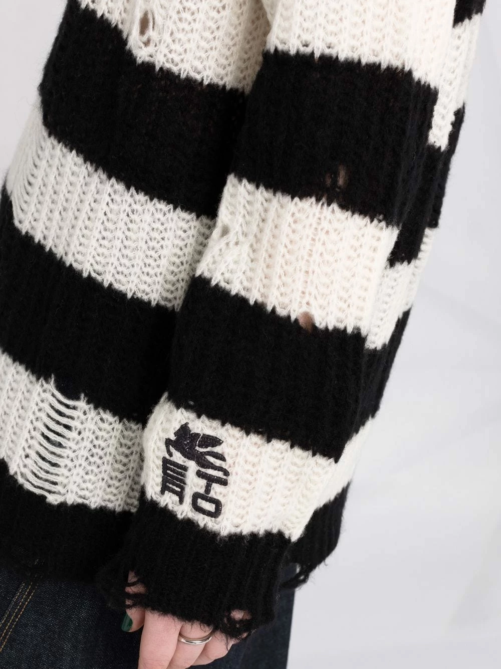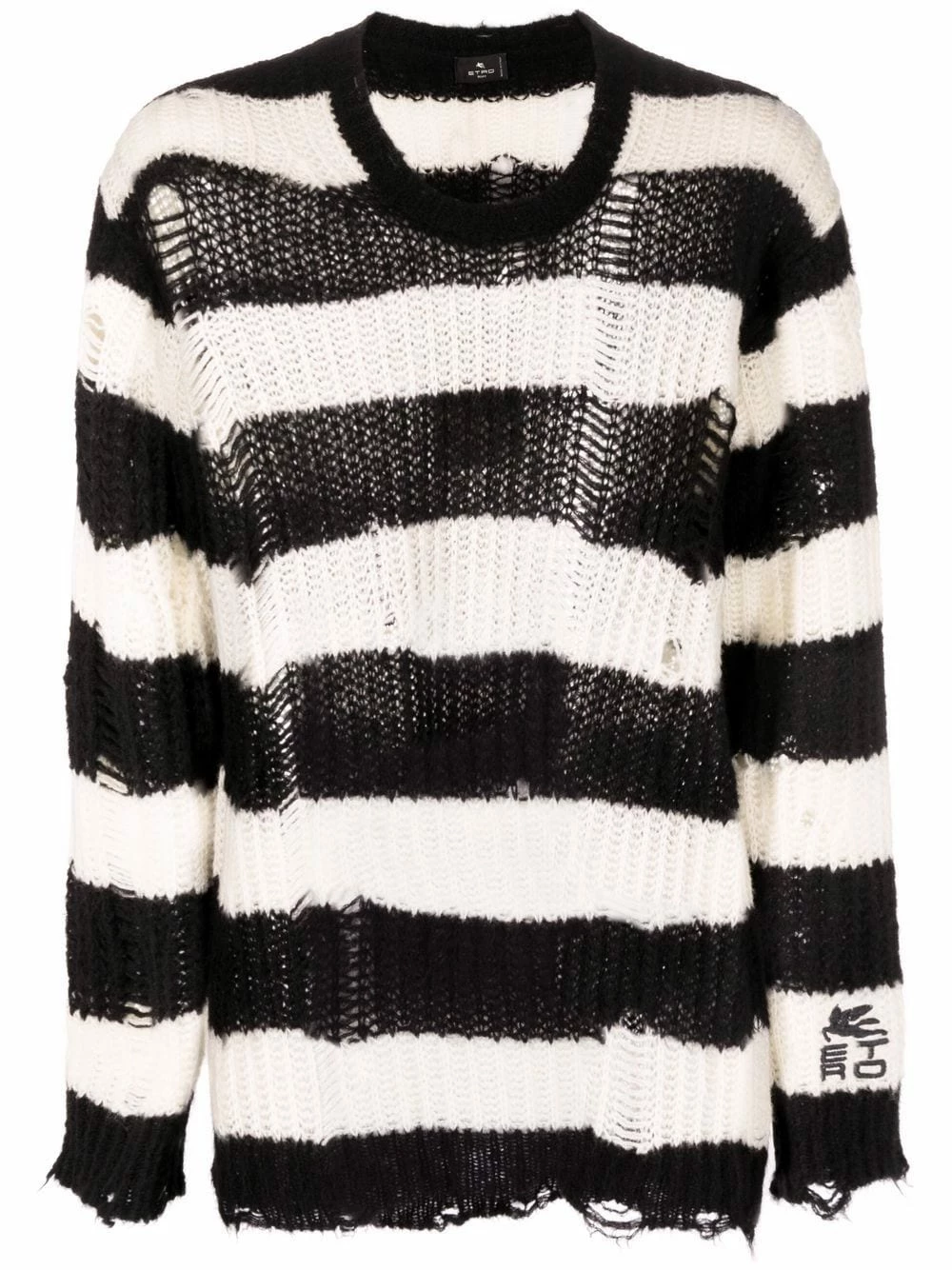 Design en maille, rayures horizontales, finitions effilochées, encolure ronde, manches longues, logo brodé sur la manche. Matière : laine.
