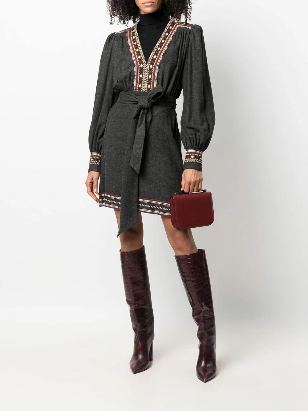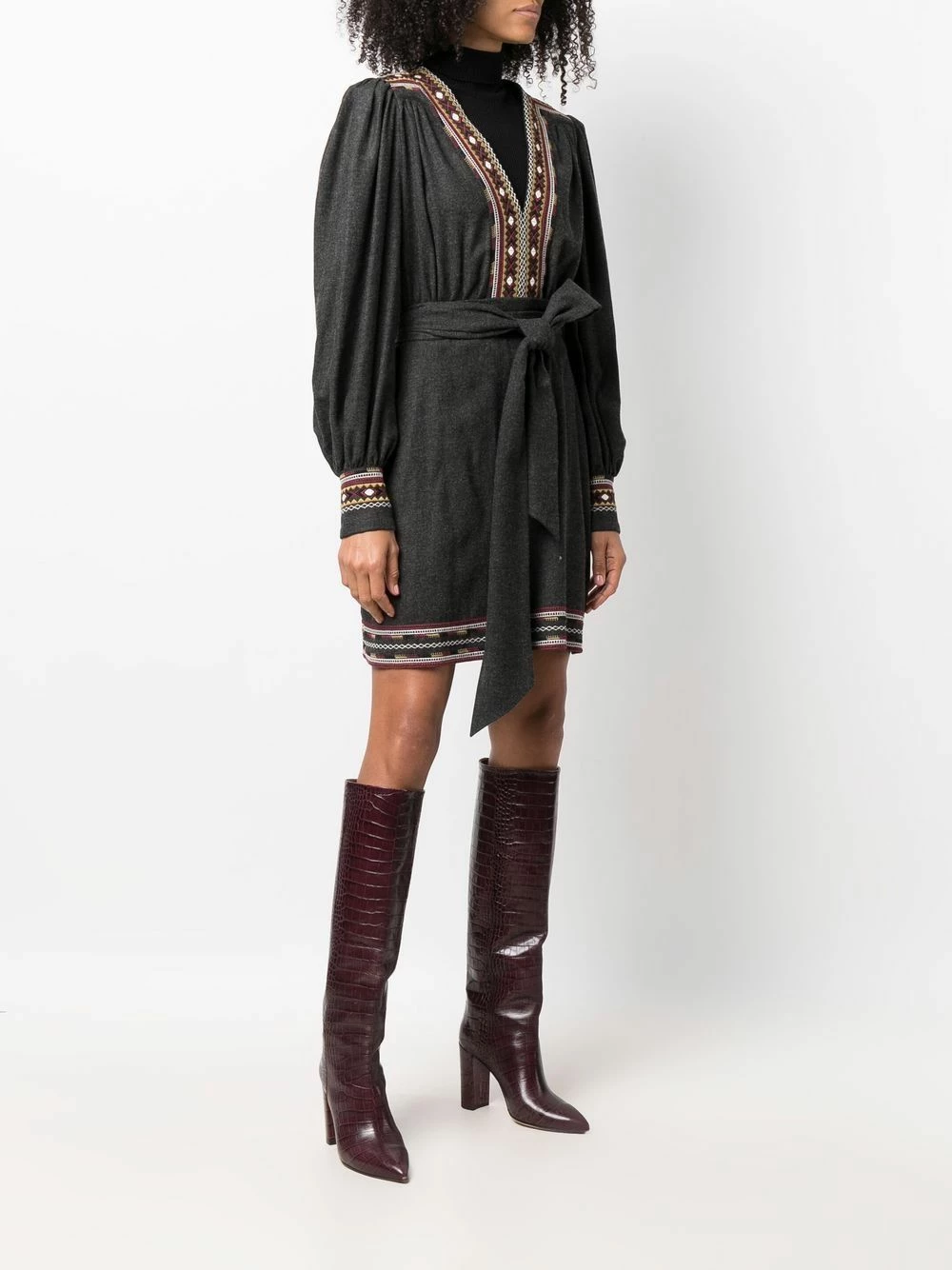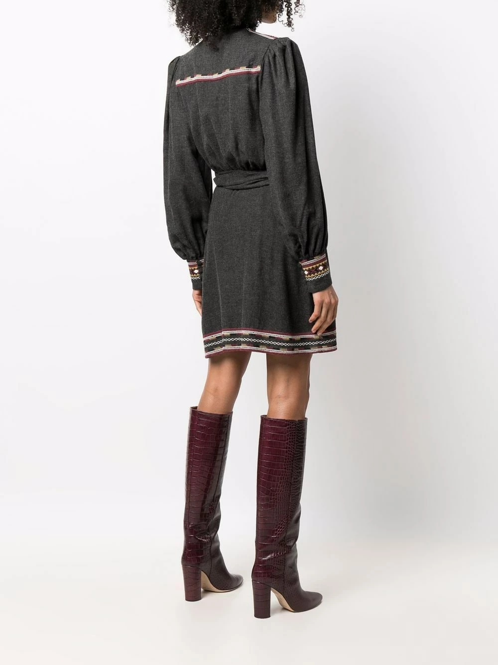 Broderies, taille nouée, col v, manches longues. Couleur : gris.