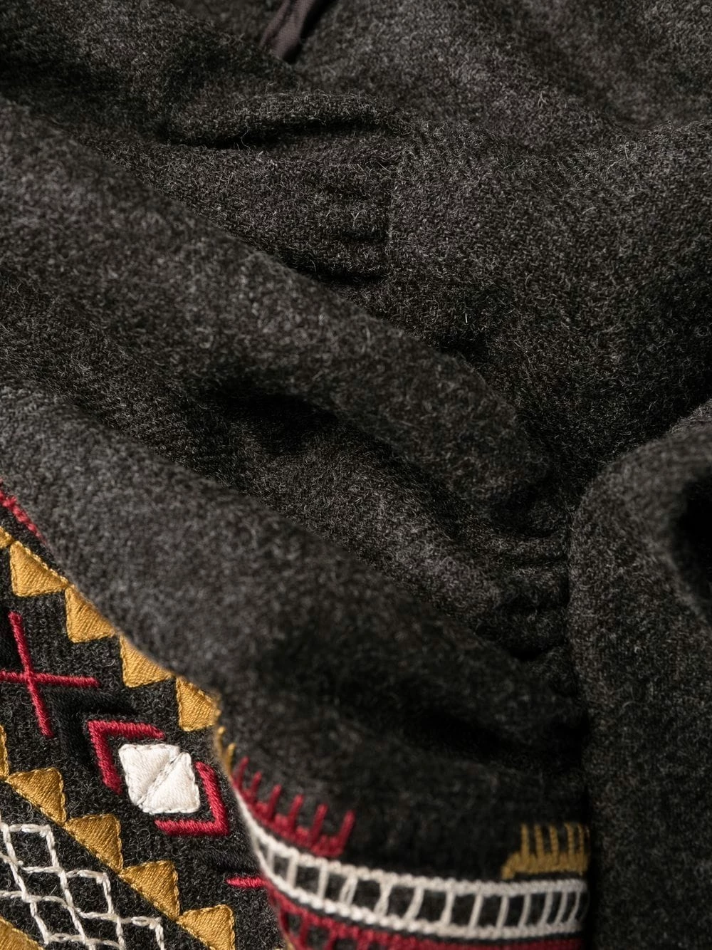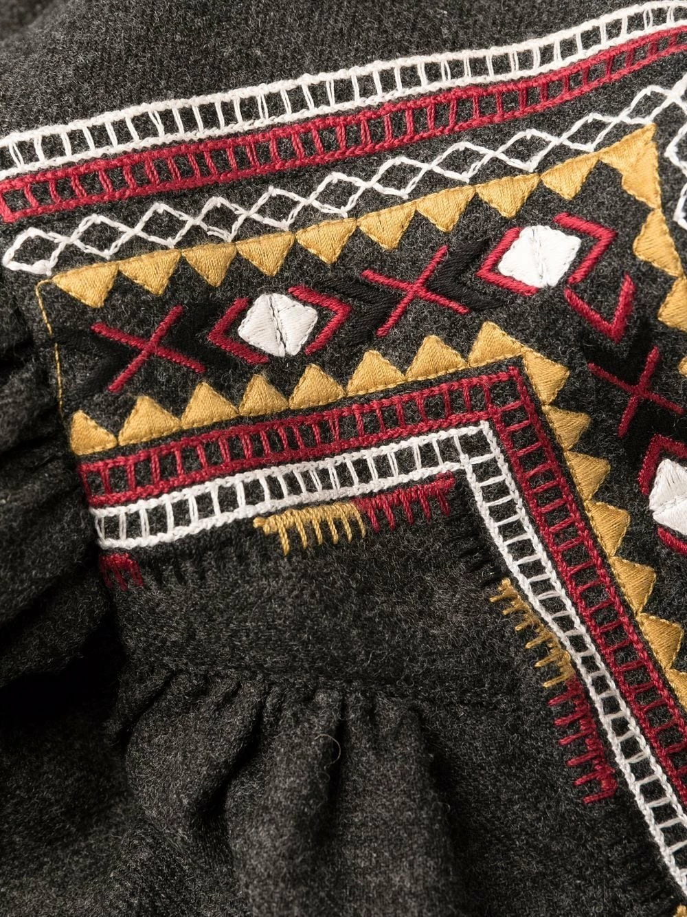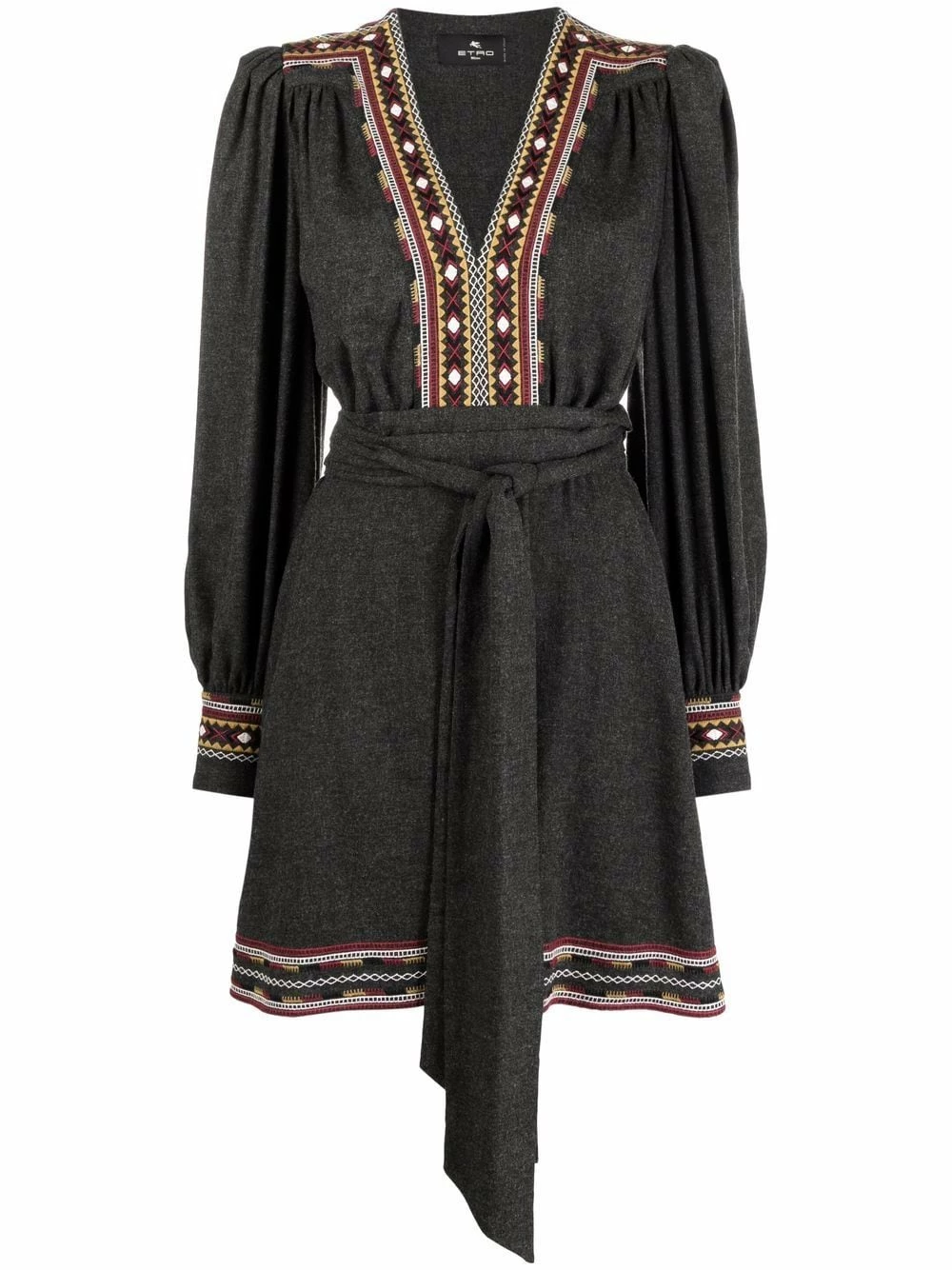 Broderies, taille nouée, col v, manches longues. Couleur : gris.