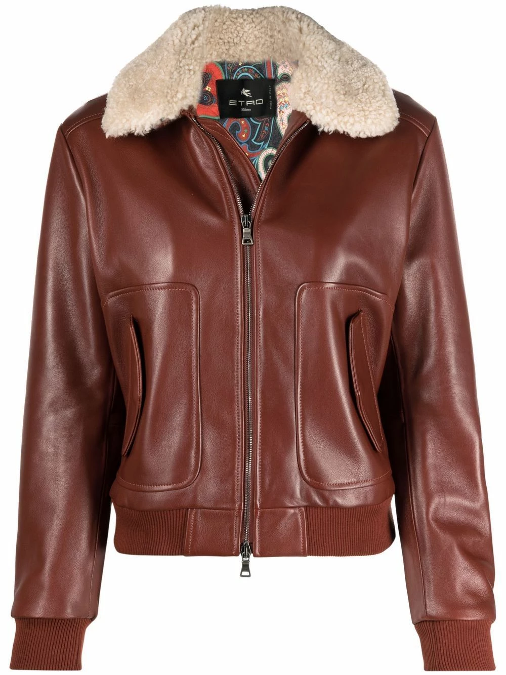 Finitions en peau lainée, manches longues, fermeture zippée à double sens sur le devant, deux poches latérales à rabat, bordures nervurées. Couleur : marron.