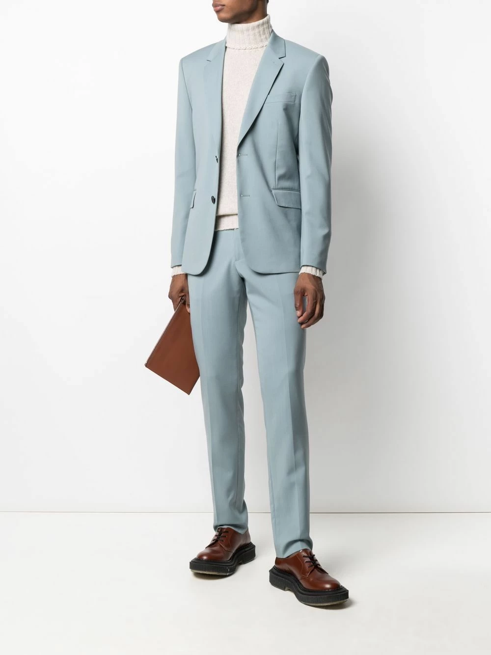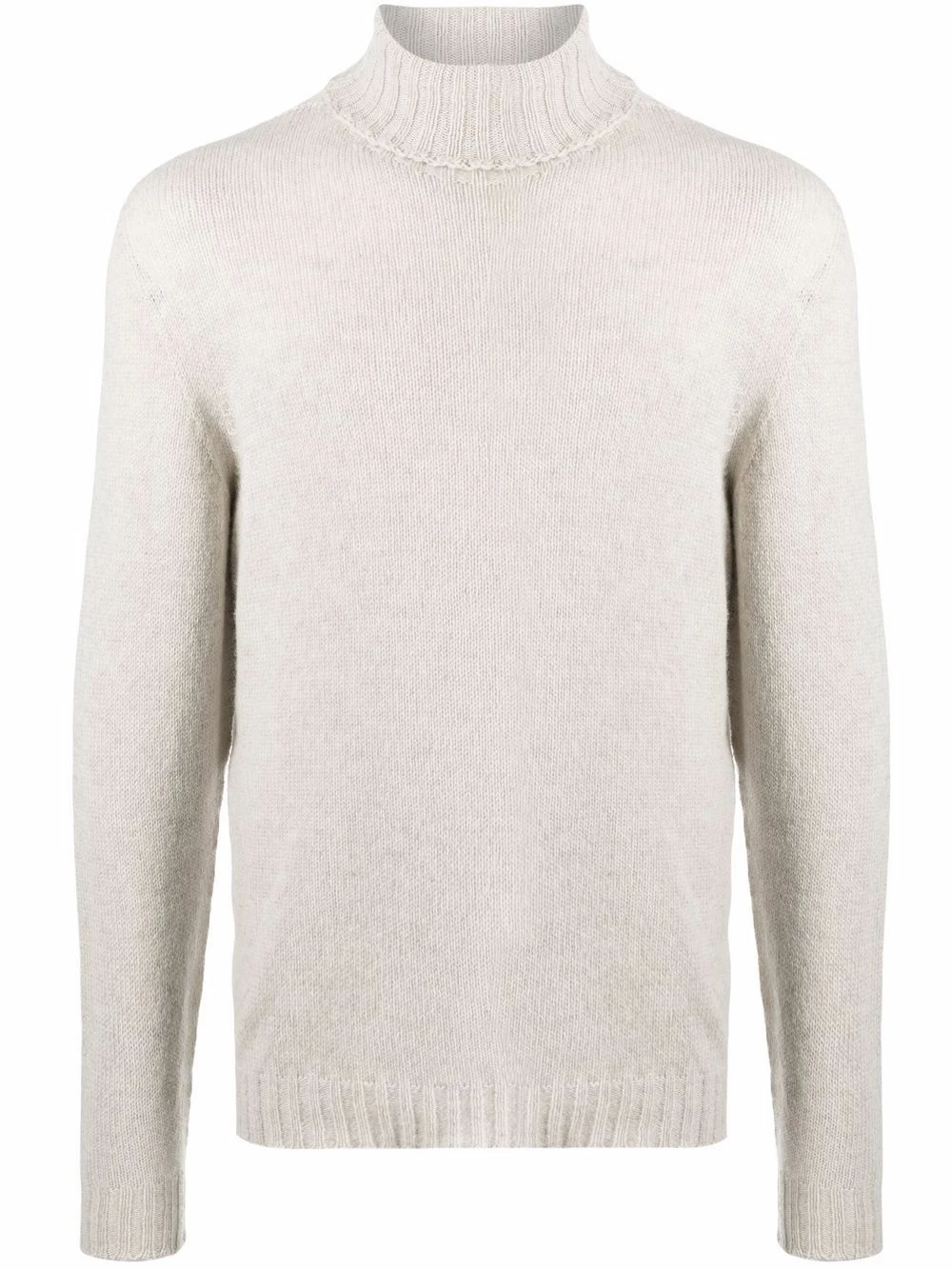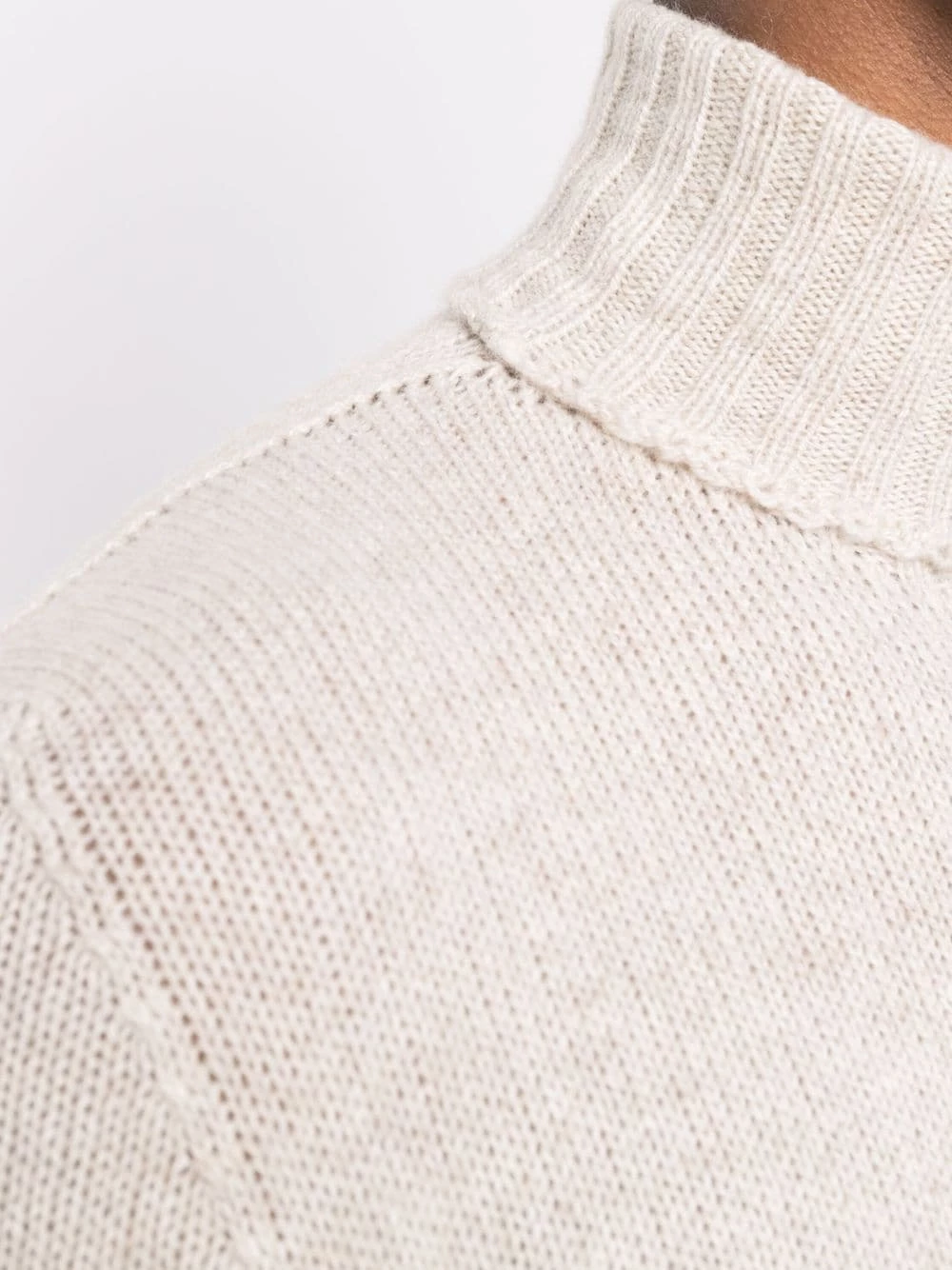 Design tricoté, détail nervuré, col roulé, manches longues. Matière : cachemire.