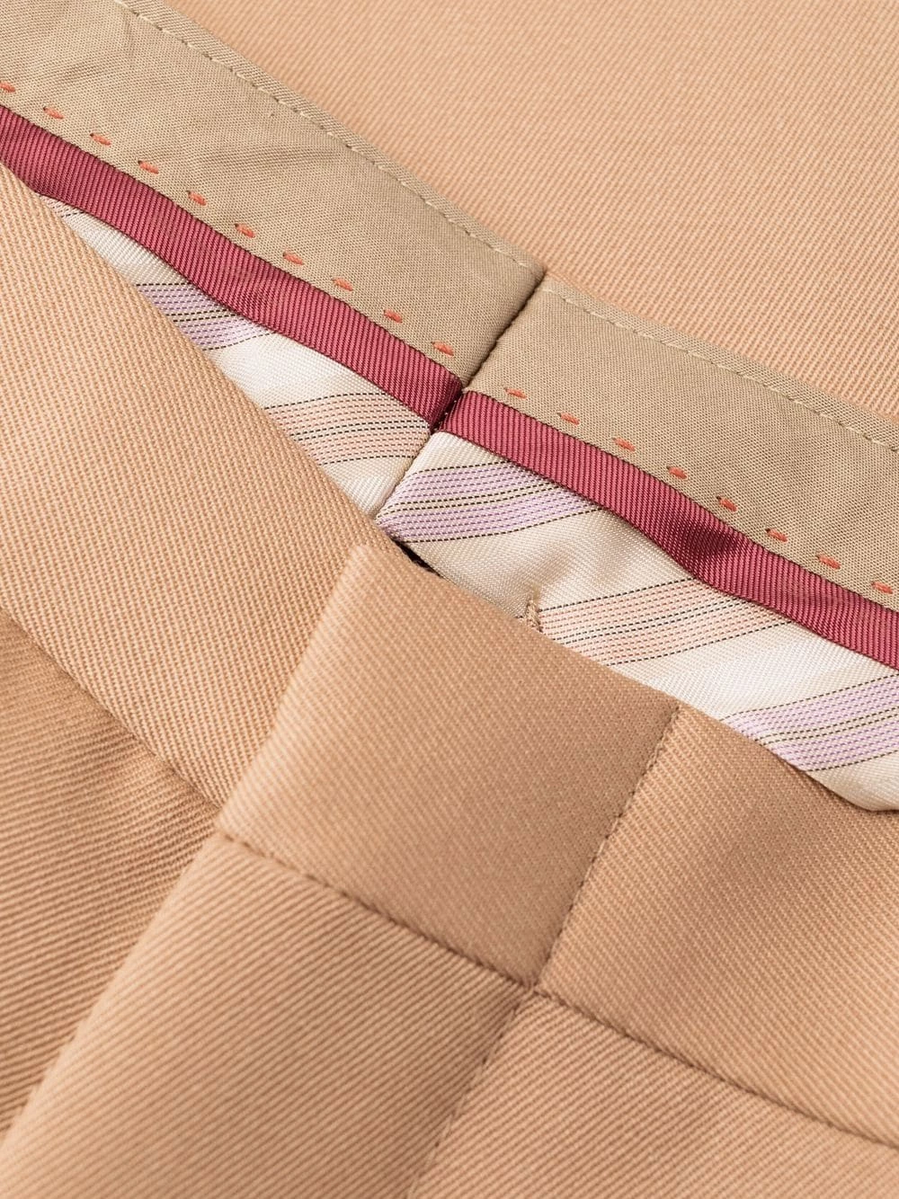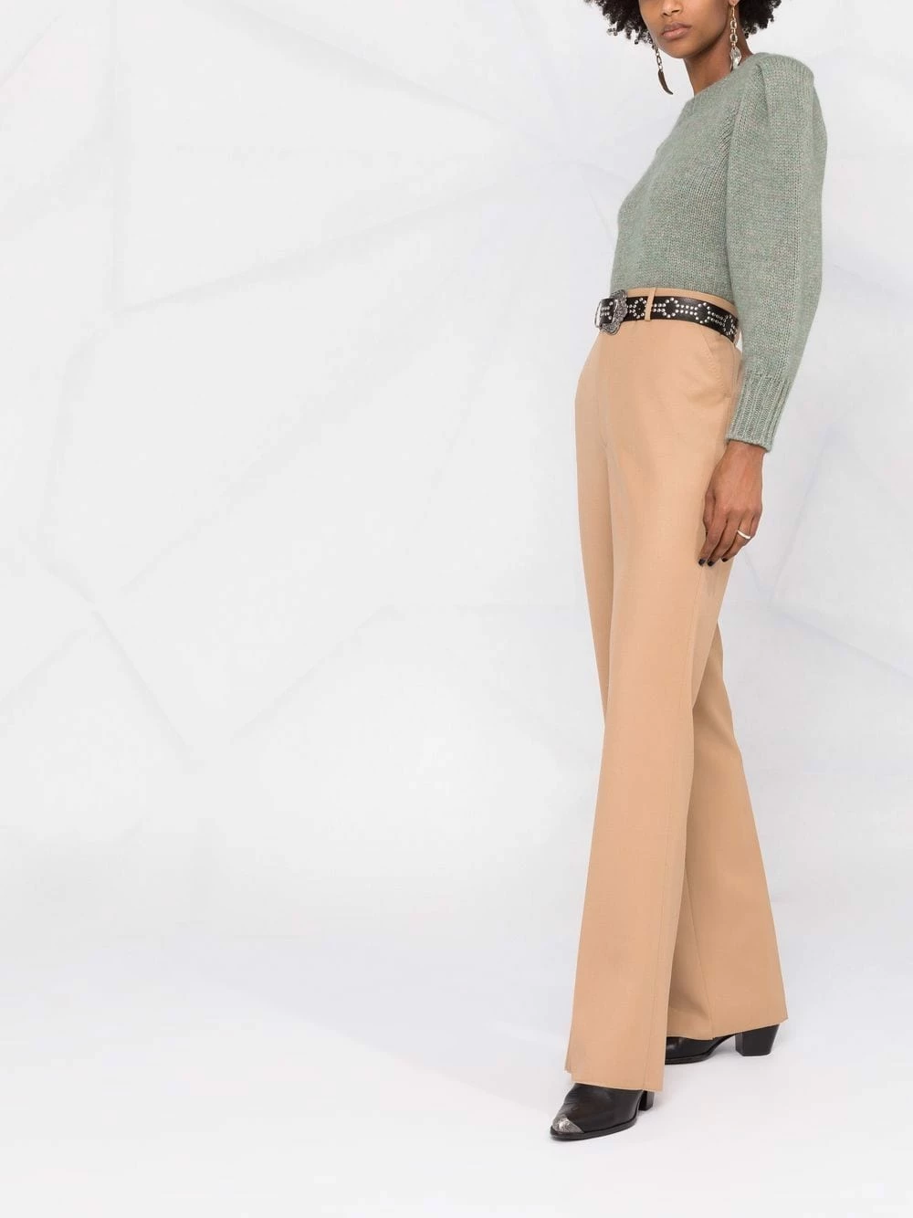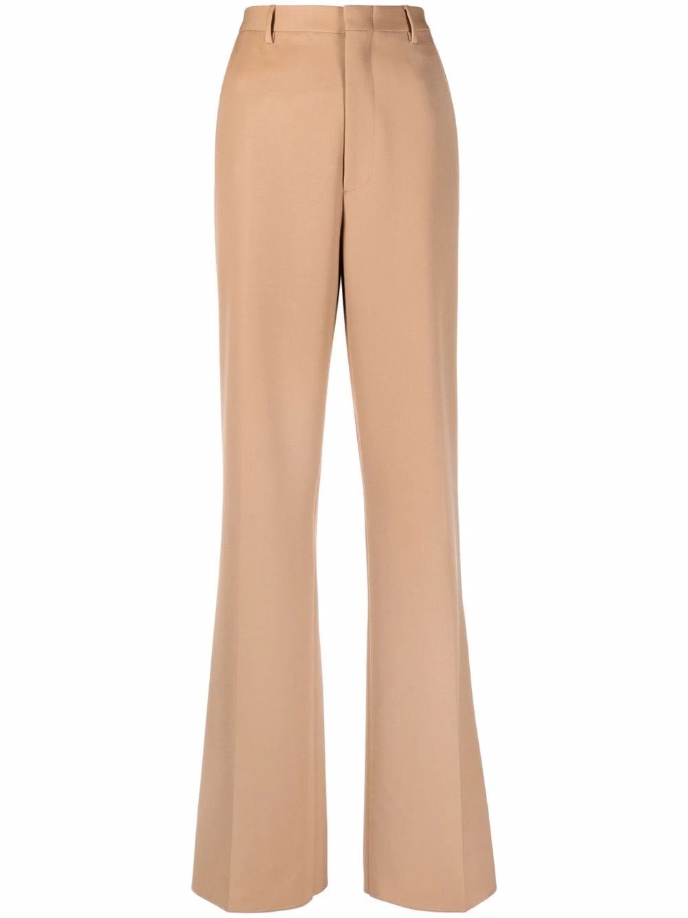 Plis marqués, taille haute, fermeture dissimulée sur le devant, passants de ceinture, poches latérales fendues, poignets évasés. Matière : laine.
