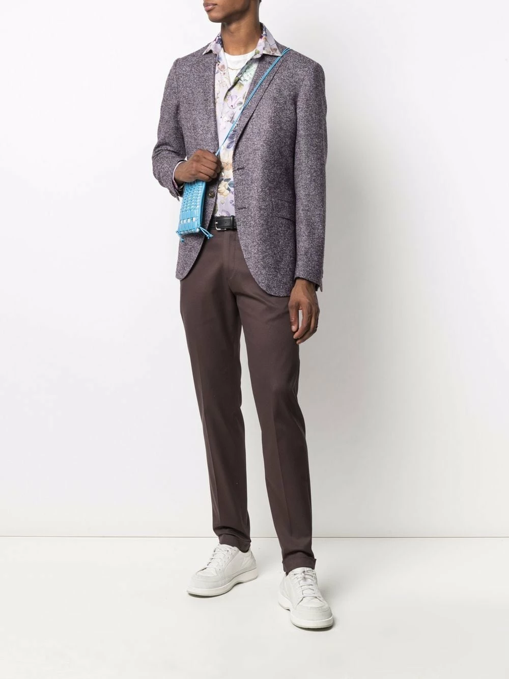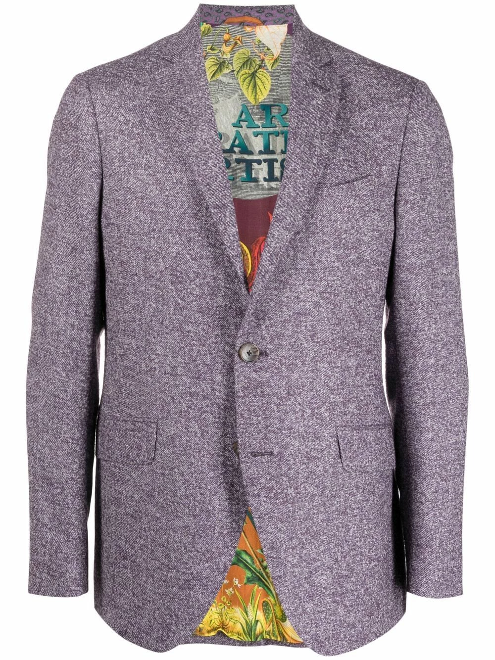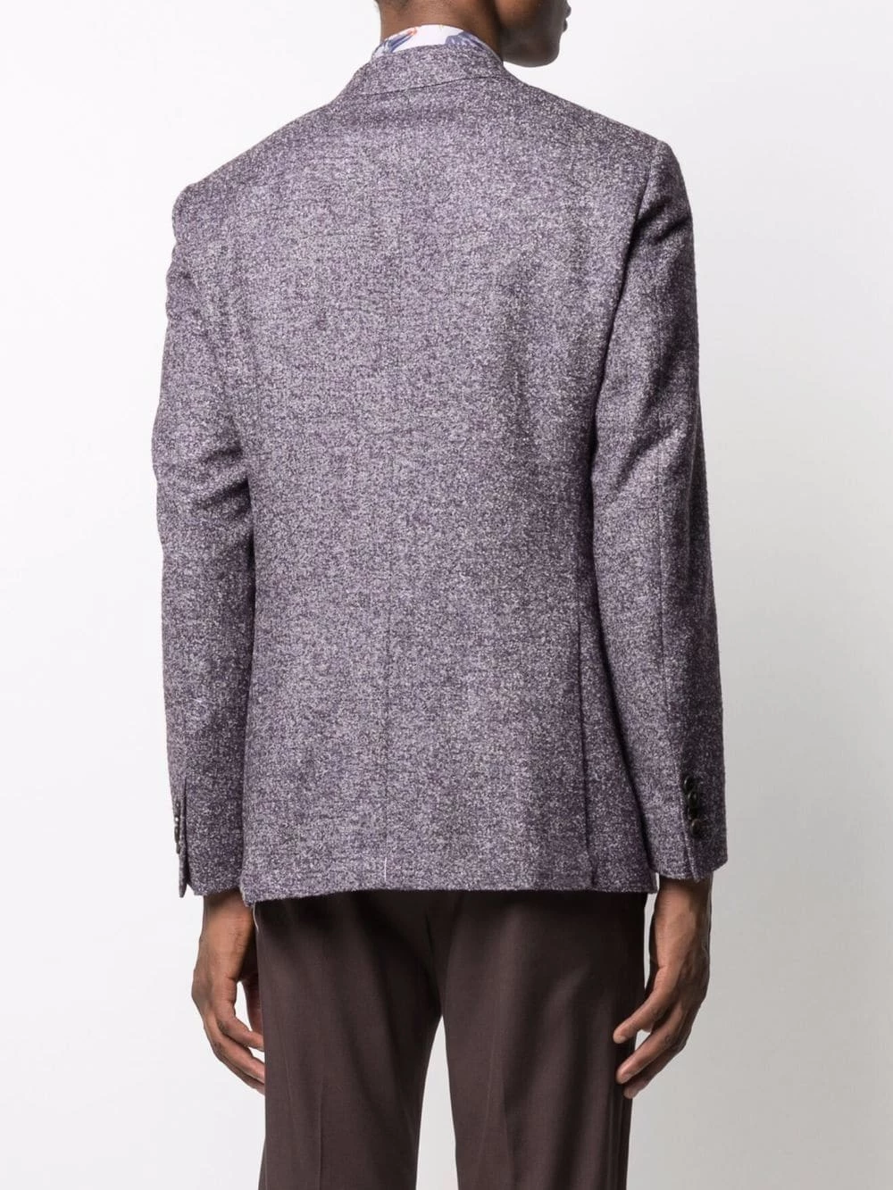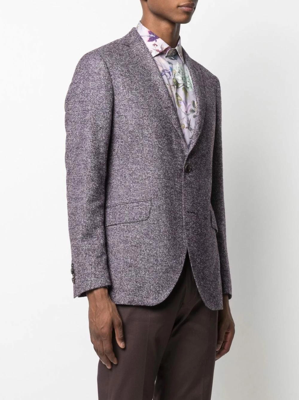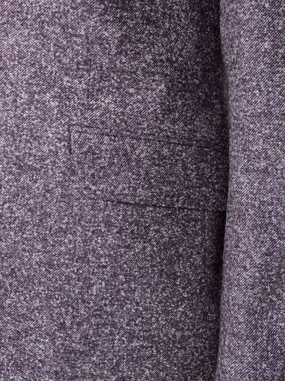 Revers crantés, boutonnière sur le devant, poche passepoilée sur la poitrine, poches latérales à rabat, double fente arrière, manches longues. Couleur : violet.