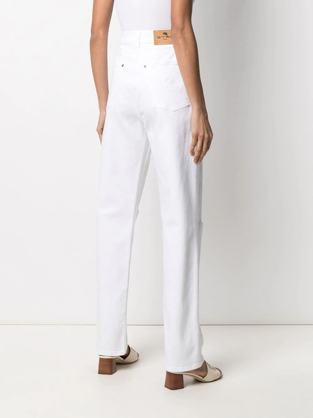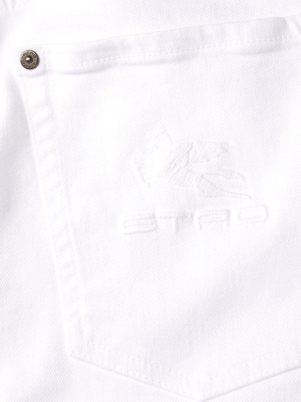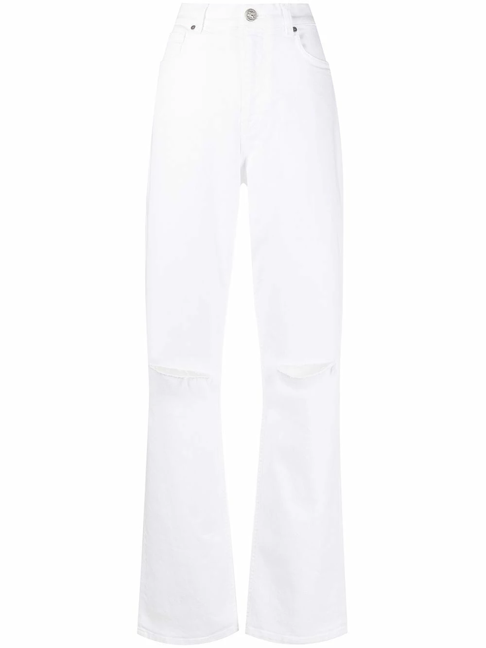 Ornements argentés, effet usé, coupe droite, taille haute, boutonnière sur le devant, poches latérales fendues. Couleur : blanc.