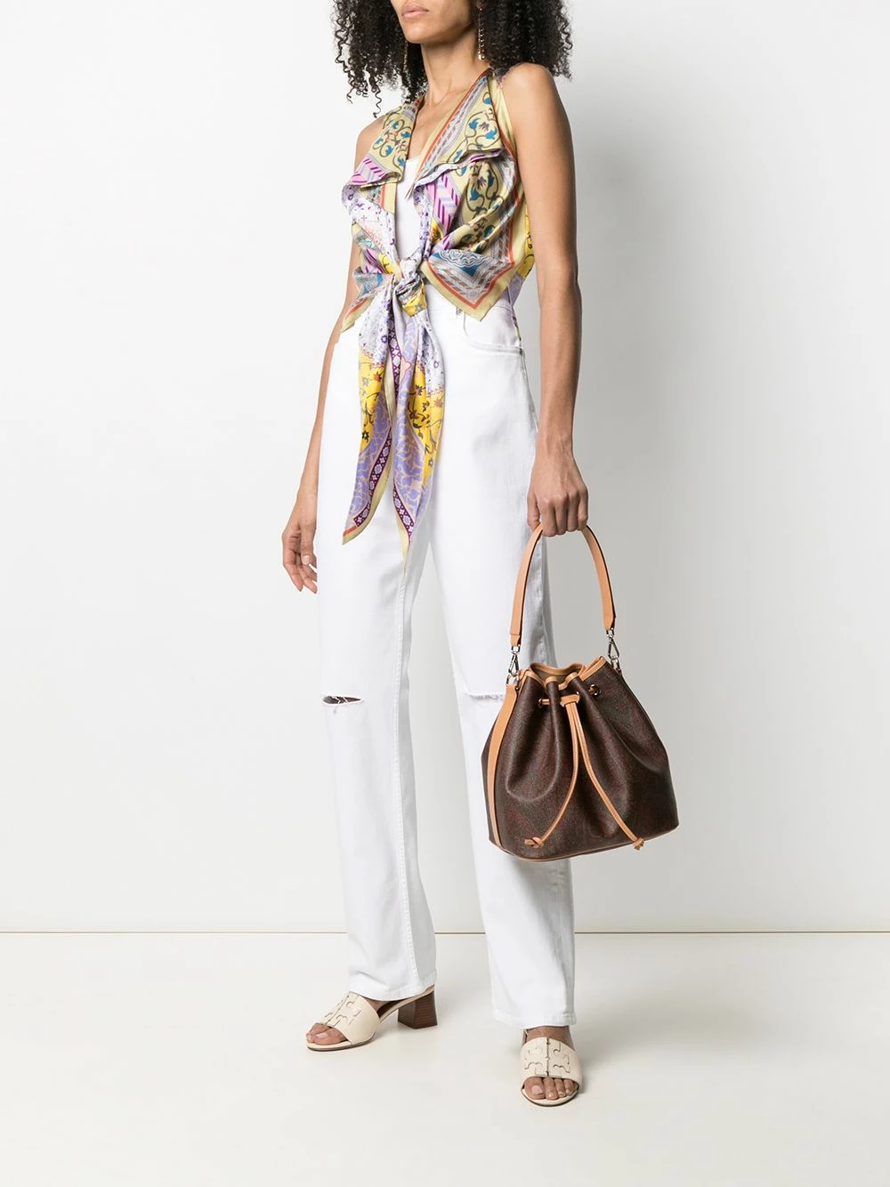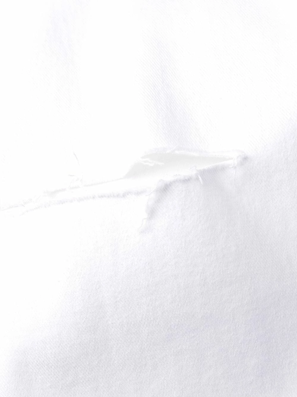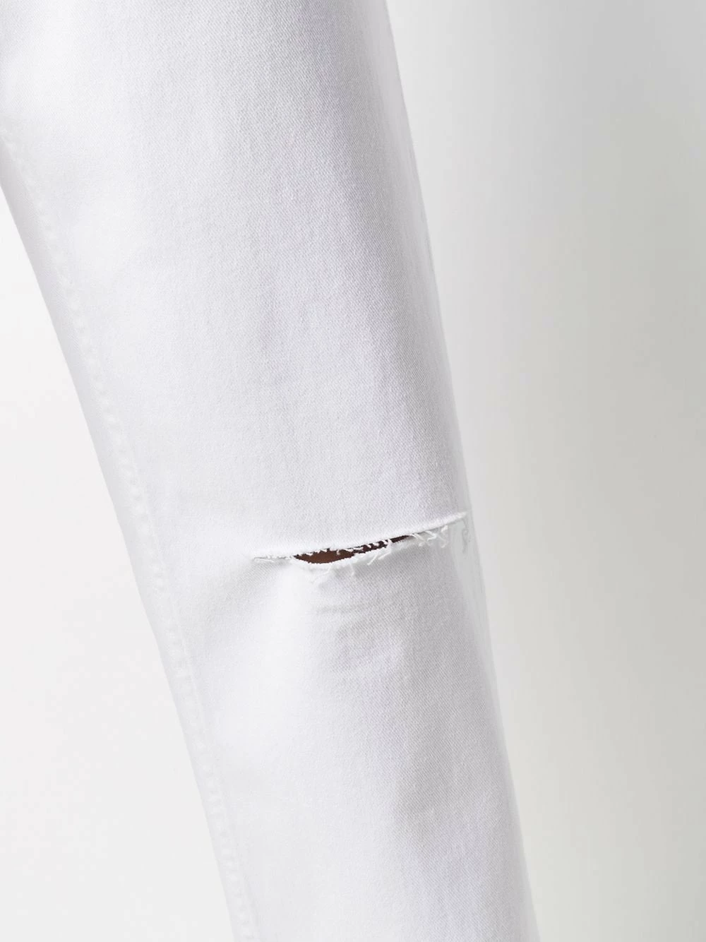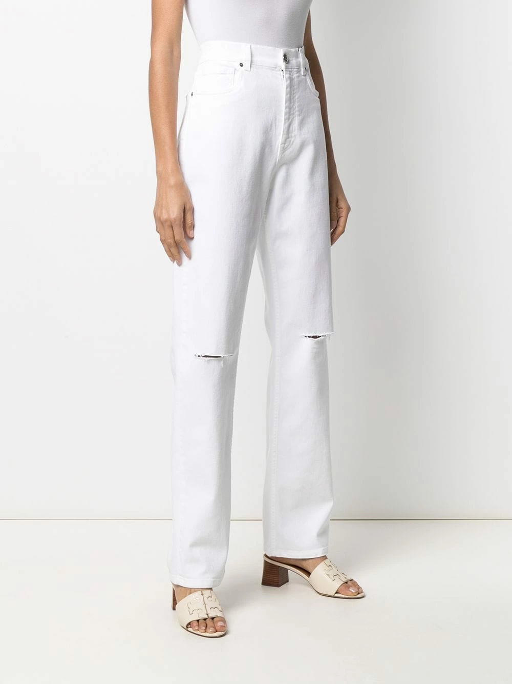 Ornements argentés, effet usé, coupe droite, taille haute, boutonnière sur le devant, poches latérales fendues. Couleur : blanc.