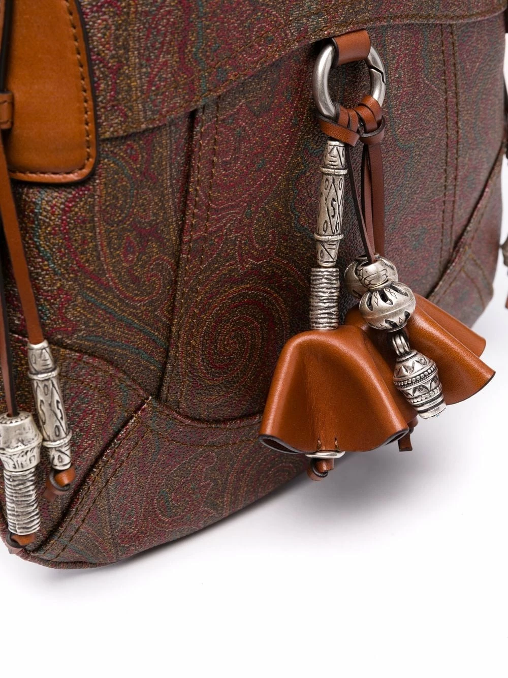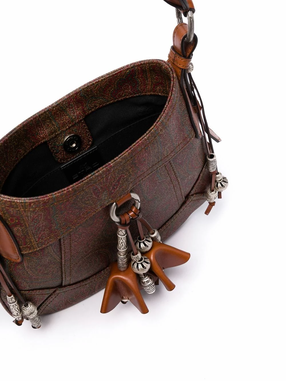Design à empiècements, motif cachemire, détails de perles brodées, compartiment principal, fermeture magnétique dissimulée, anse classique. Matière : cuir de veau.