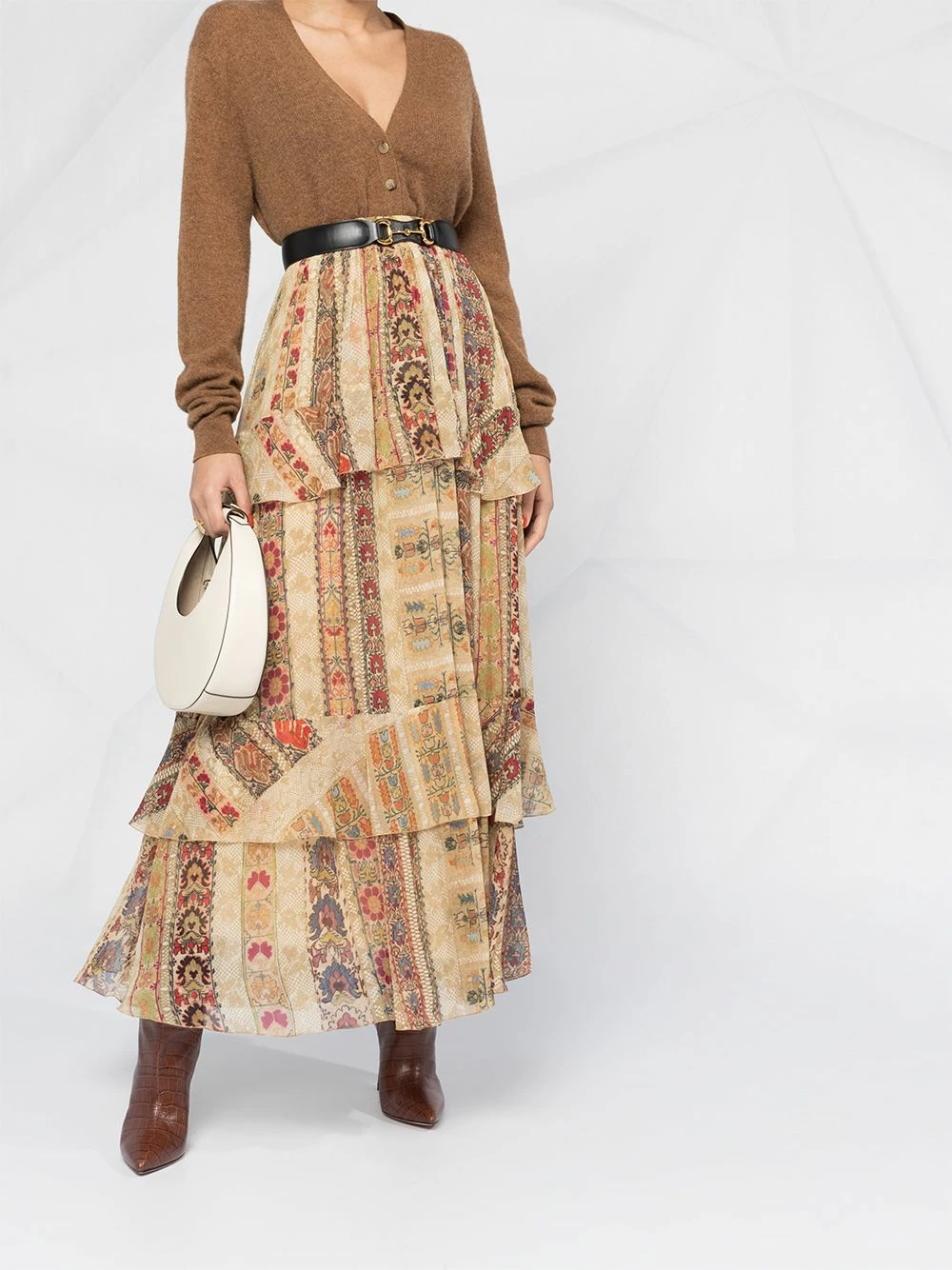 Motif cachemire, taille haute, design de volants superposés, longueur cheville. Couleur : multicolore. Matière : soie.