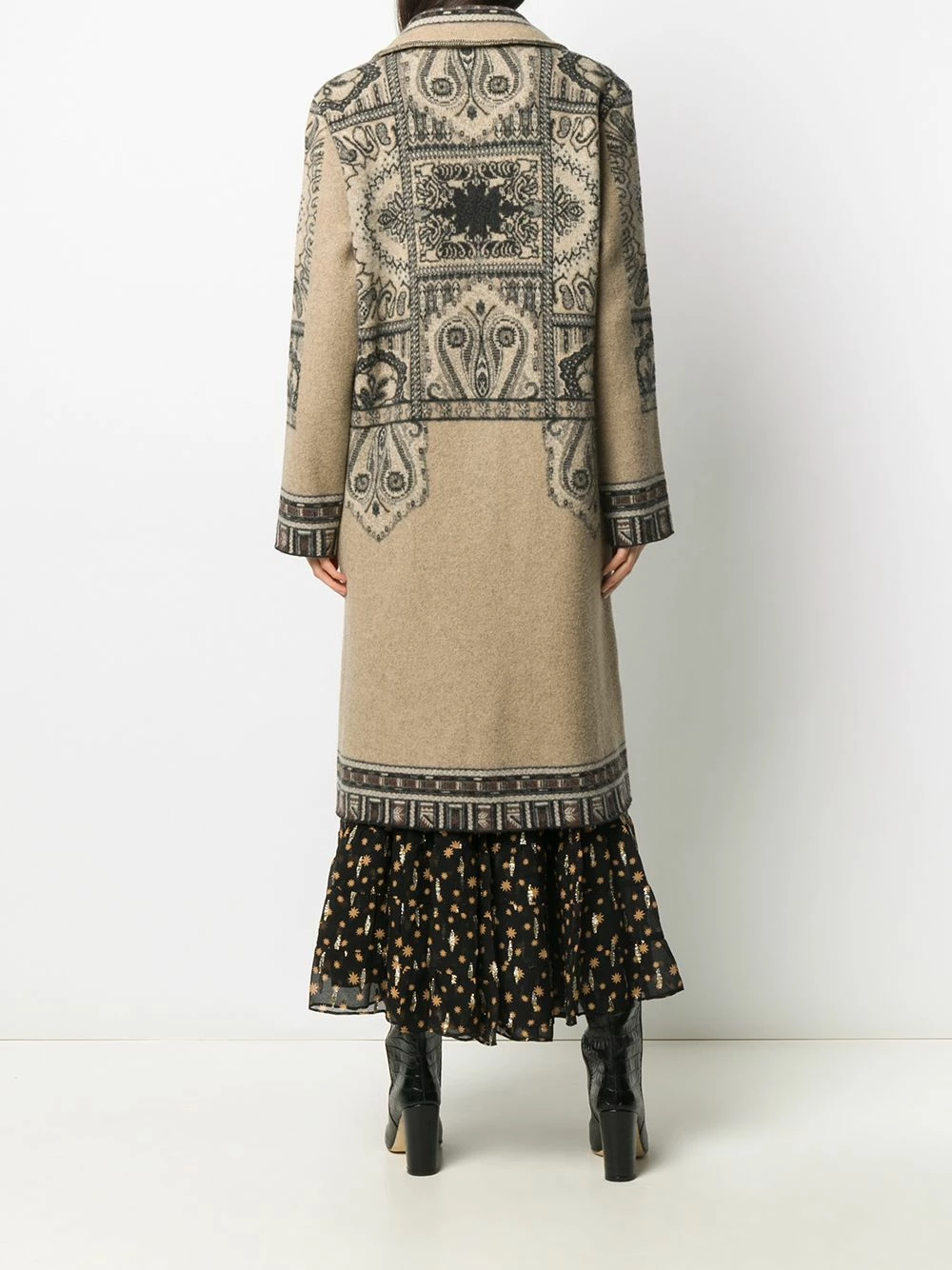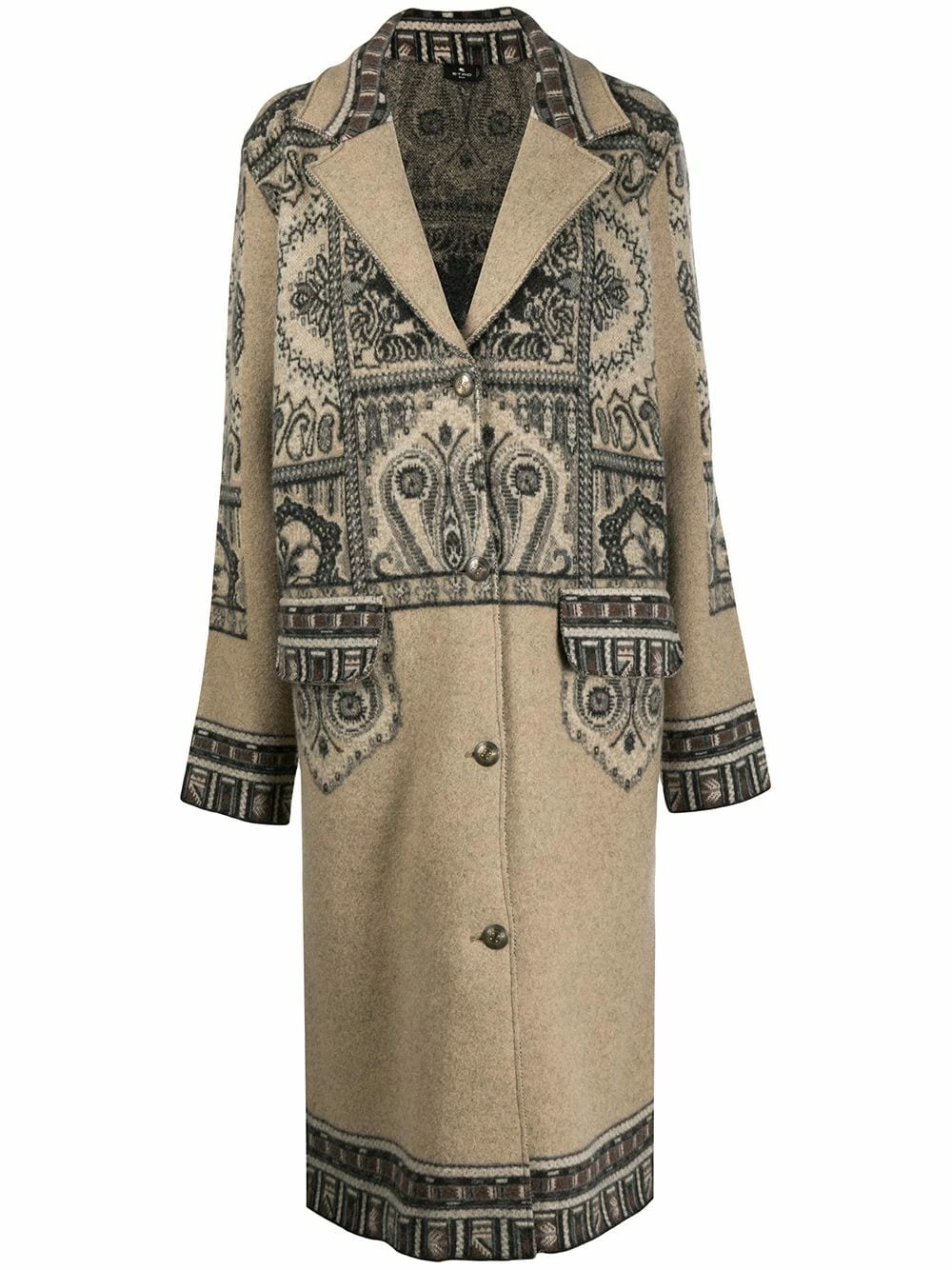 Larges revers crantés, boutonnière sur le devant, manches longues, deux poches plaquées avant, coupe longue. Matière : Laine.