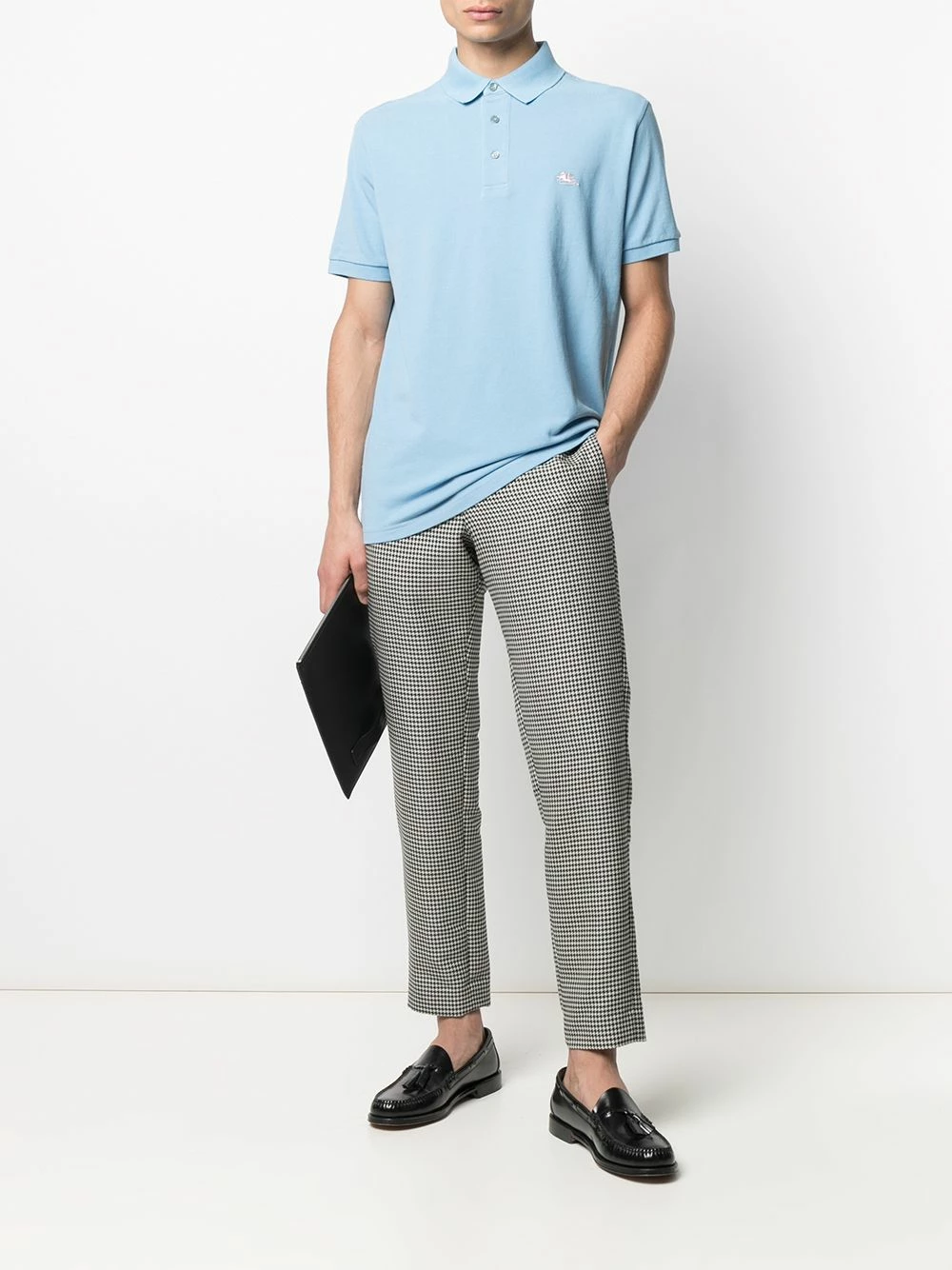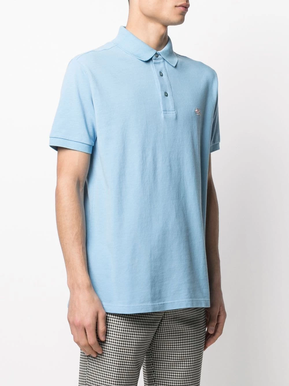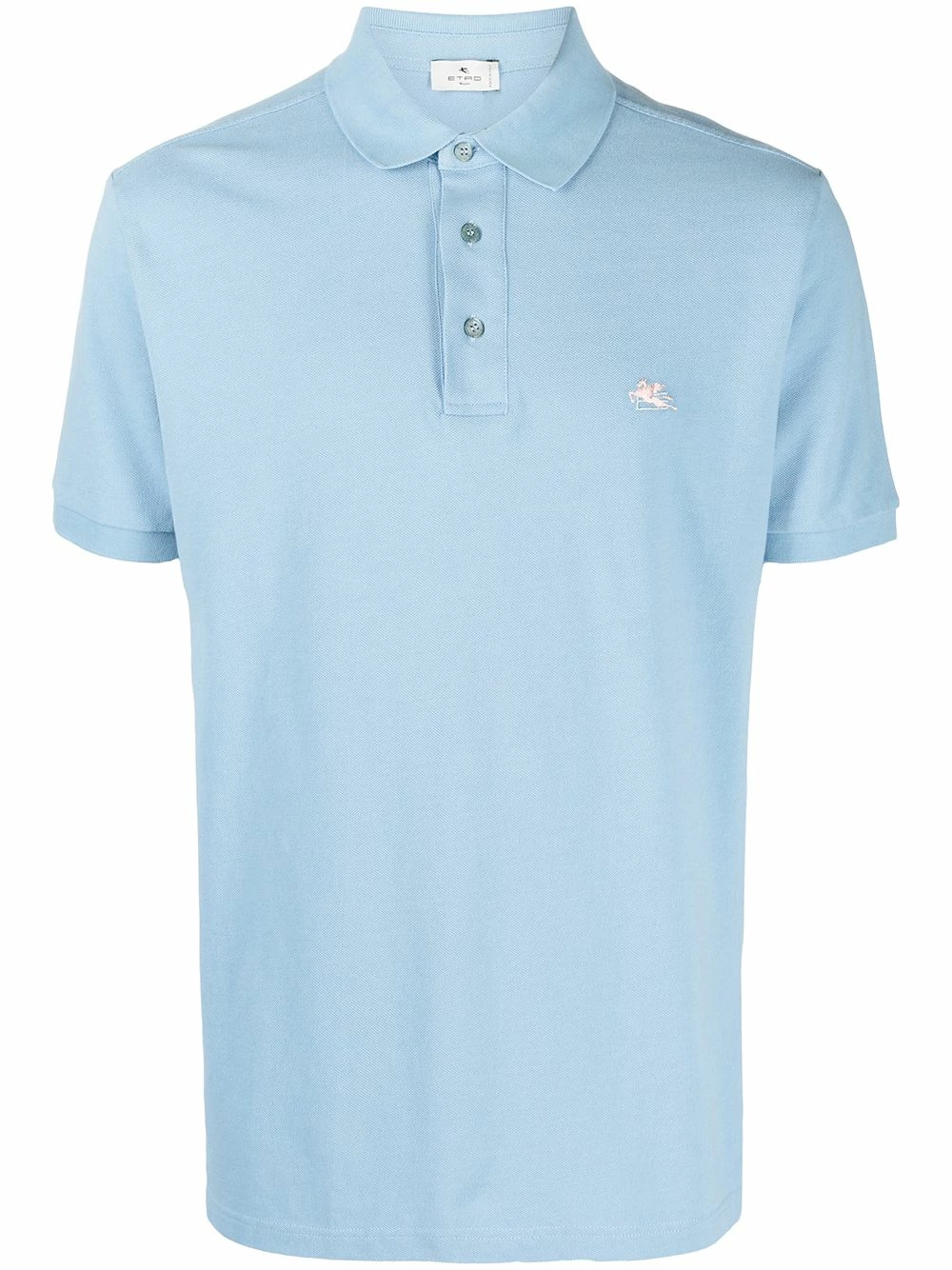 Col polo, boutonnière sur le devant, manches courtes, logo brodée sur la poitrine. Couleur : bleu. Matière : coton.
