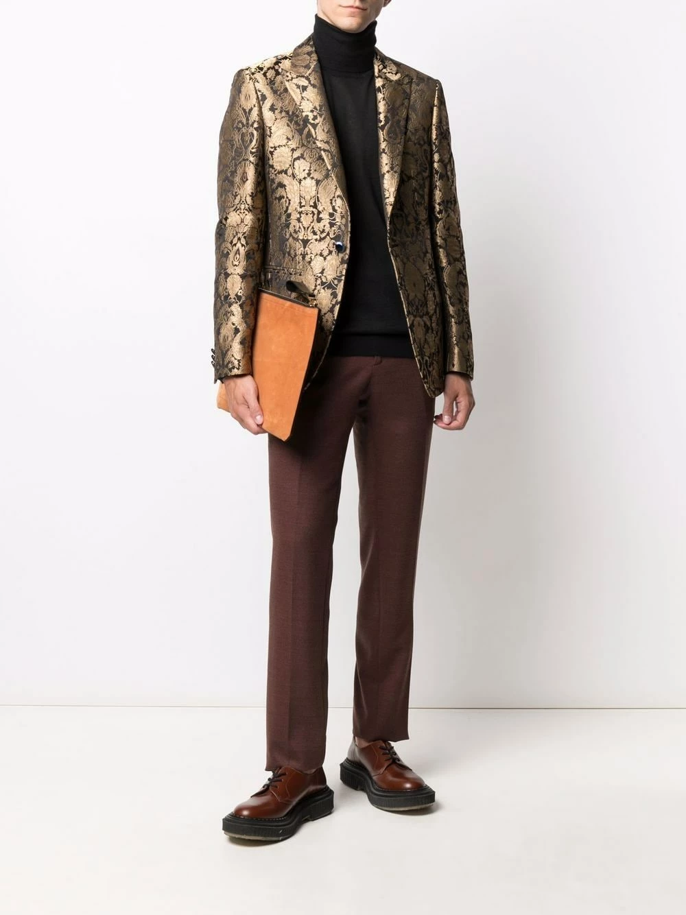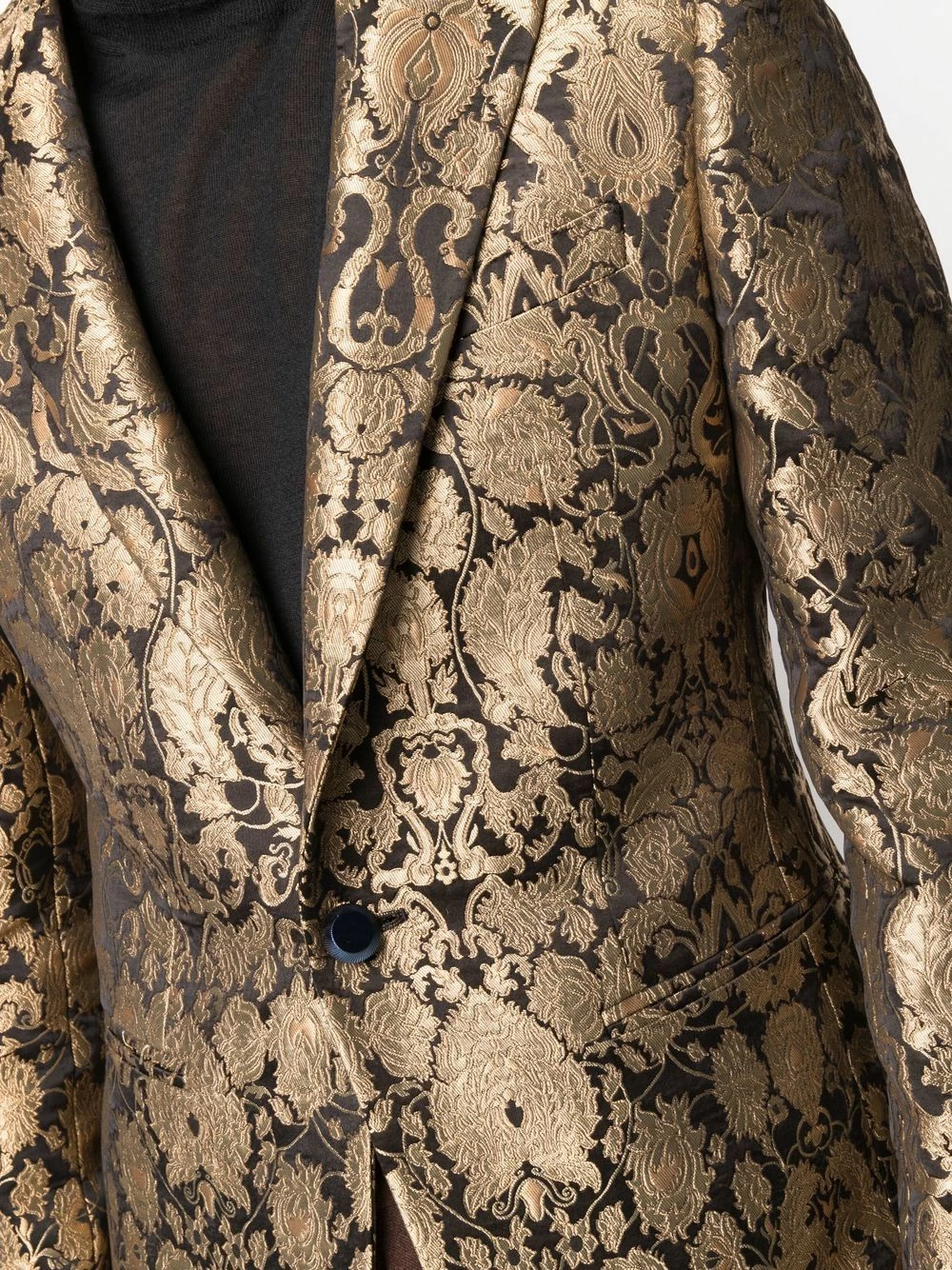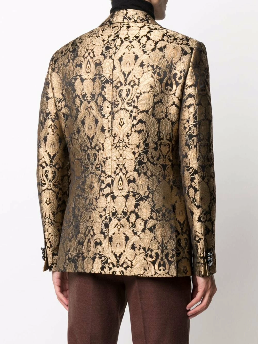 Jacquard à motifs, tissage métallisé, revers pointus, boutonnière sur le devant, manches longues, poignets boutonnés, poche passepoilée sur la poitrine, deux poches latérales fendues, double fente arrière.