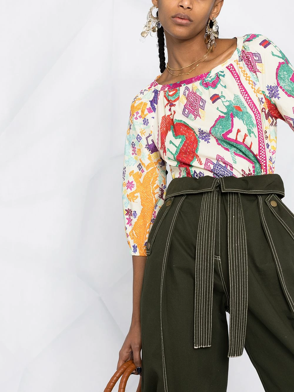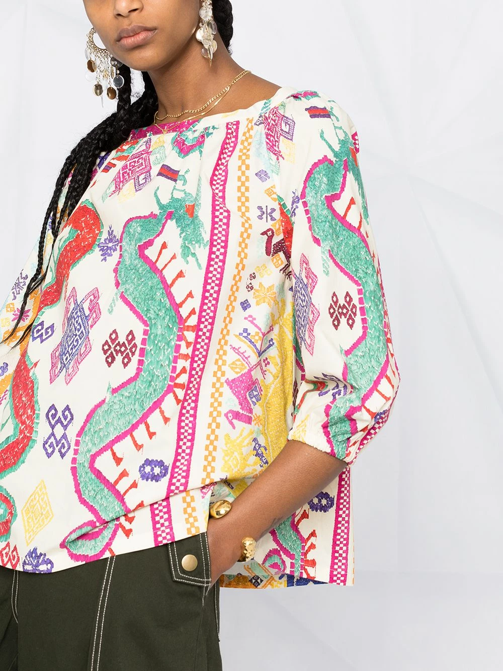 Imprimé graphique, encolure ronde, manches trois-quarts, ourlet droit. Matière : coton.