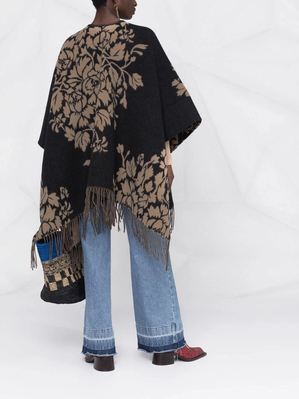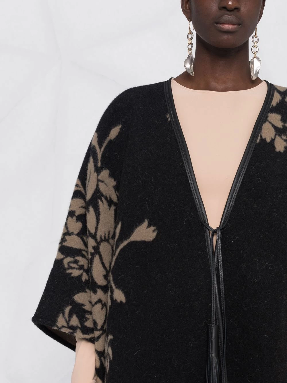 Col v, détail de pompon, fermeture à nouer sur le devant, manches mi-longues, bordure à franges. Couleur : noir.
