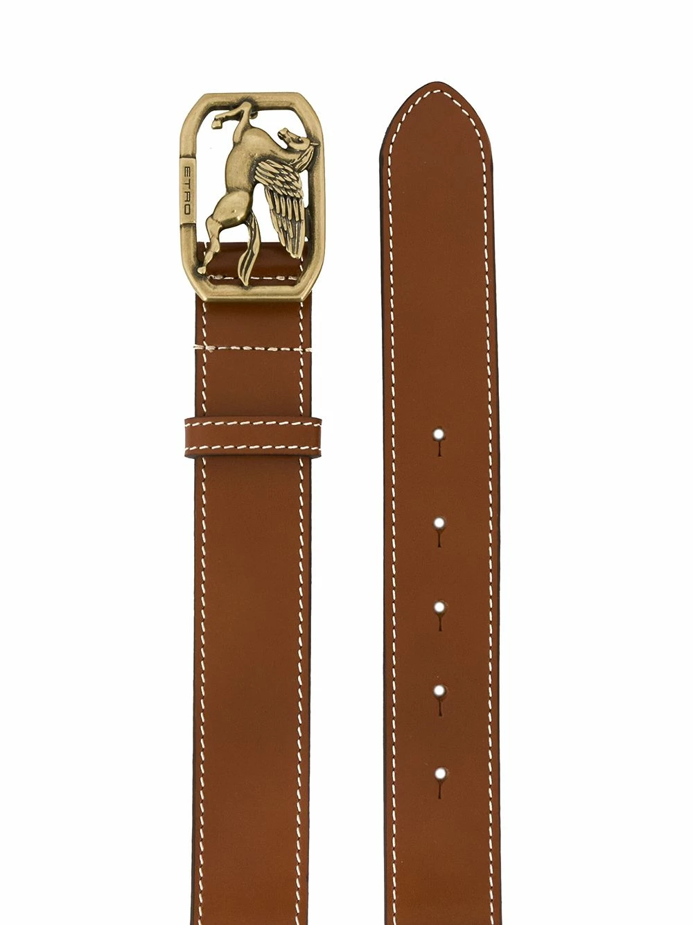Ceinture à boucle Pegasus en cuir de veau Etro avec fermeture à boucle sur le devant, finitions dorées, détails perforés et taille ajustable. Couleur : marron.