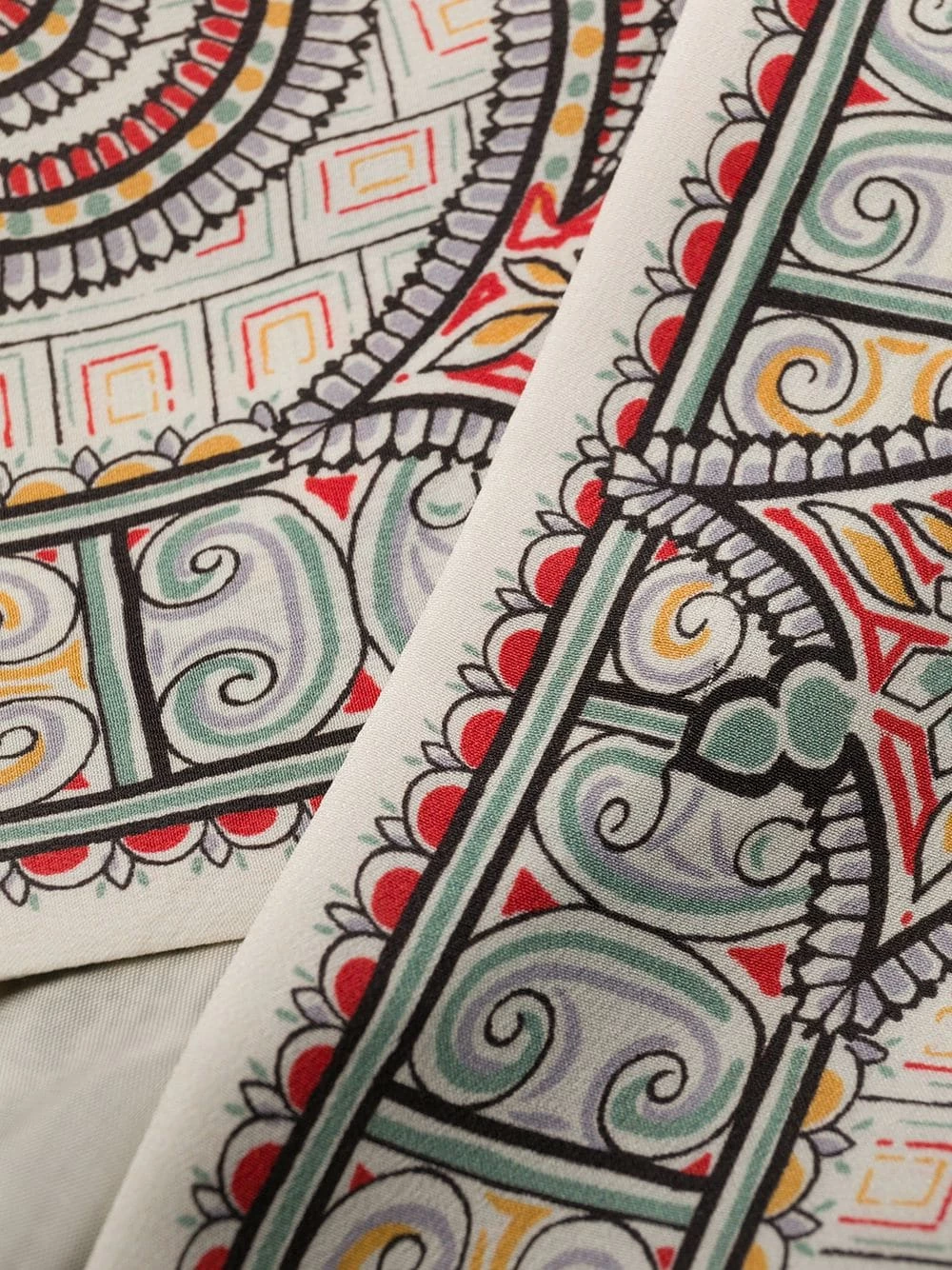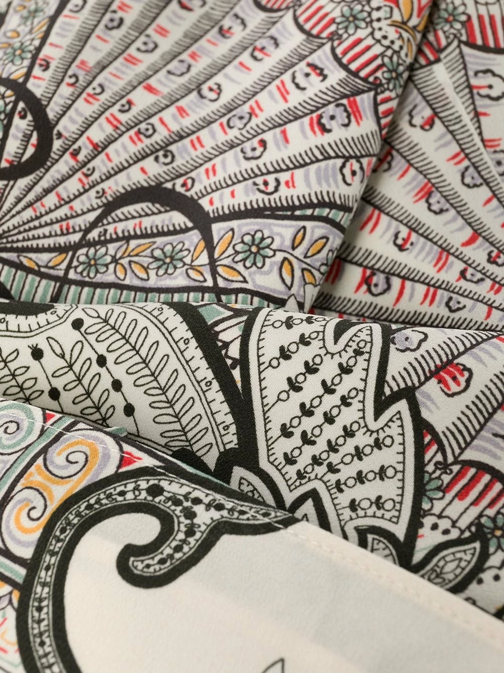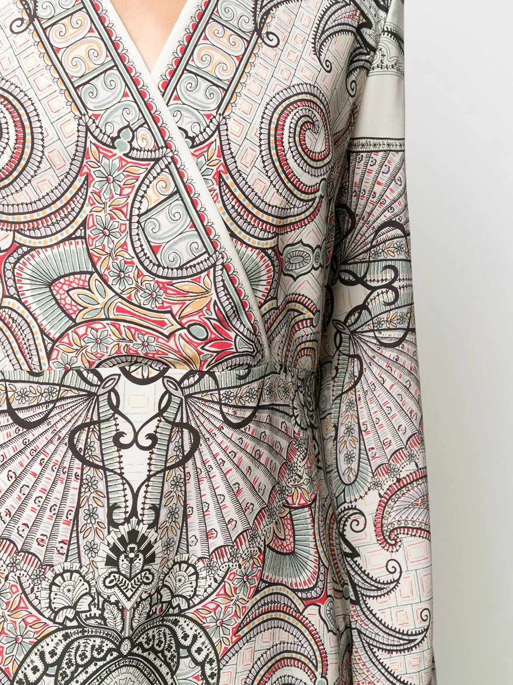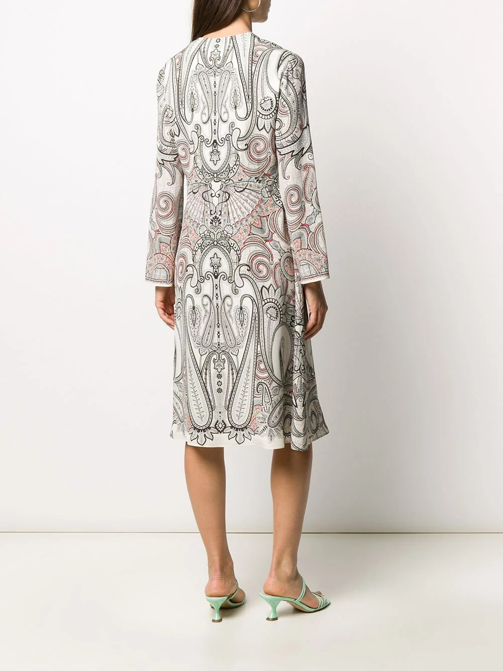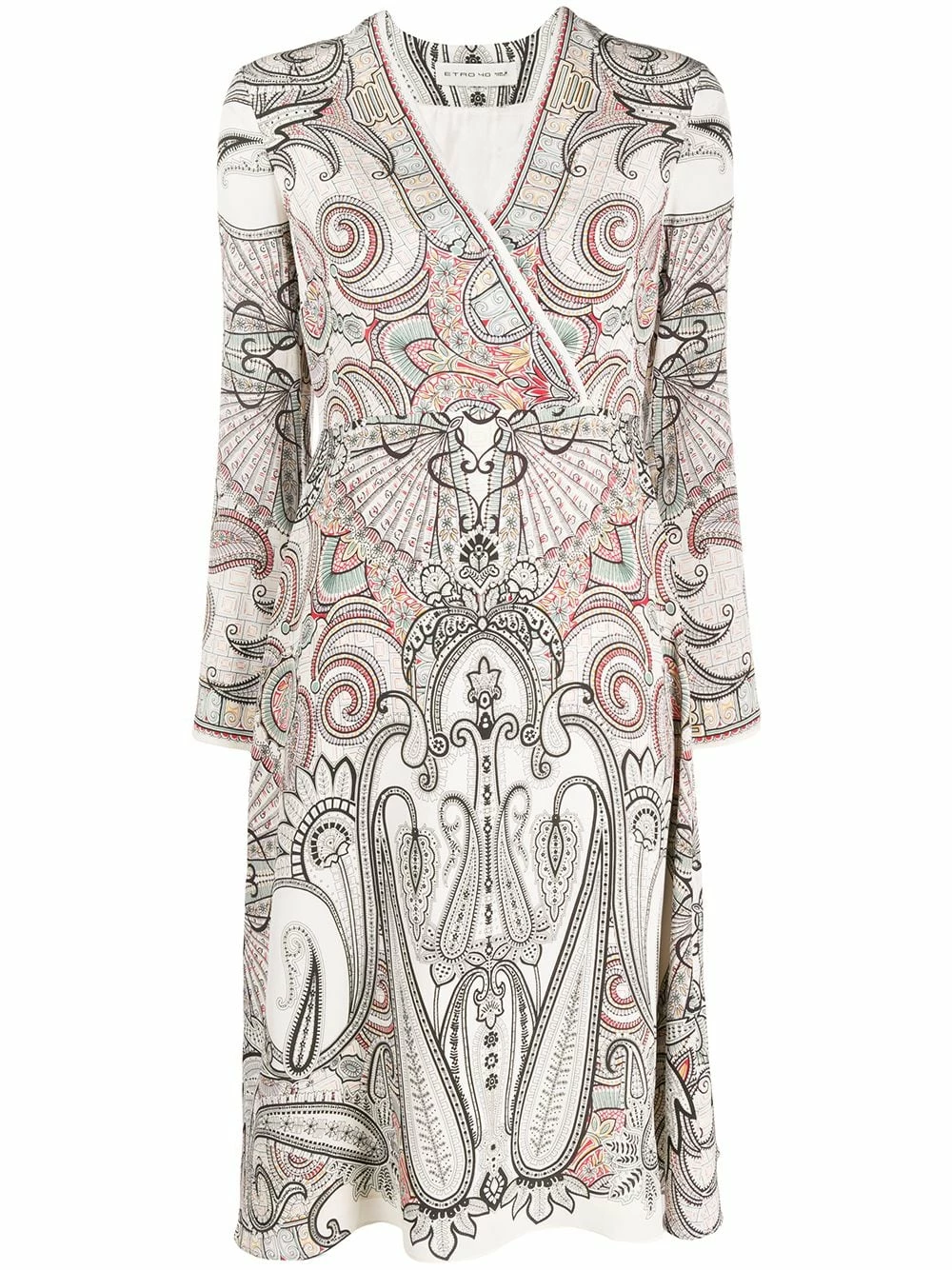 Robe mi-longue à motif cachemire Etro avec motif cachemire, devant à effet portefeuille, col v, manches longues et taille ajusté. Couleur : tons neutres.