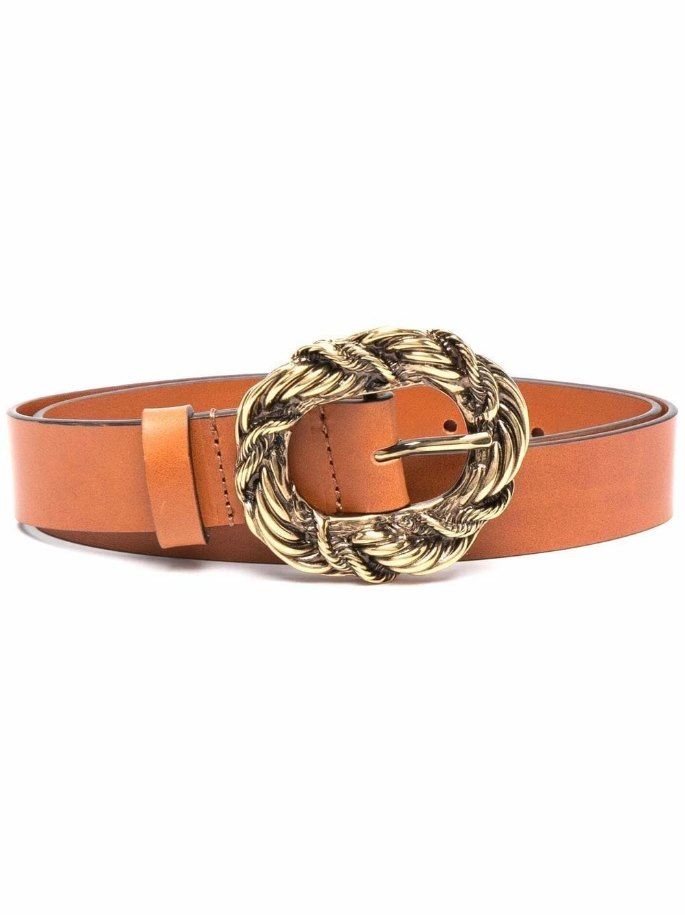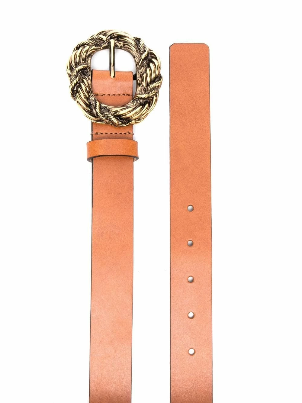 Détail de boucle décorative, trous percés, taille ajustable. Couleur : orange. Matière : cuir.