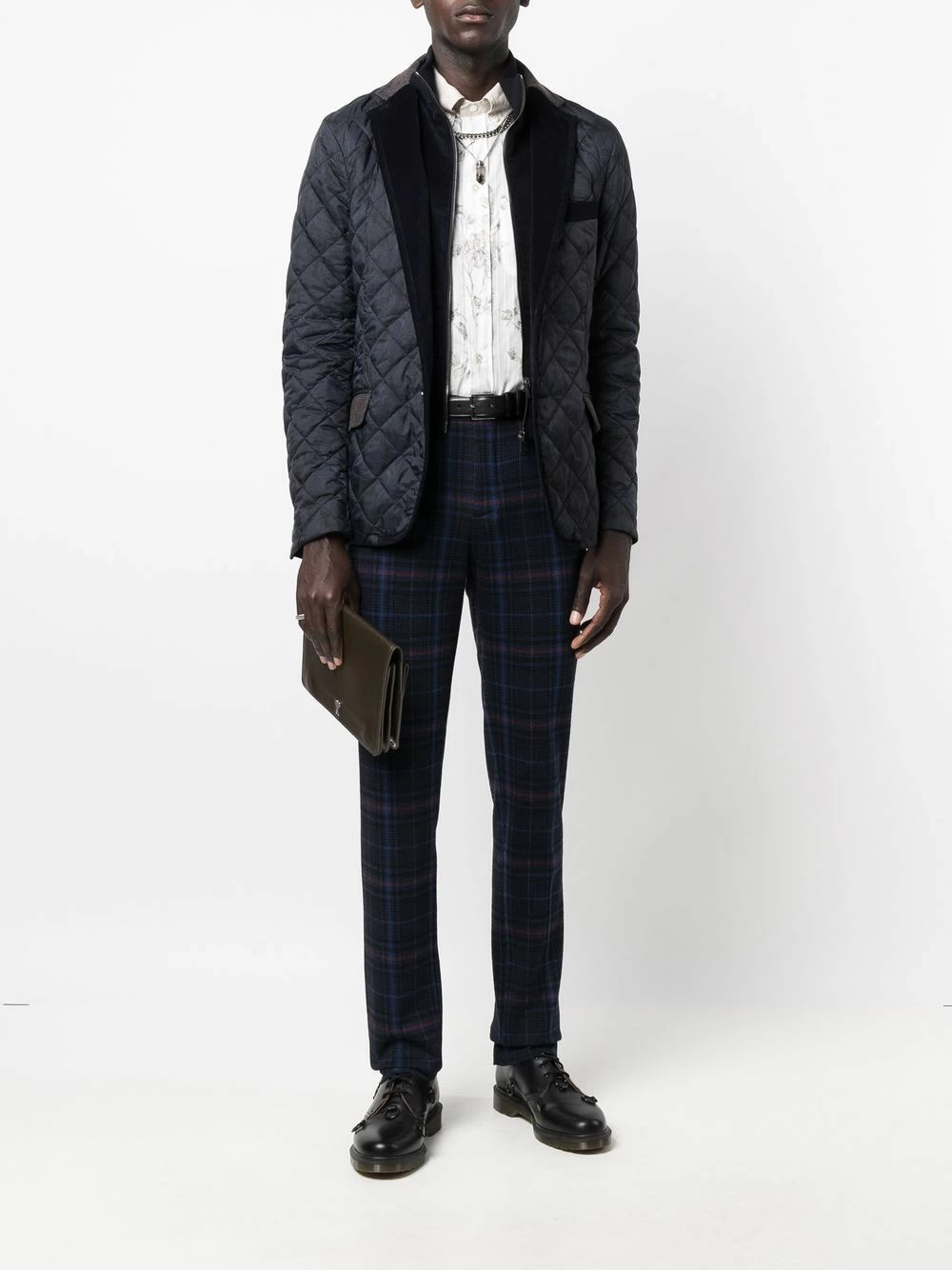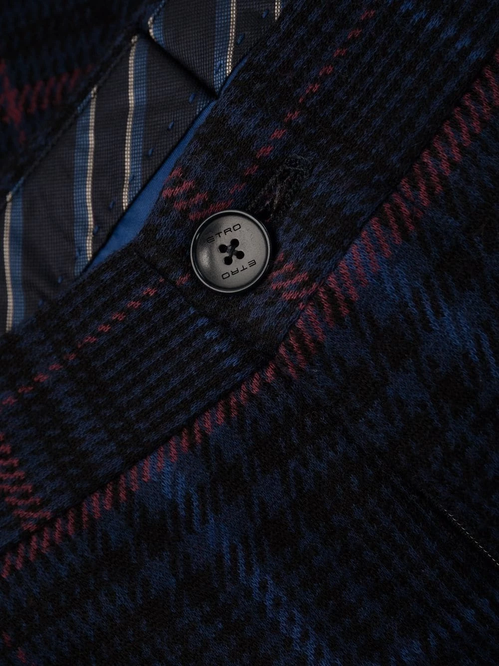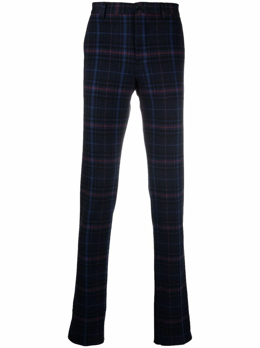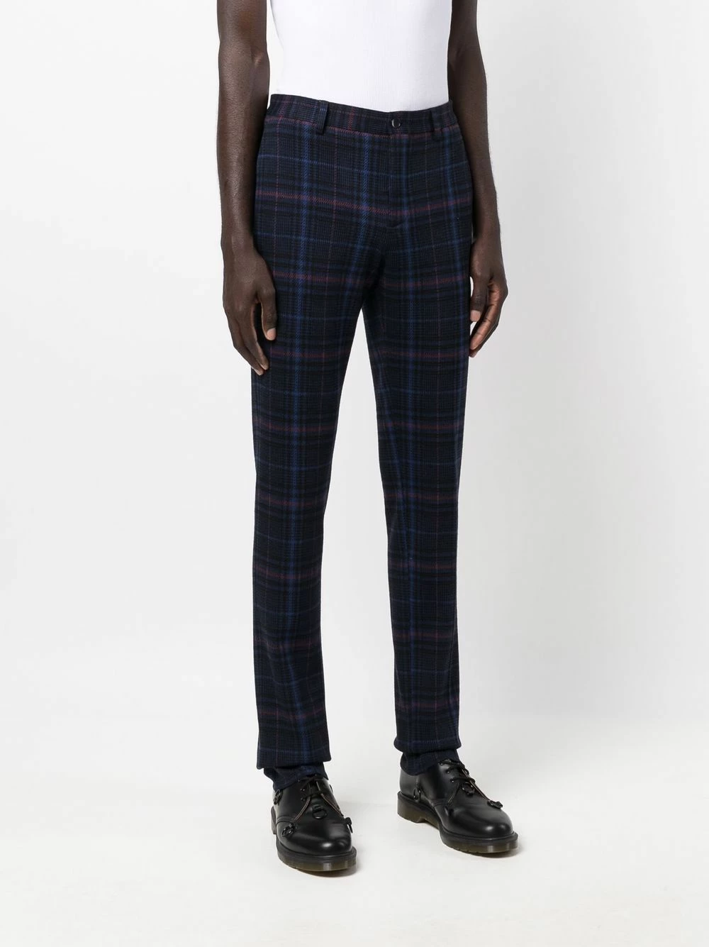 Carreaux, passants de ceinture, fermeture à zip et boutons sur le devant, poches latérales fendues, deux poches arrières boutonnées.
