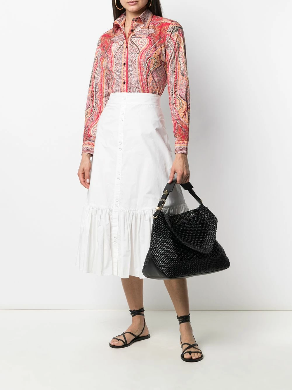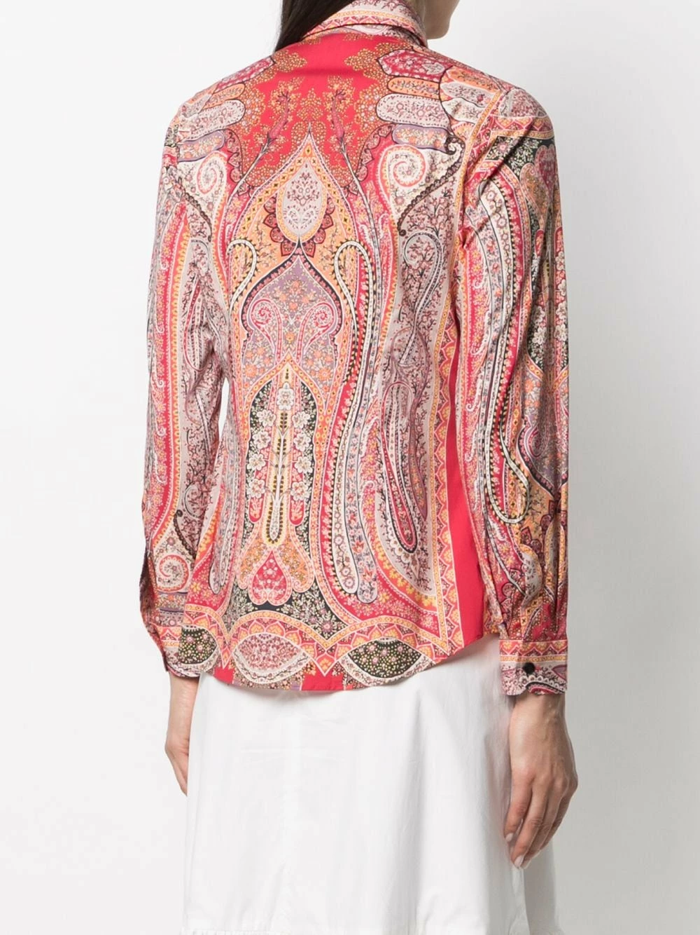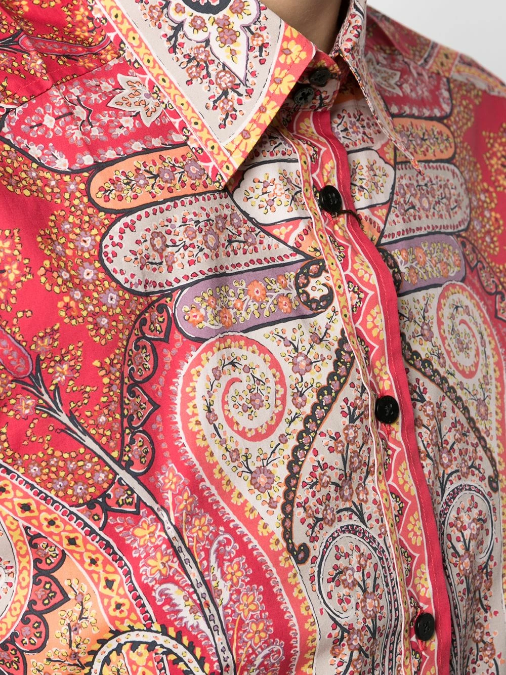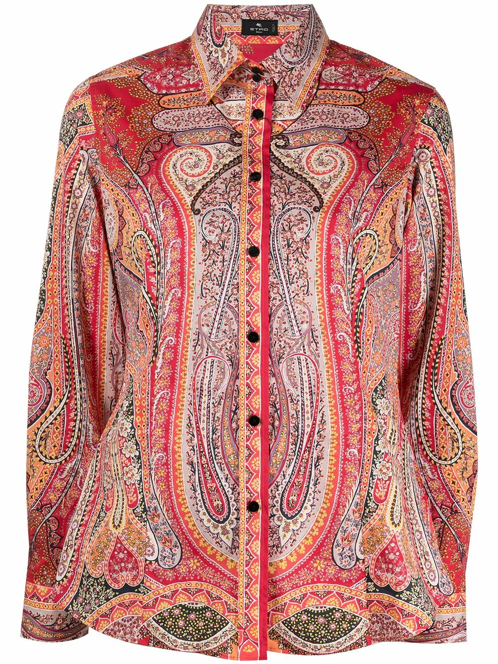 Motif cachemire, col pointu, boutonnière sur le devant, manches longues, poignets boutonnés.