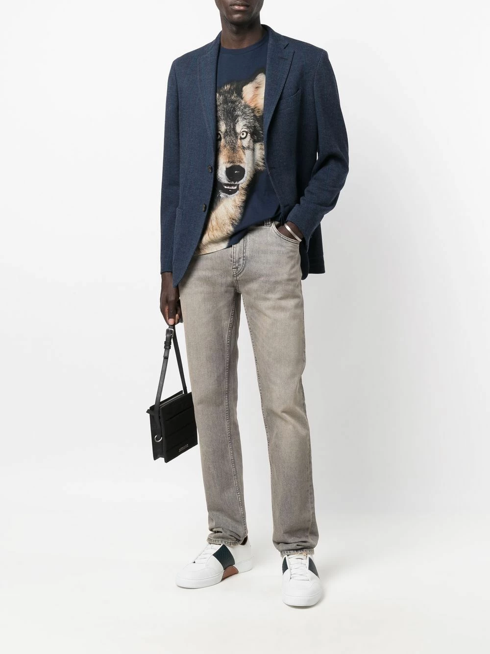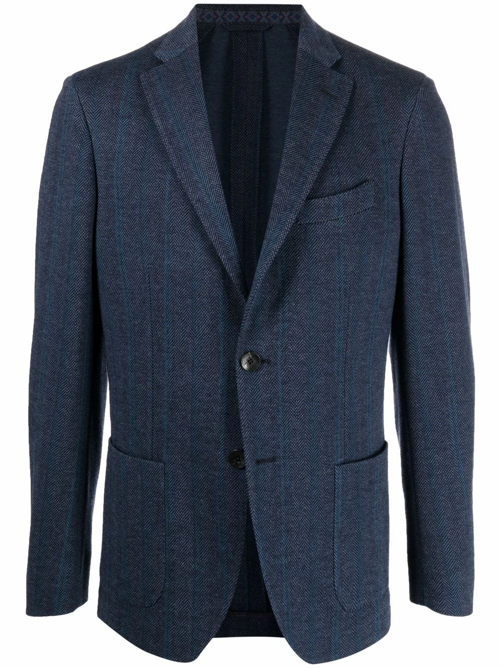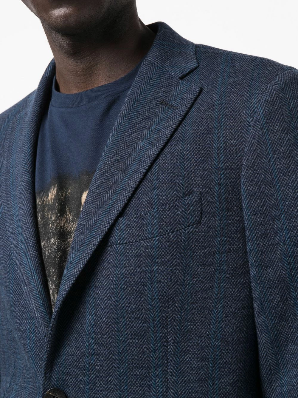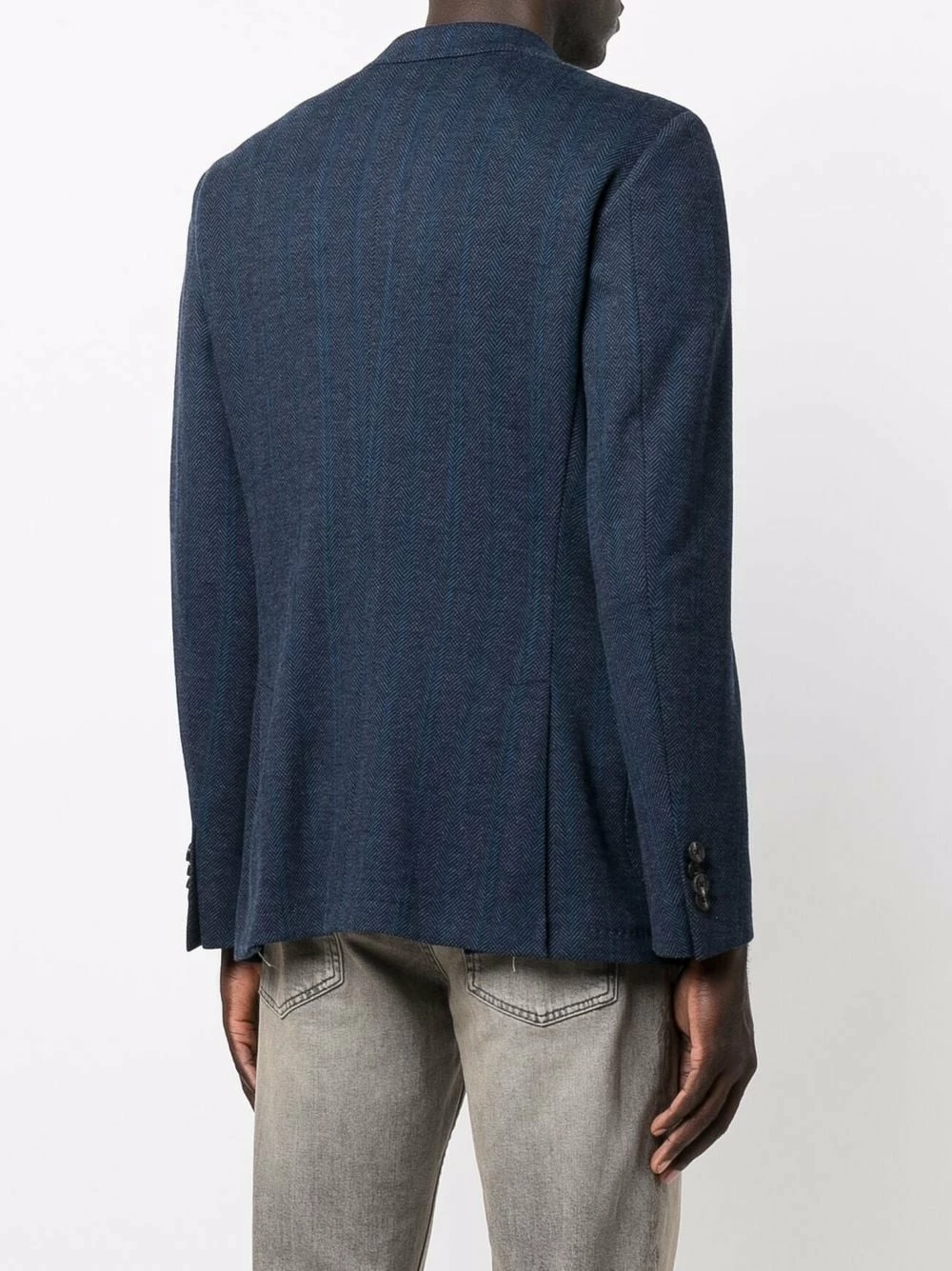 Rayures verticales, revers crantés, boutonnière sur le devant, manches longues, poche passepoilée sur la poitrine, deux poches latérales plaquées, double fente arrière.