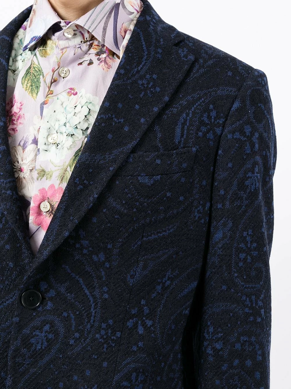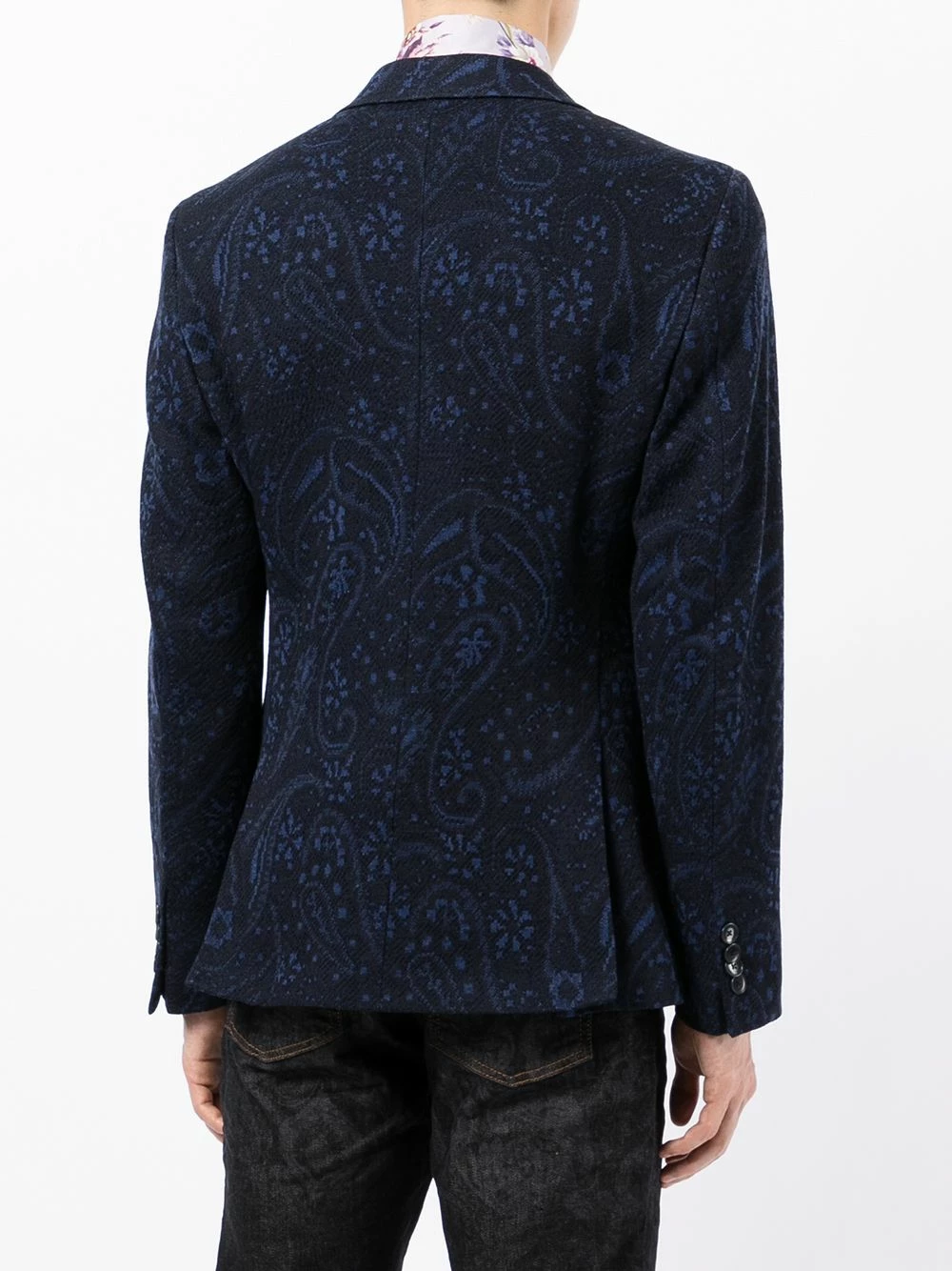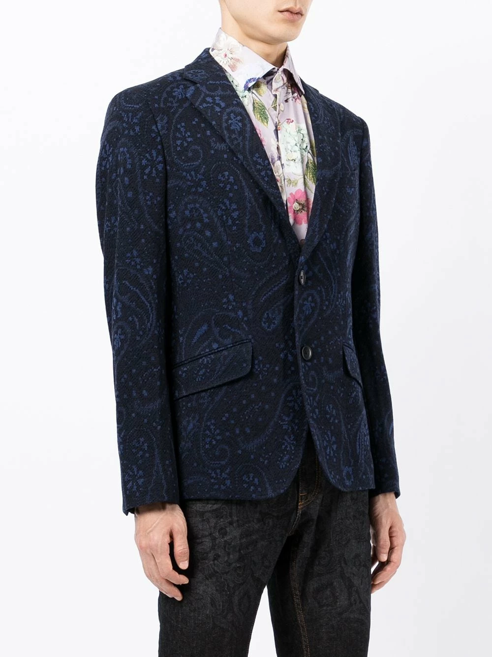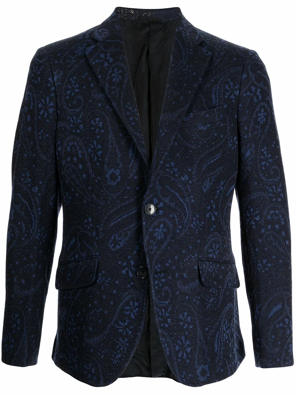 Revers crantés, boutonnière sur le devant, manches longues, poche poitrine passepoilée, deux poches à rabat sur le devant, double fente arrière. Matière : laine.