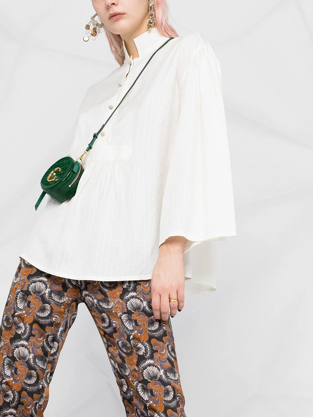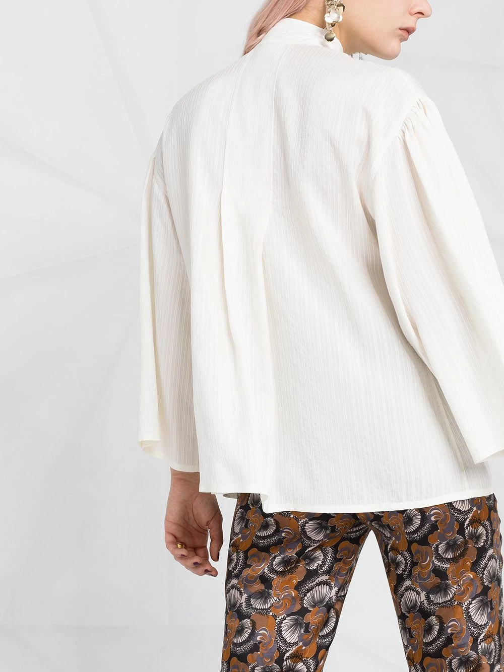 Col classique, boutonnière sur le devant, effet d’épaules descendues, manches crop, détails de plis, détail de plis creux, coutures ton sur ton, ourlet incurvé. Couleur : Blanc. Matière : soie.