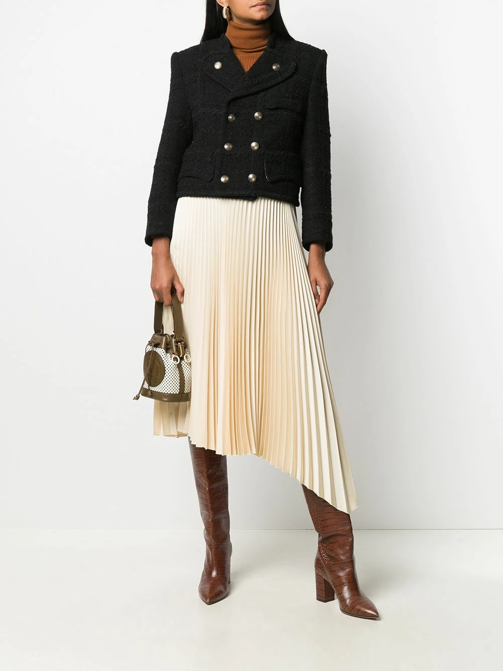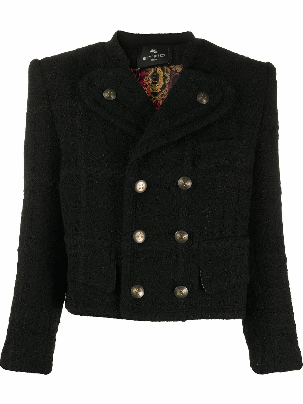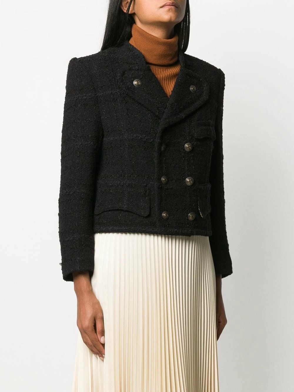 Tweed, poches devant à rabat, design sans col, revers crantés, manches trois-quarts, boutonnière croisée, coupe courte. Couleur : noir.