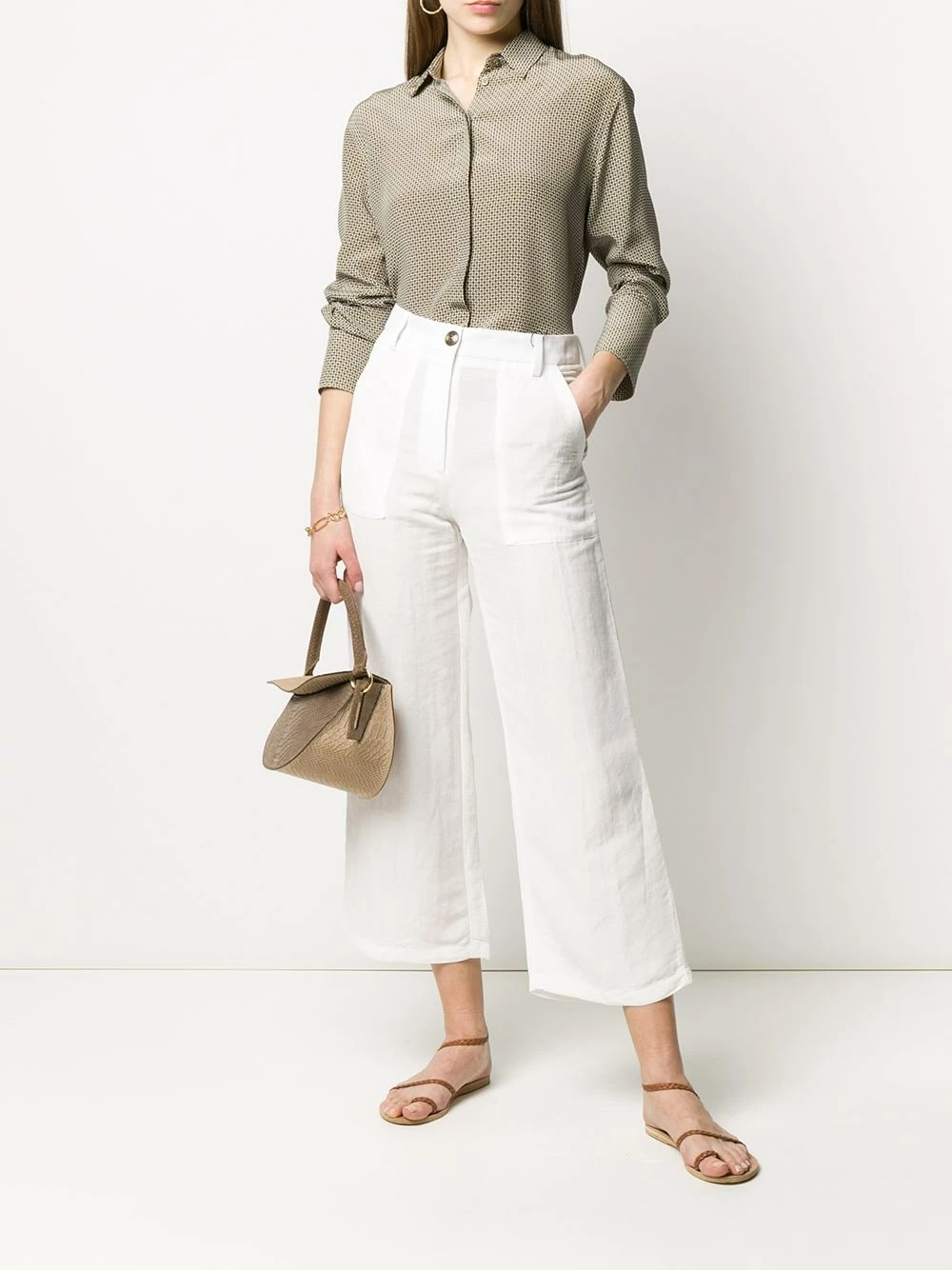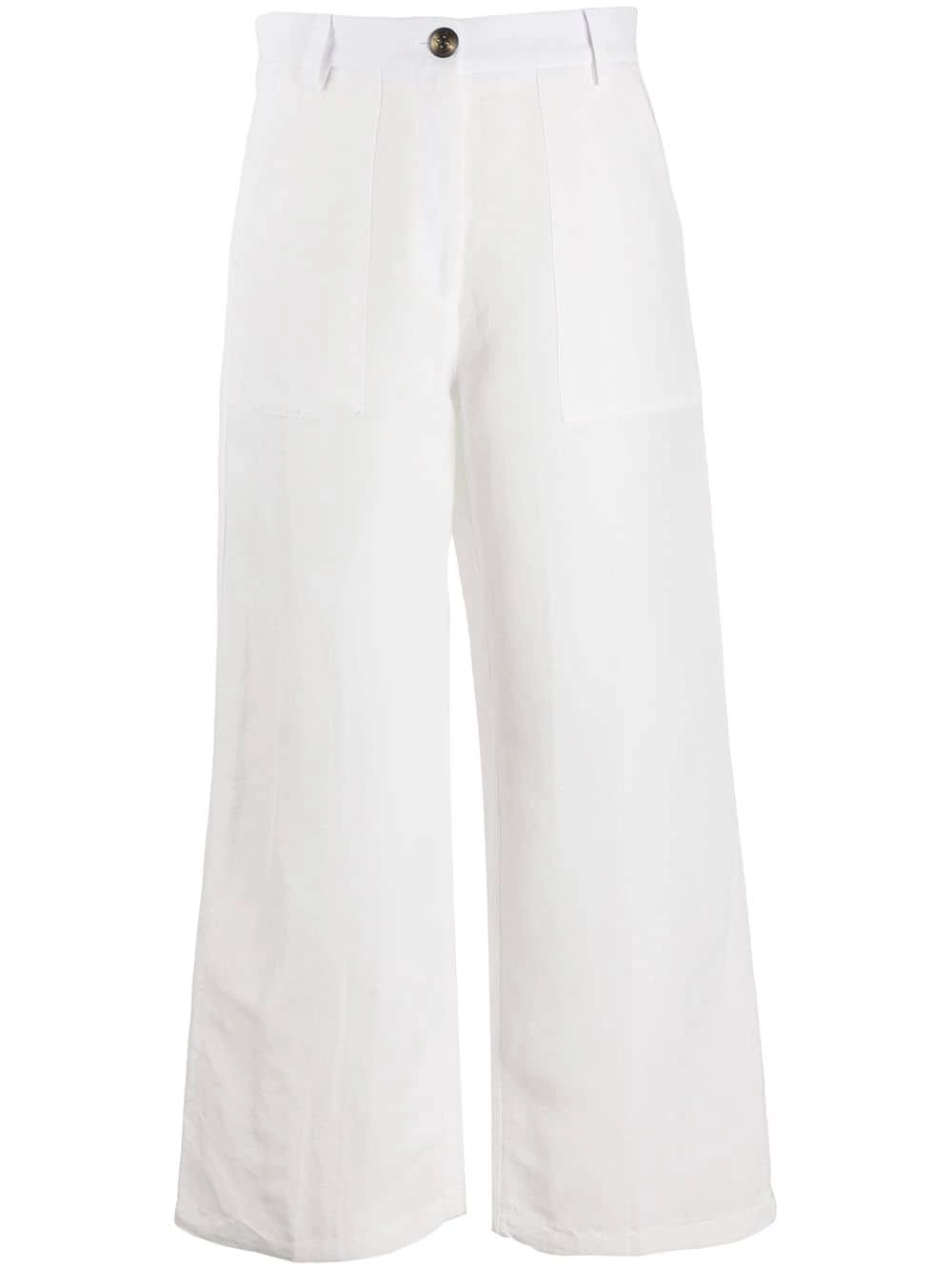 Pantalon crop à taille haute Etro avec bouton et zip, passants de ceinture à la taille, poches latérales, poches arrière et coupe ample. Couleur : blanc.