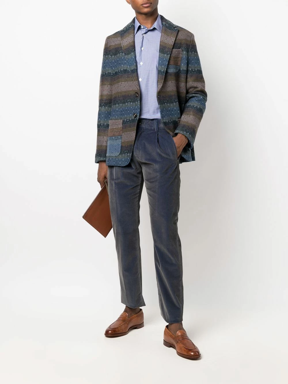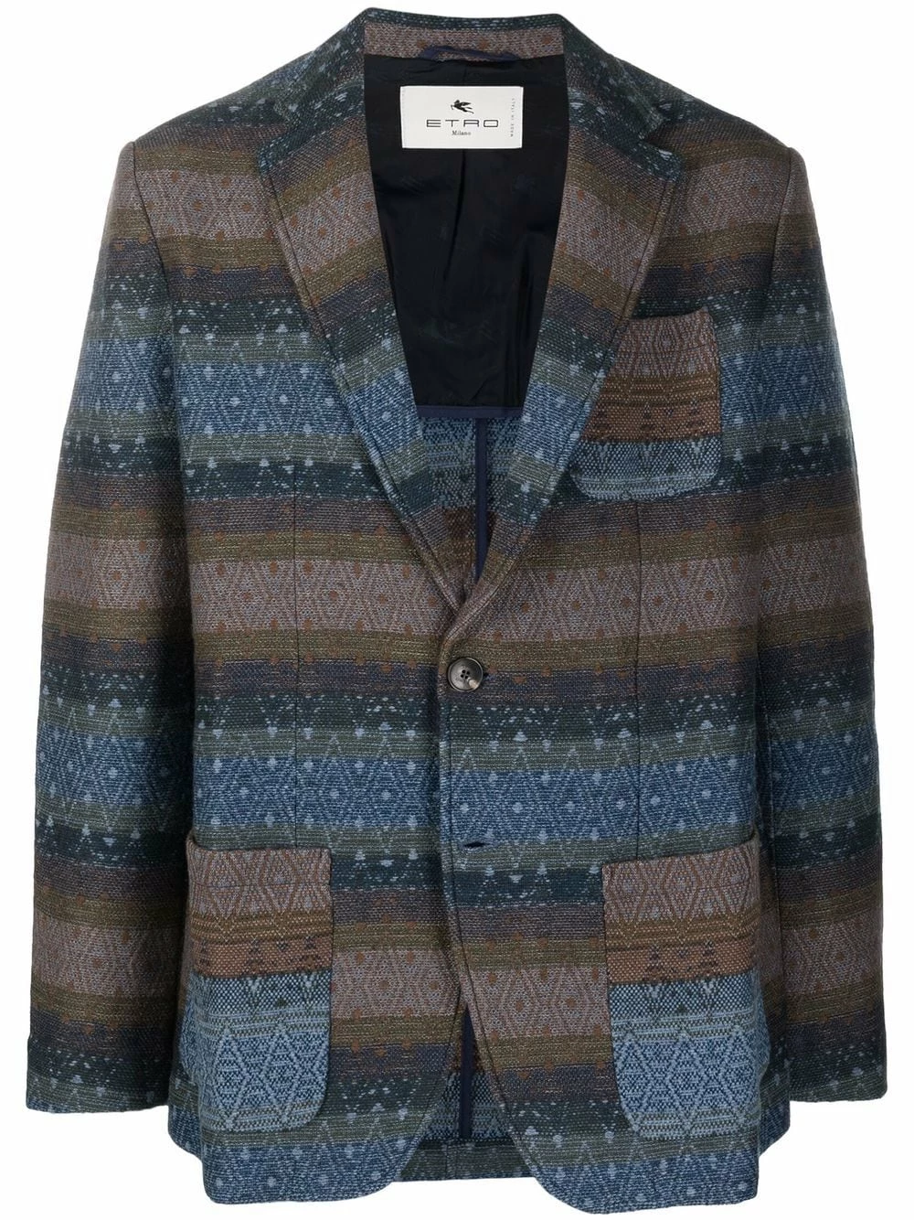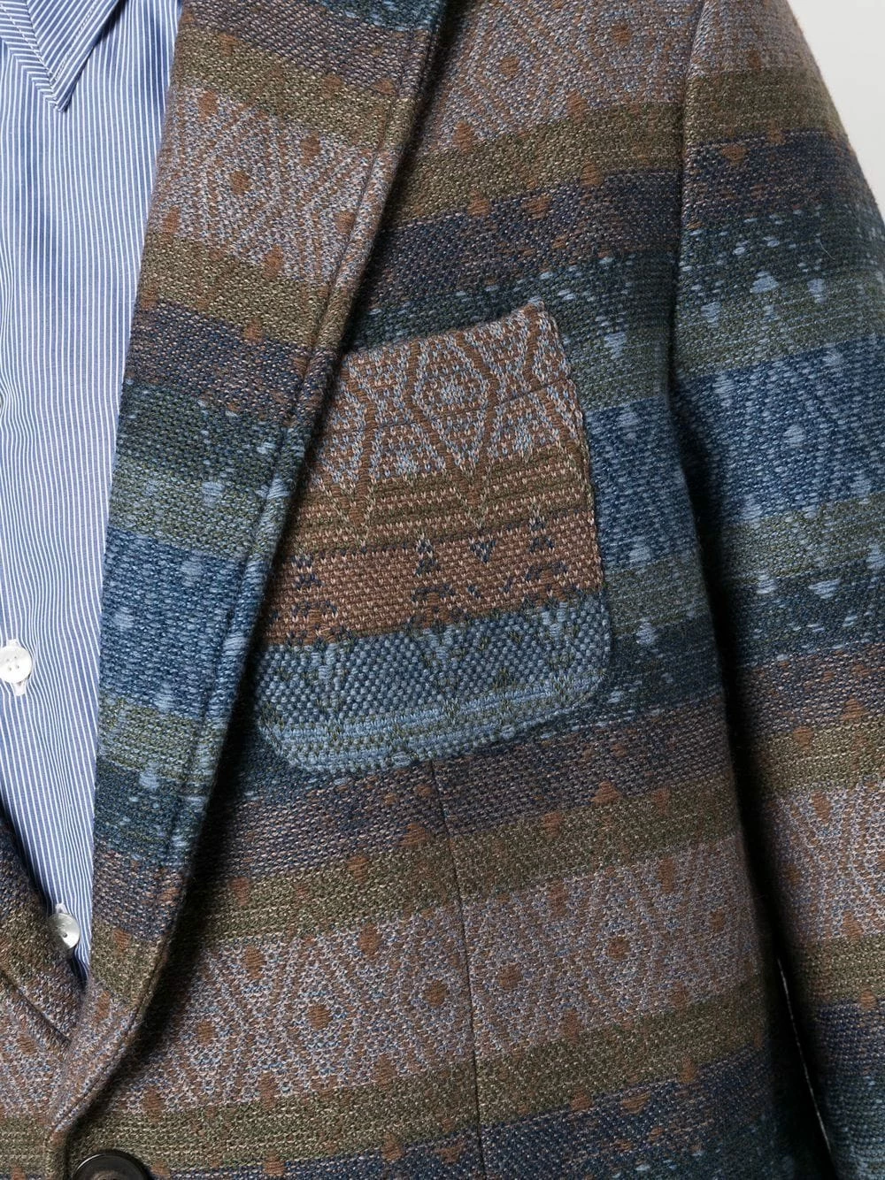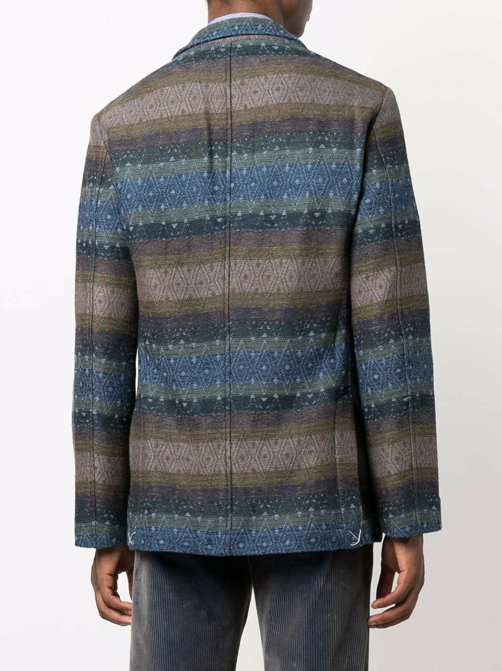 Broderies géométrique, design tissé, boutonnière sur le devant, manches longues, trois poches plaquées sur le devant.