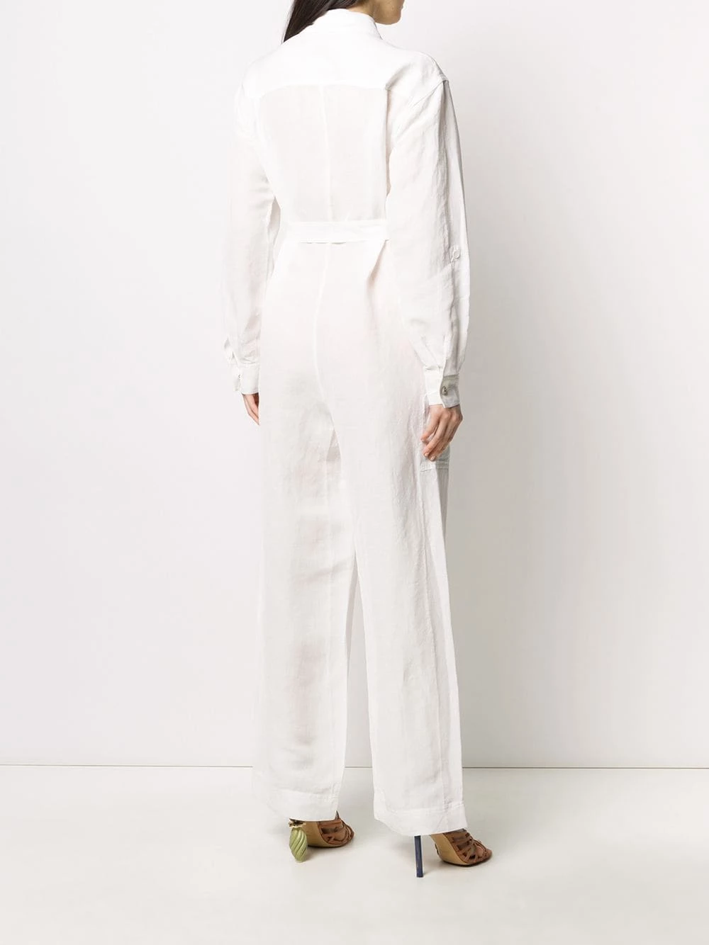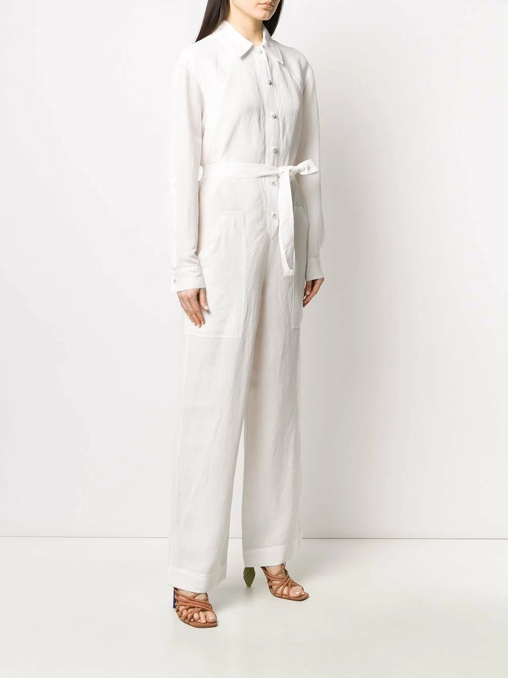Combinaison boutonnée à col italien Etro avec col classique, boutonnière sur le devant, taille ceinturée, manches longues, poches latérales, coupe ample et coupe longue. Couleur : blanc.