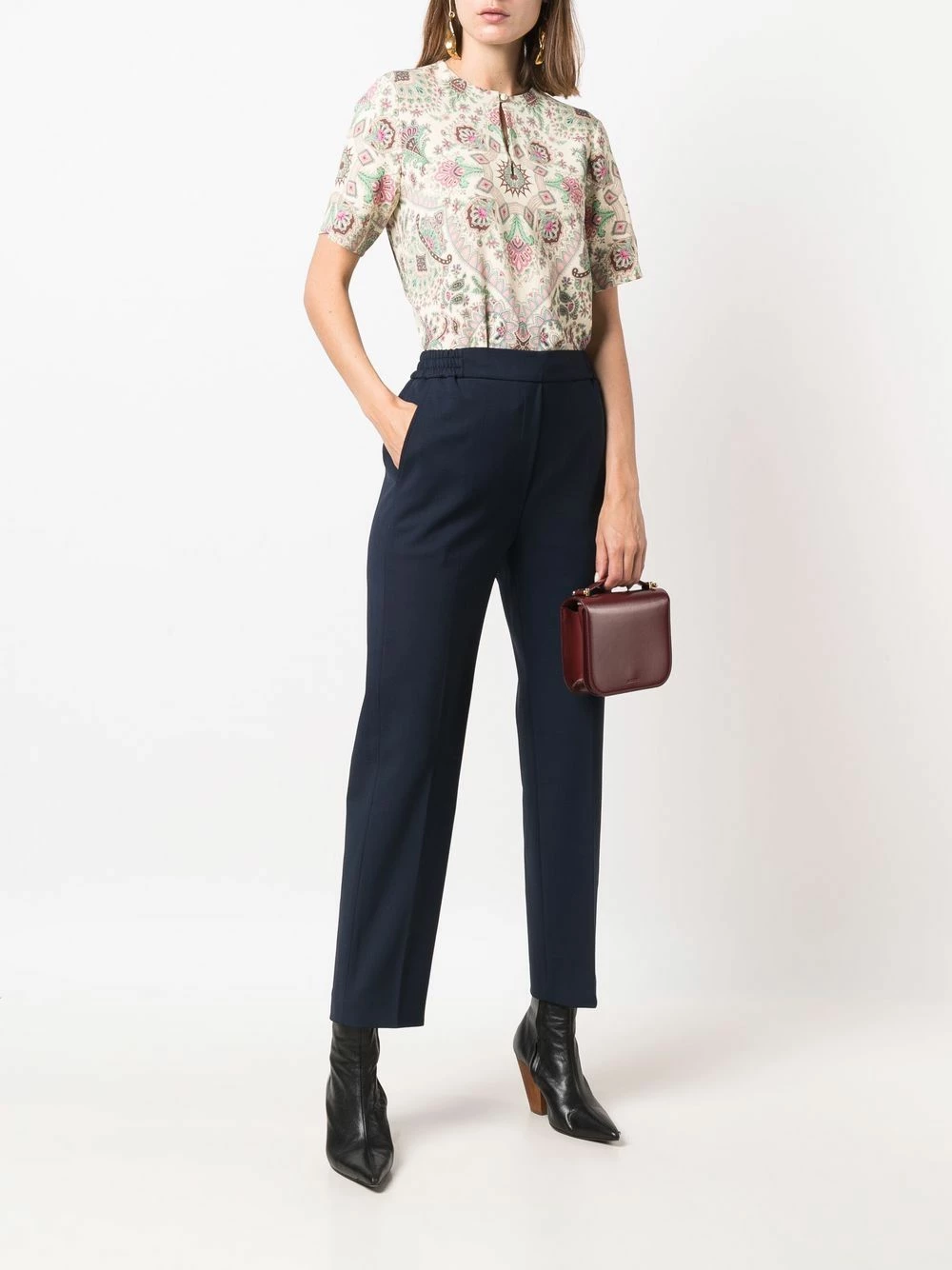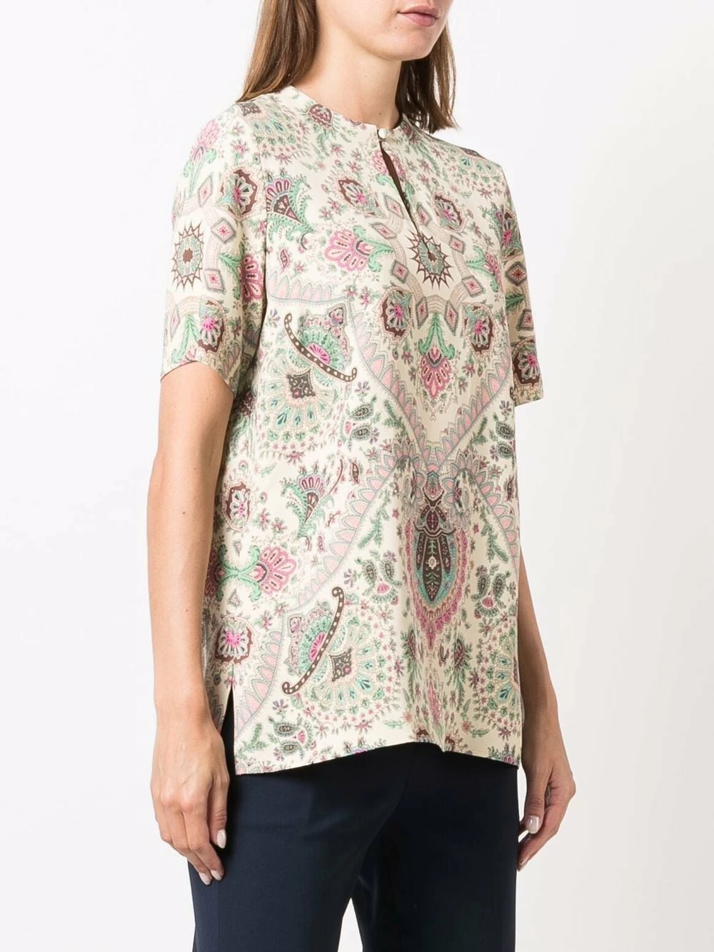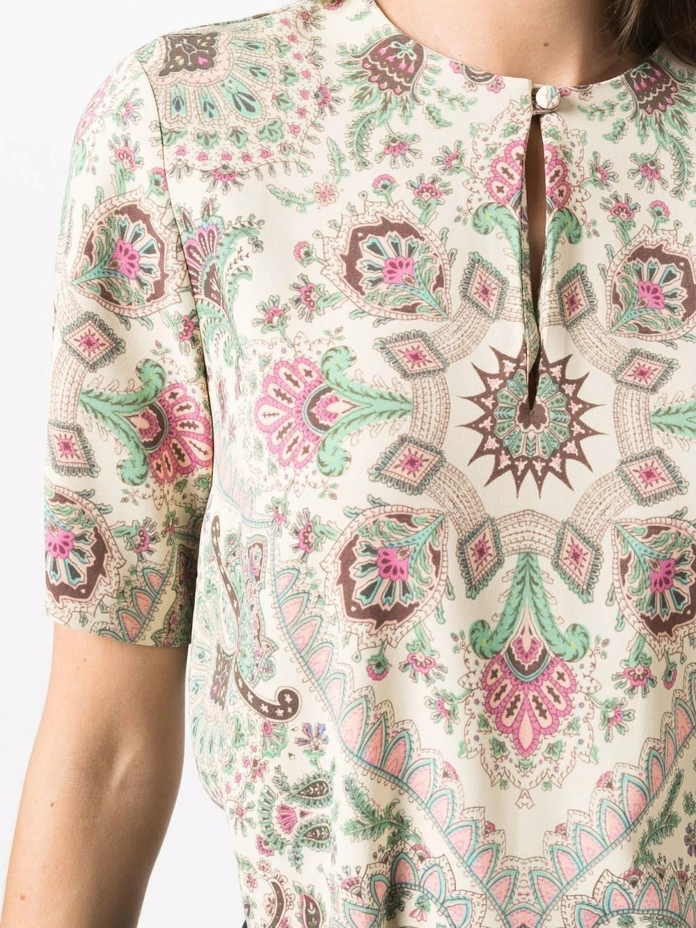 Motif cachemire, col à ouverture goutte d’eau, manches courtes. Couleur : tons neutres.