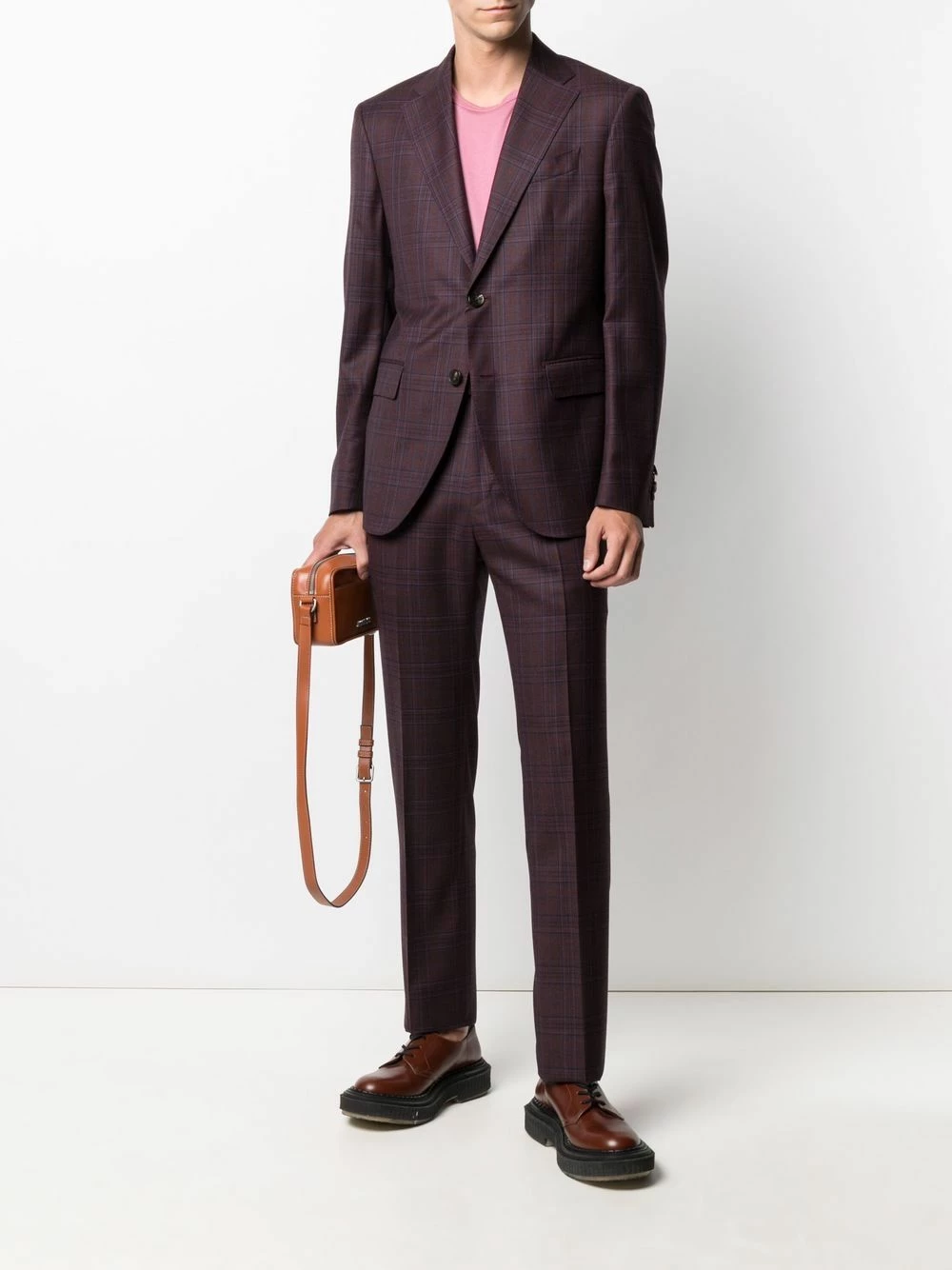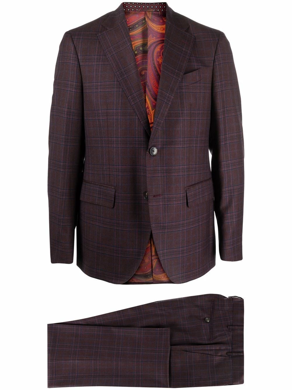 Carreaux, pinces, revers crantés, poche passepoilée sur la poitrine, boutonnière sur le devant, poches devant à rabat, manches longues, plis marqués, poches latérales fendues, passants de ceinture, deux poches arrières boutonnées. Couleur : violet. Matière : laine.