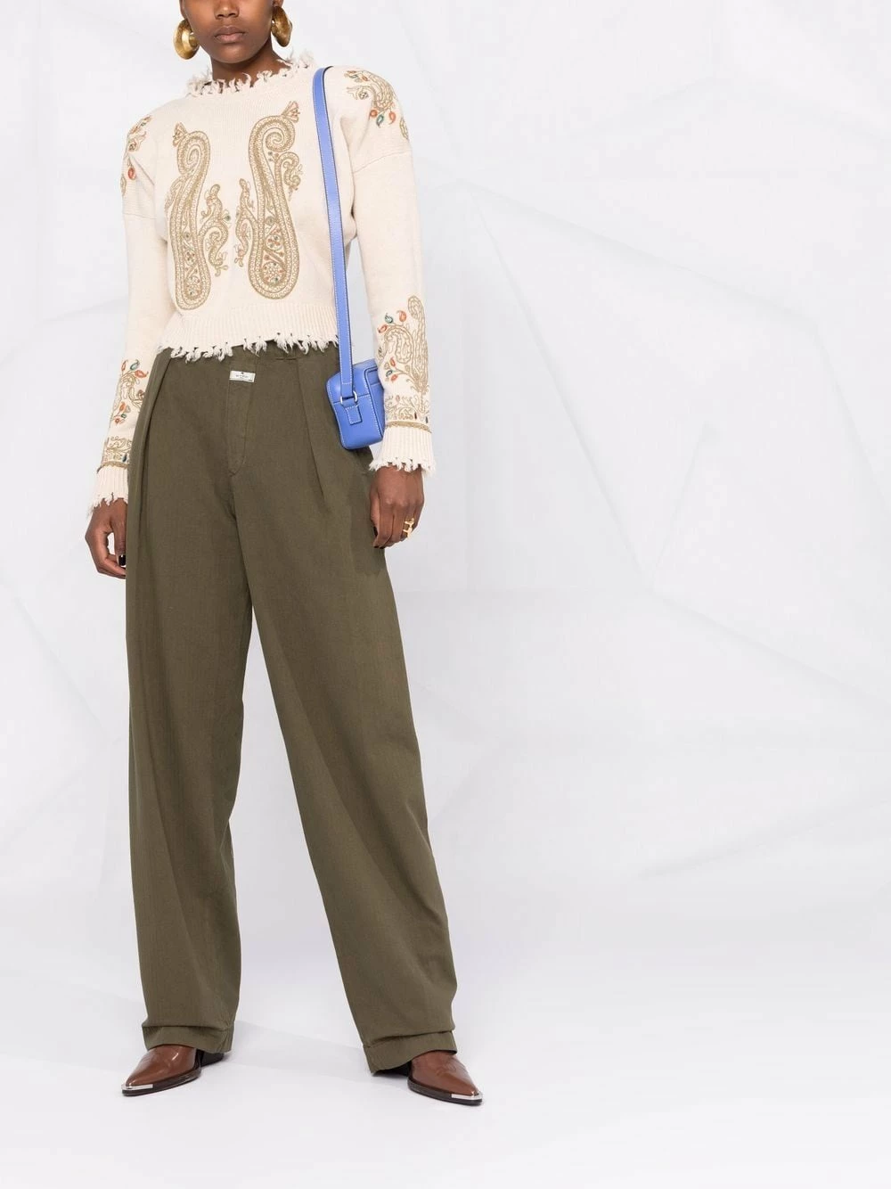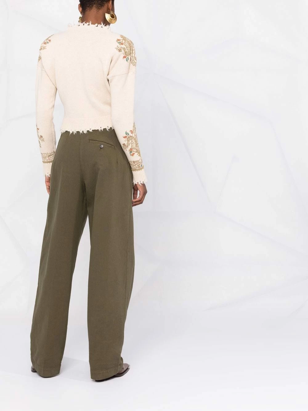 Broderies, bords frangés, encolure ronde, col montant nervuré, manches longues, poignets nervurés, ourlet nervuré, coupe courte. Couleur : tons neutres. Matière : laine vierge.