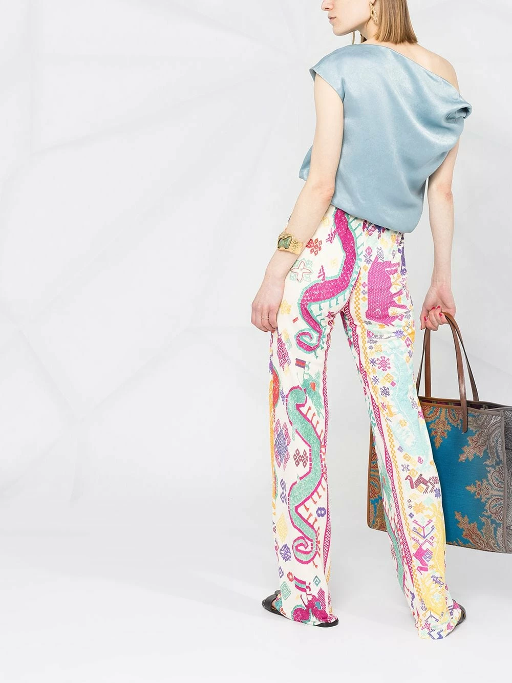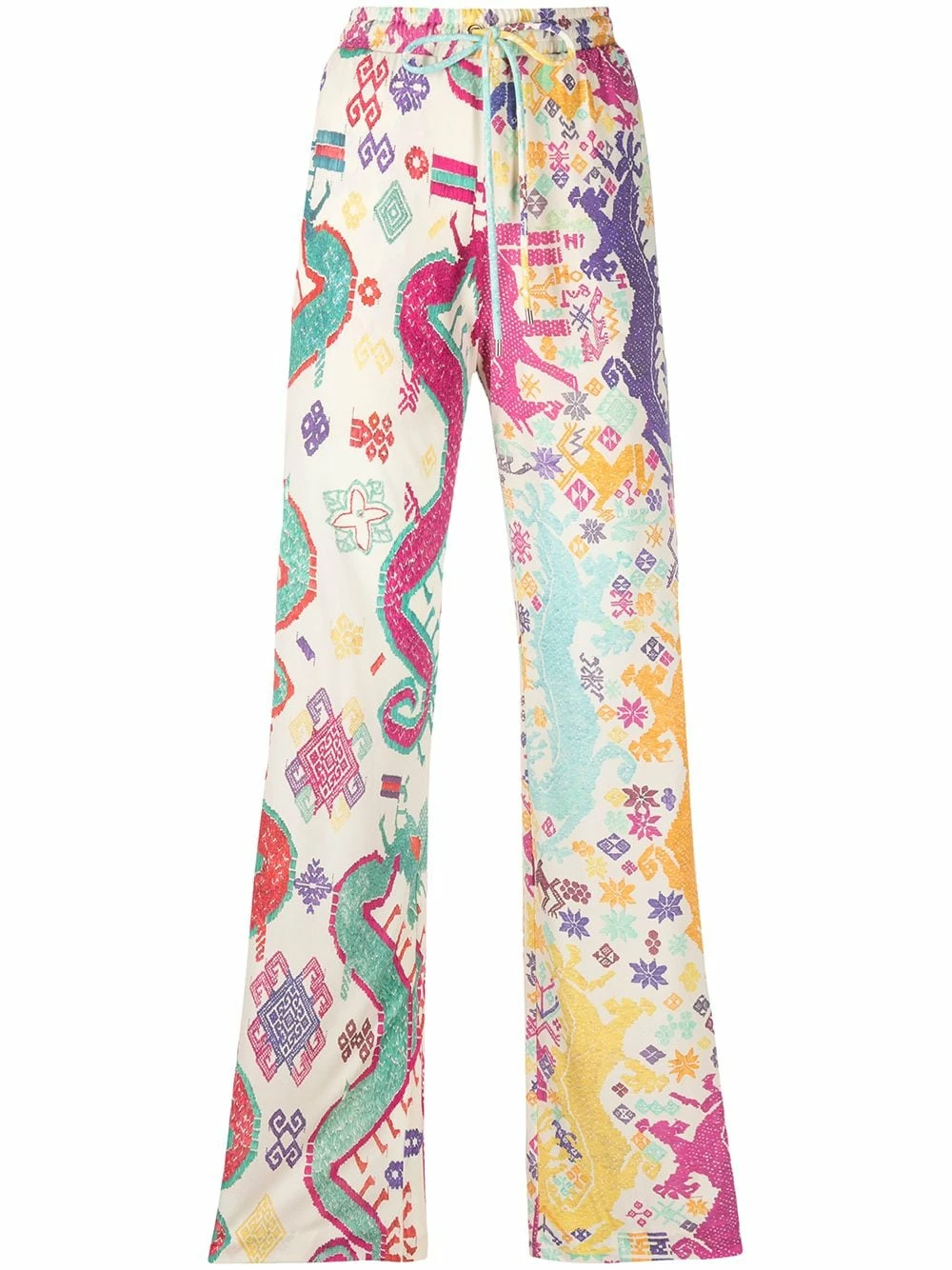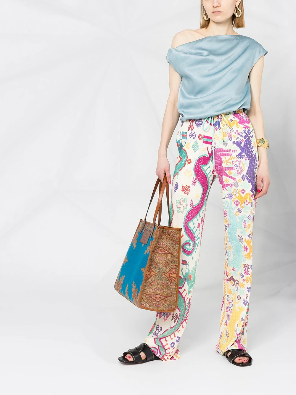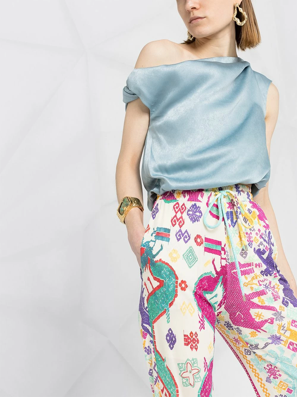 Motif géométrique, deux poches latérales passepoilées, lien de resserrage à la taille, coupe ample.
